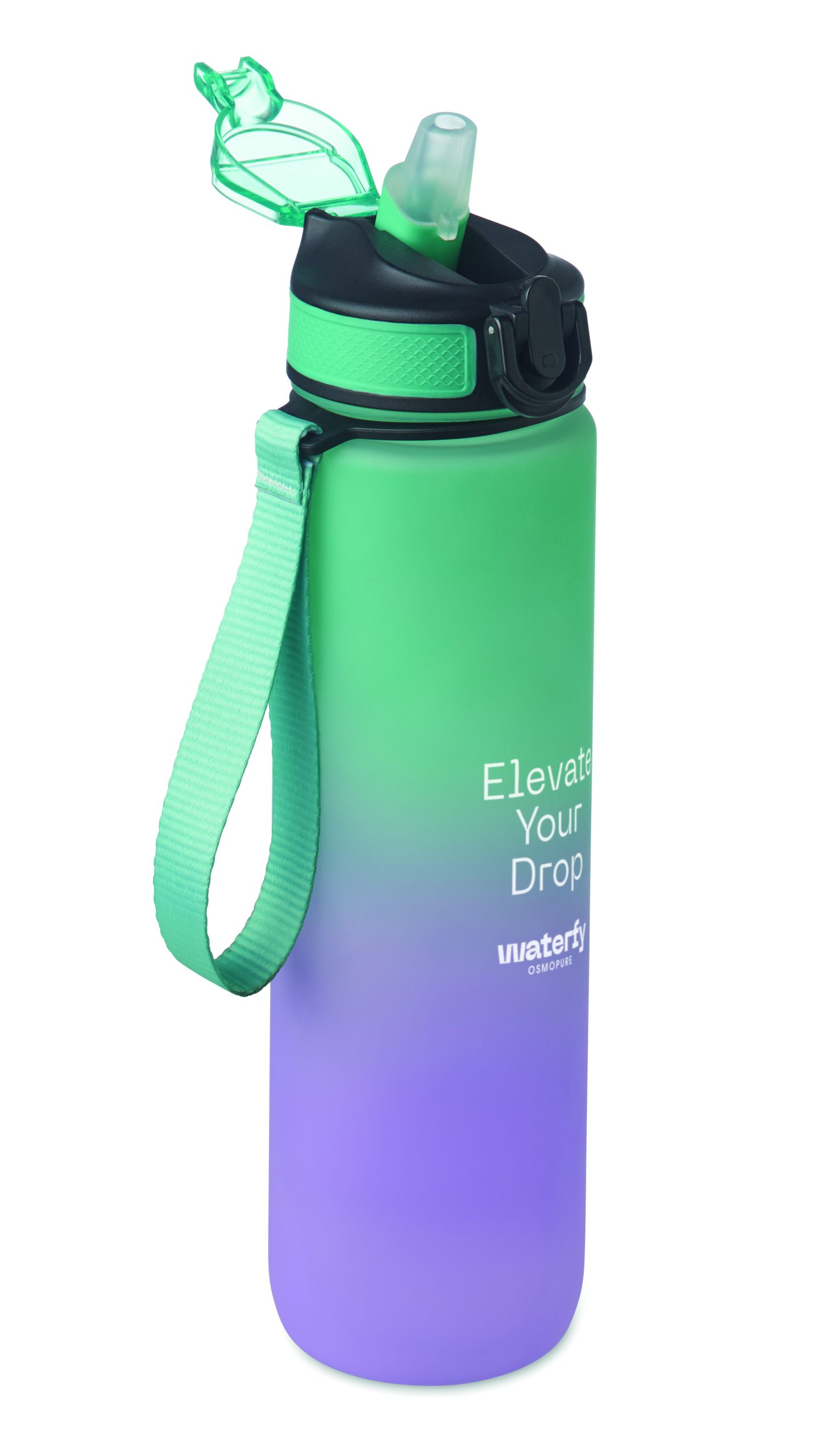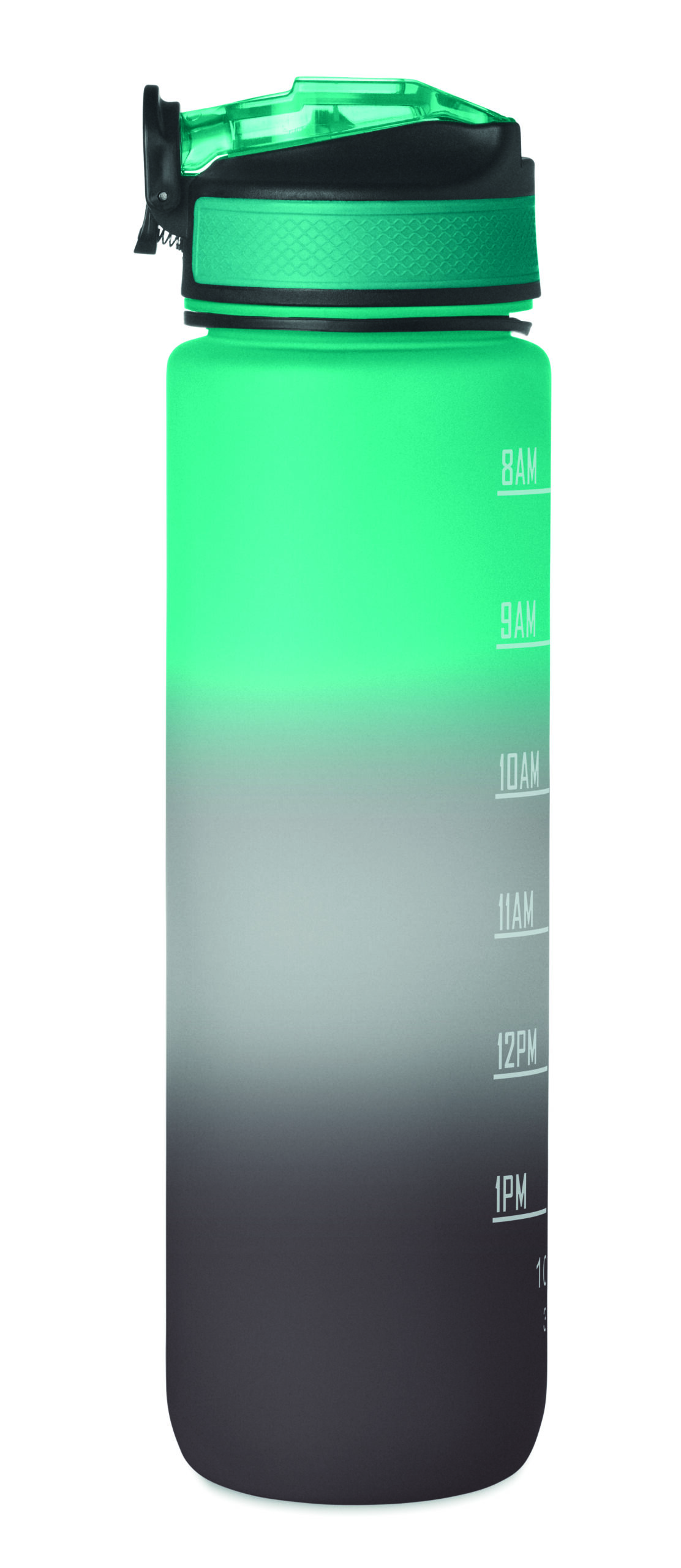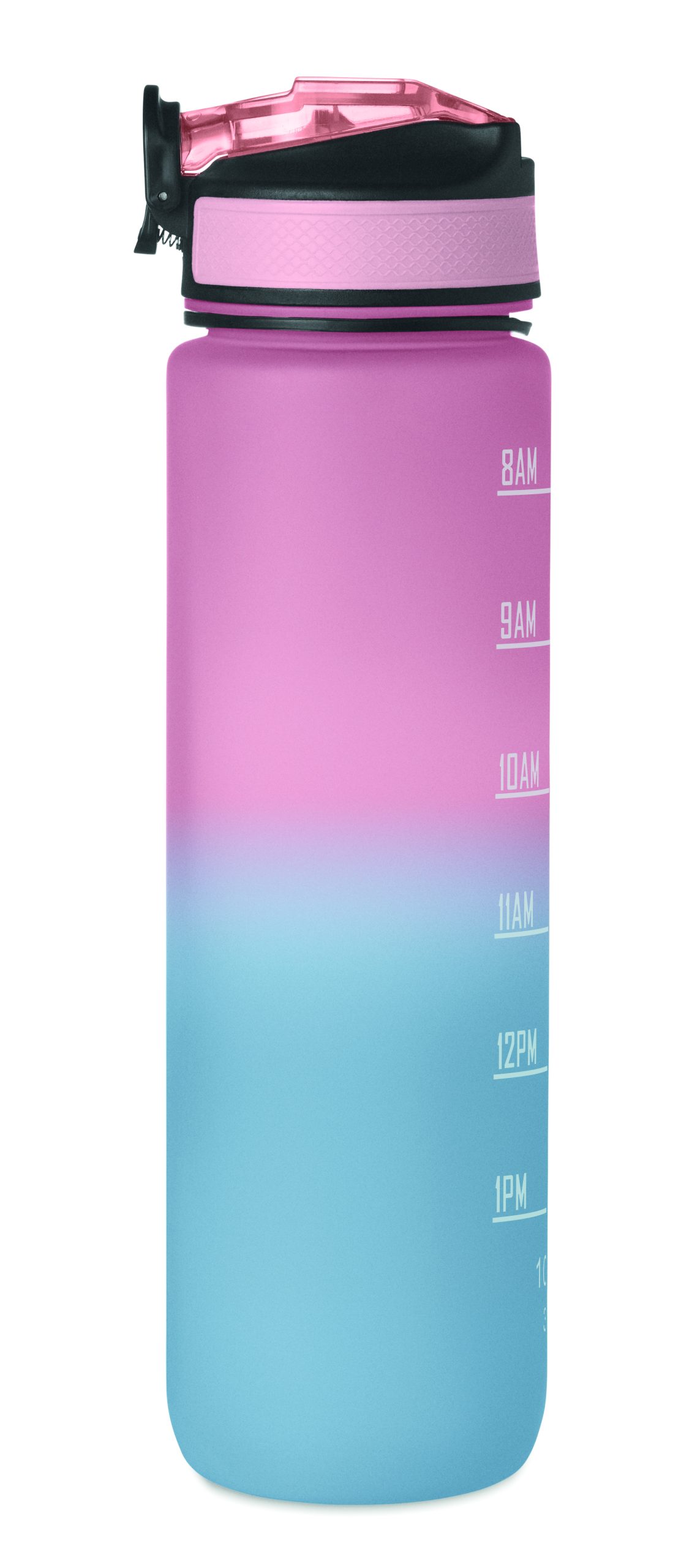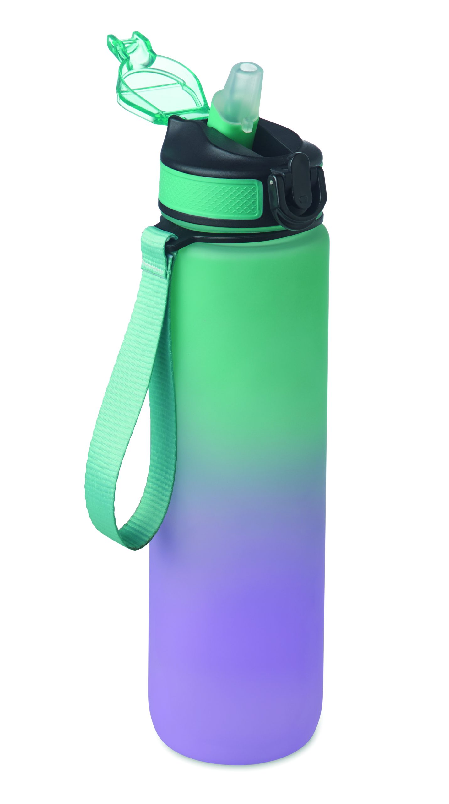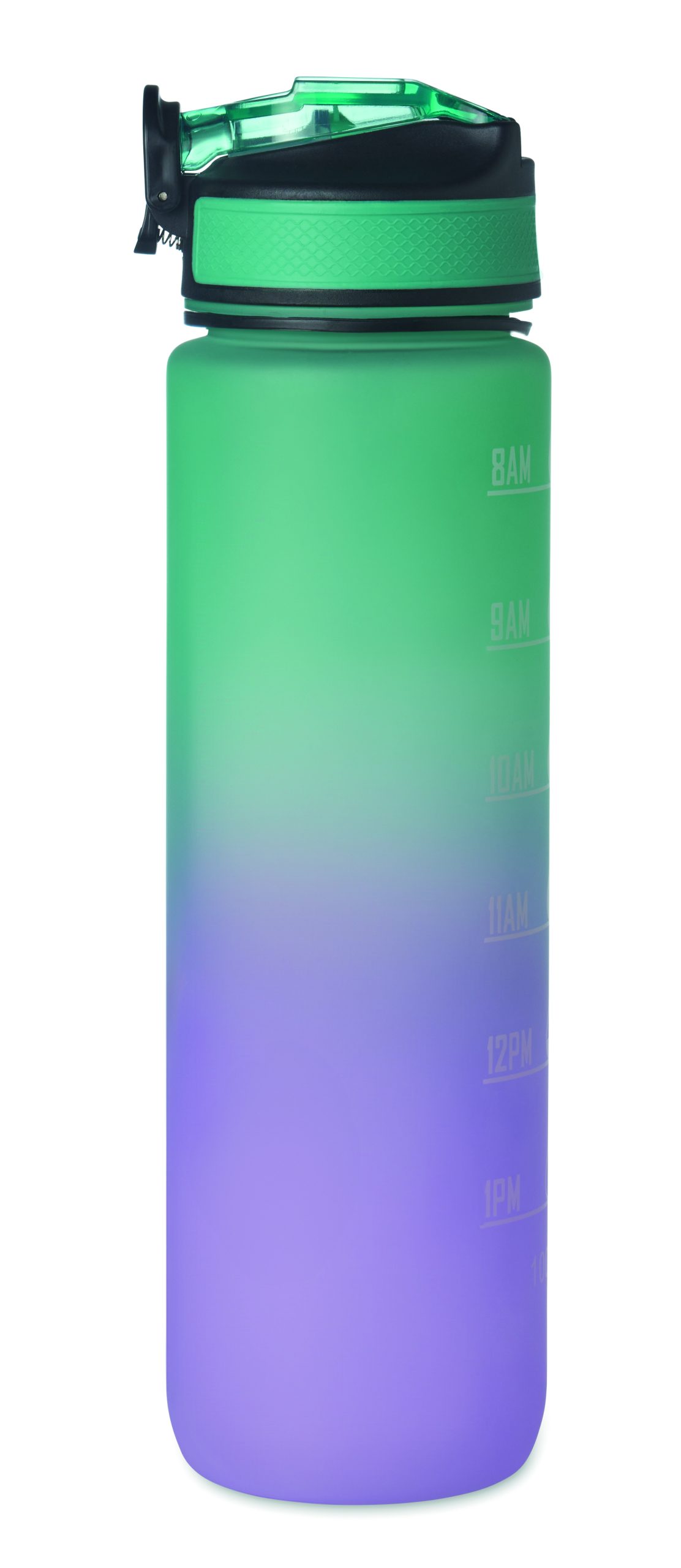 Sportowa butelka na wodę z RPET ze zintegrowaną słomką, miękkim silikonowym ustnikiem, motywacyjnym oznaczeniem czasu, otwieraną jedną ręką klapką, blokadą bezpieczeństwa i paskiem do przenoszenia. Pojemność 1 l. Szczelna.