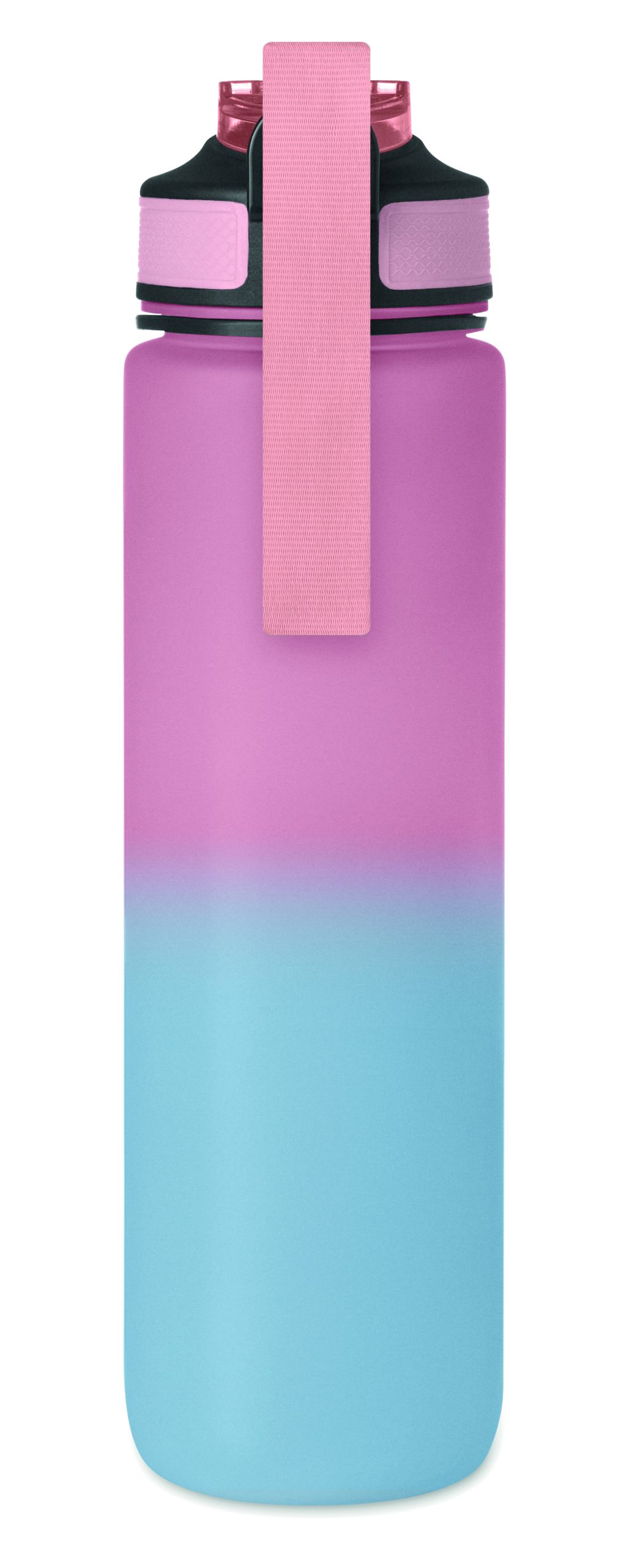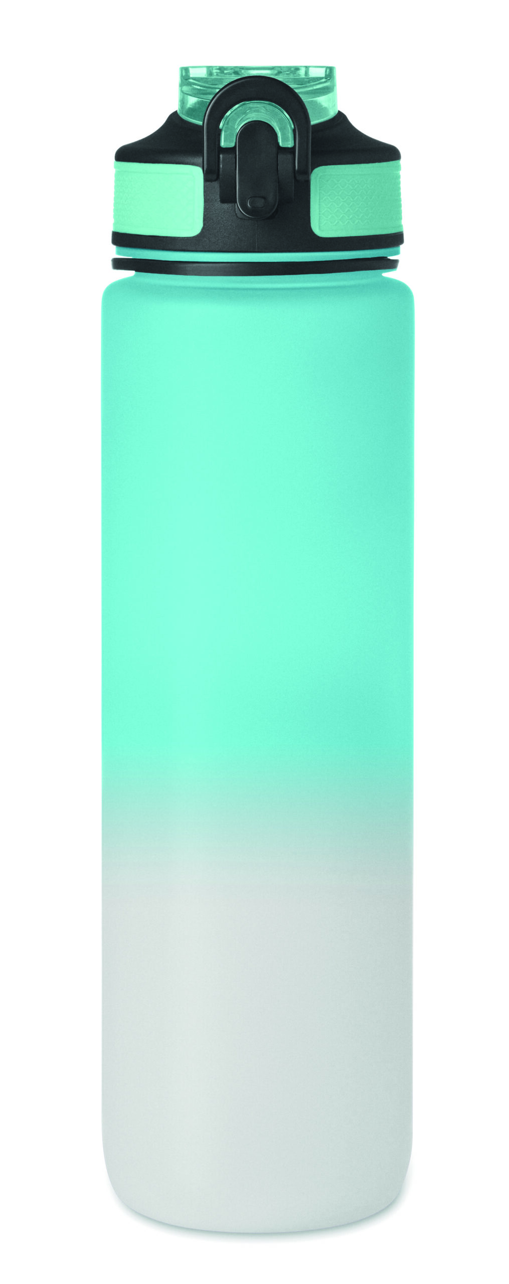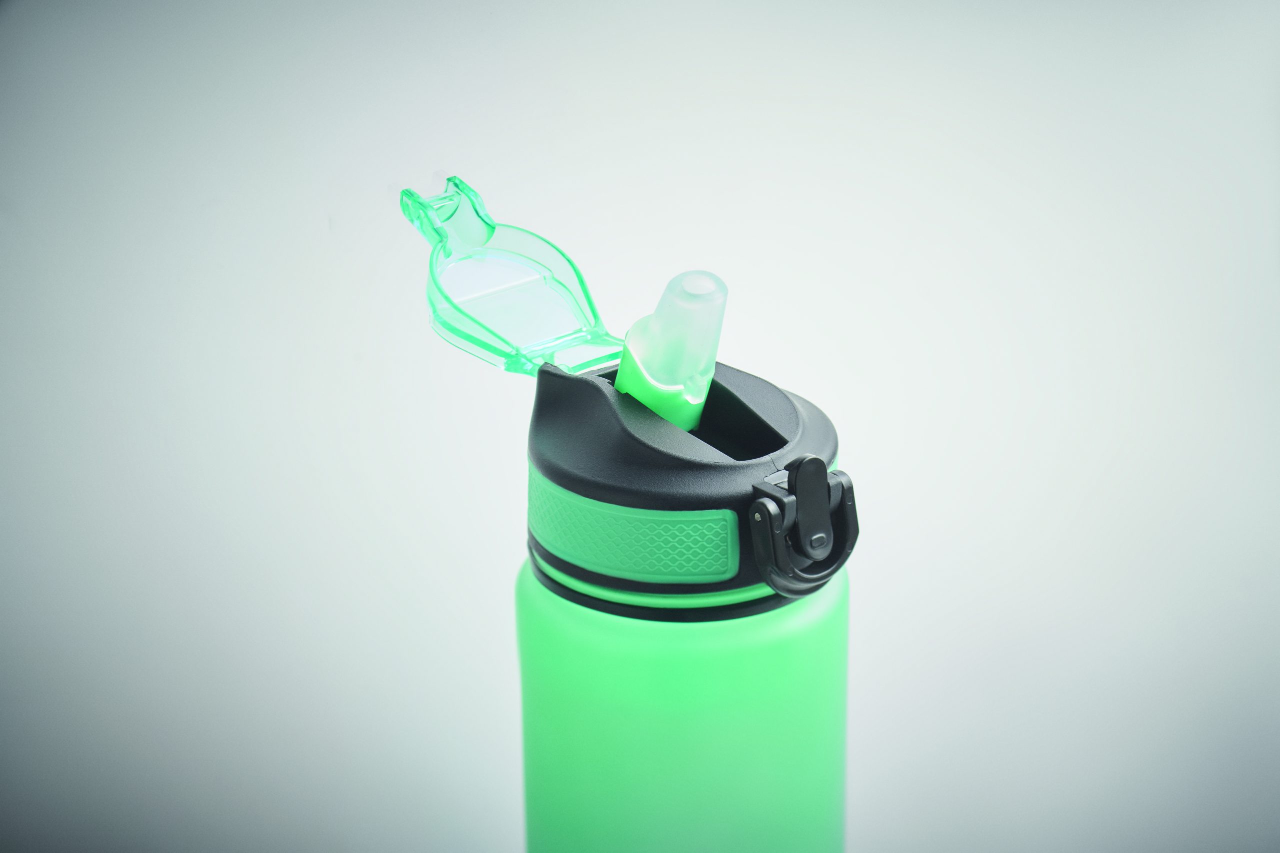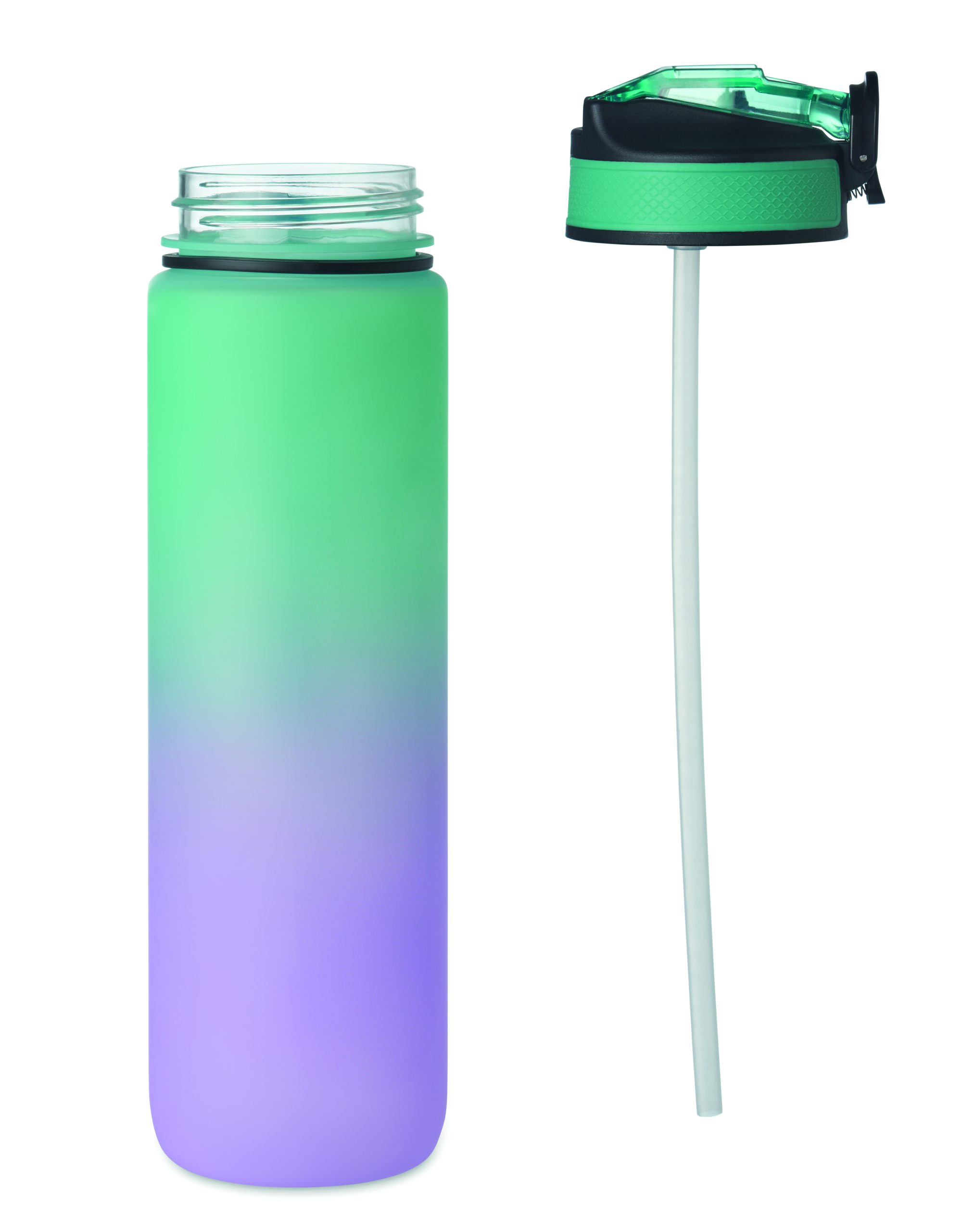 Sportowa butelka na wodę z RPET ze zintegrowaną słomką, miękkim silikonowym ustnikiem, motywacyjnym oznaczeniem czasu, otwieraną jedną ręką klapką, blokadą bezpieczeństwa i paskiem do przenoszenia. Pojemność 1 l. Szczelna.
