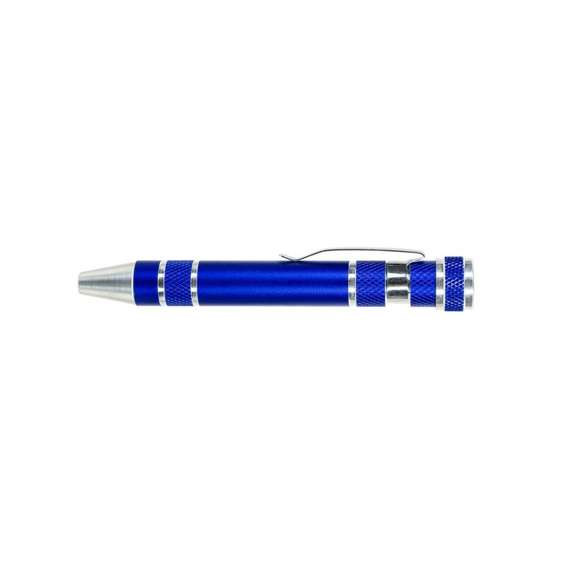 Śrubokręt w kształcie długopisu z 4 płaskimi i 4 krzyżakowymi końcówkami, posiada klip umożliwiający przypinanie, produkt wykonany z aluminium i stali