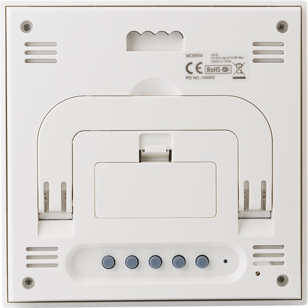 Stacja pogodowa, zegar, kalendarz, budzik z opcją drzemki, temperatura, wilgotność powietrza, informacje o pogodzie, bambusowy front