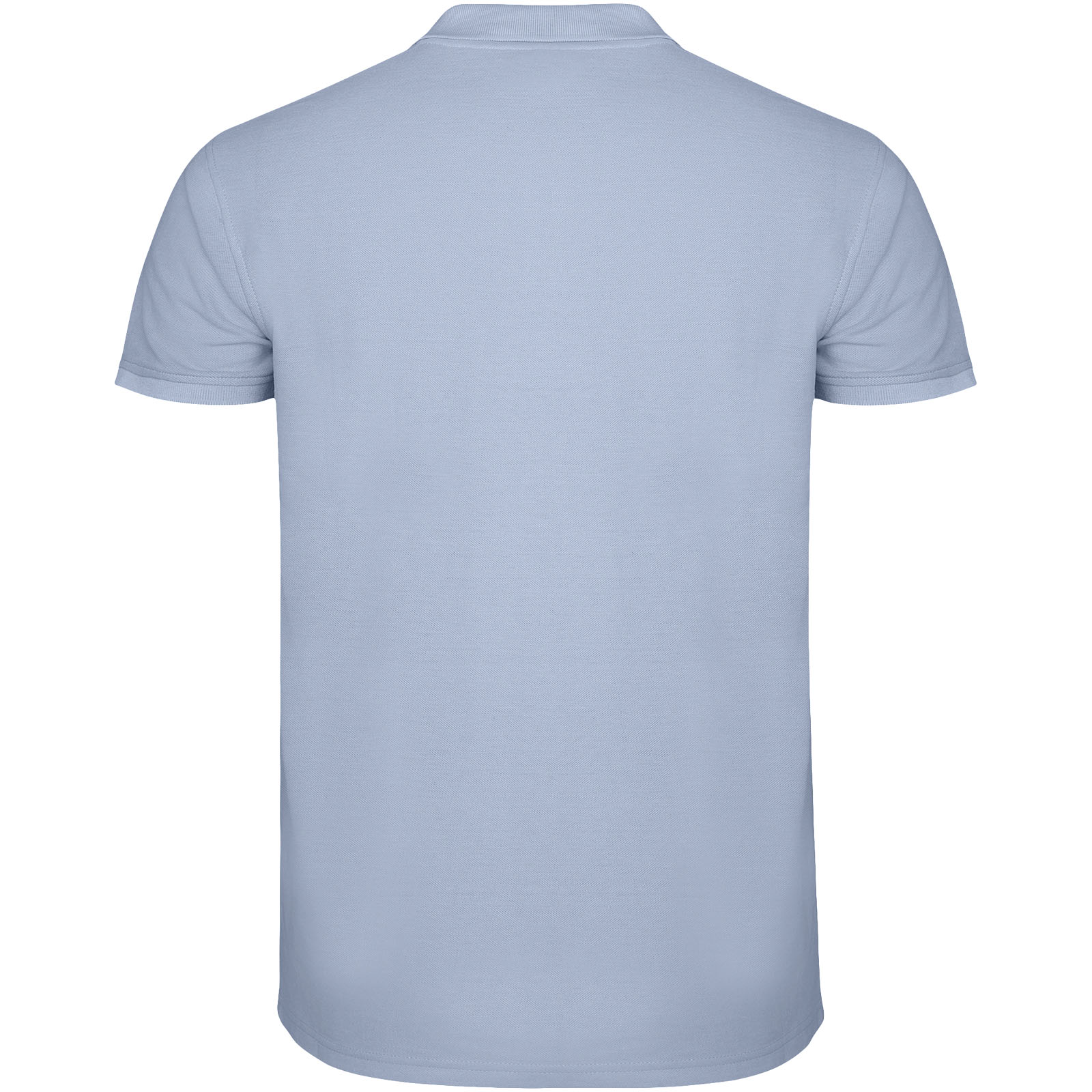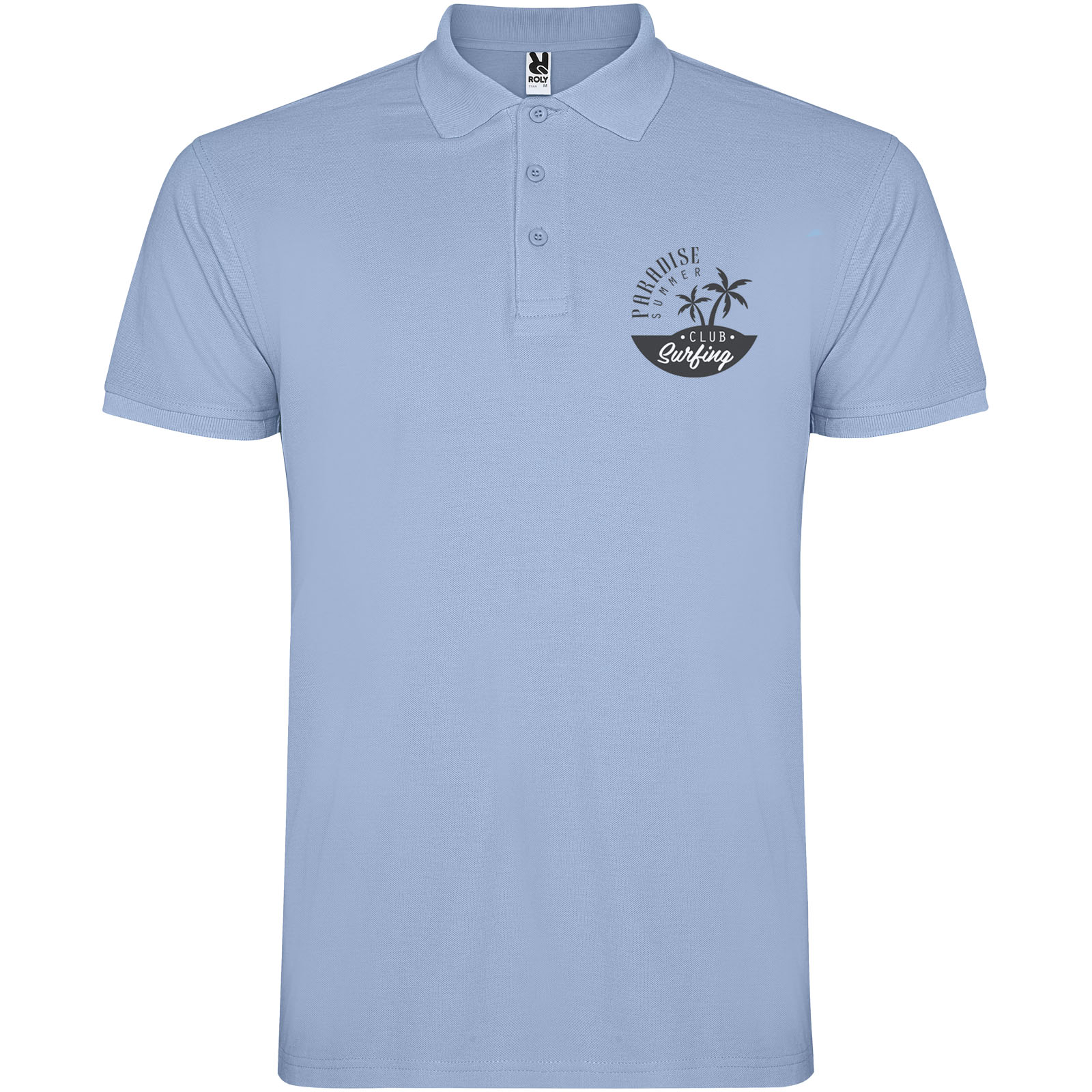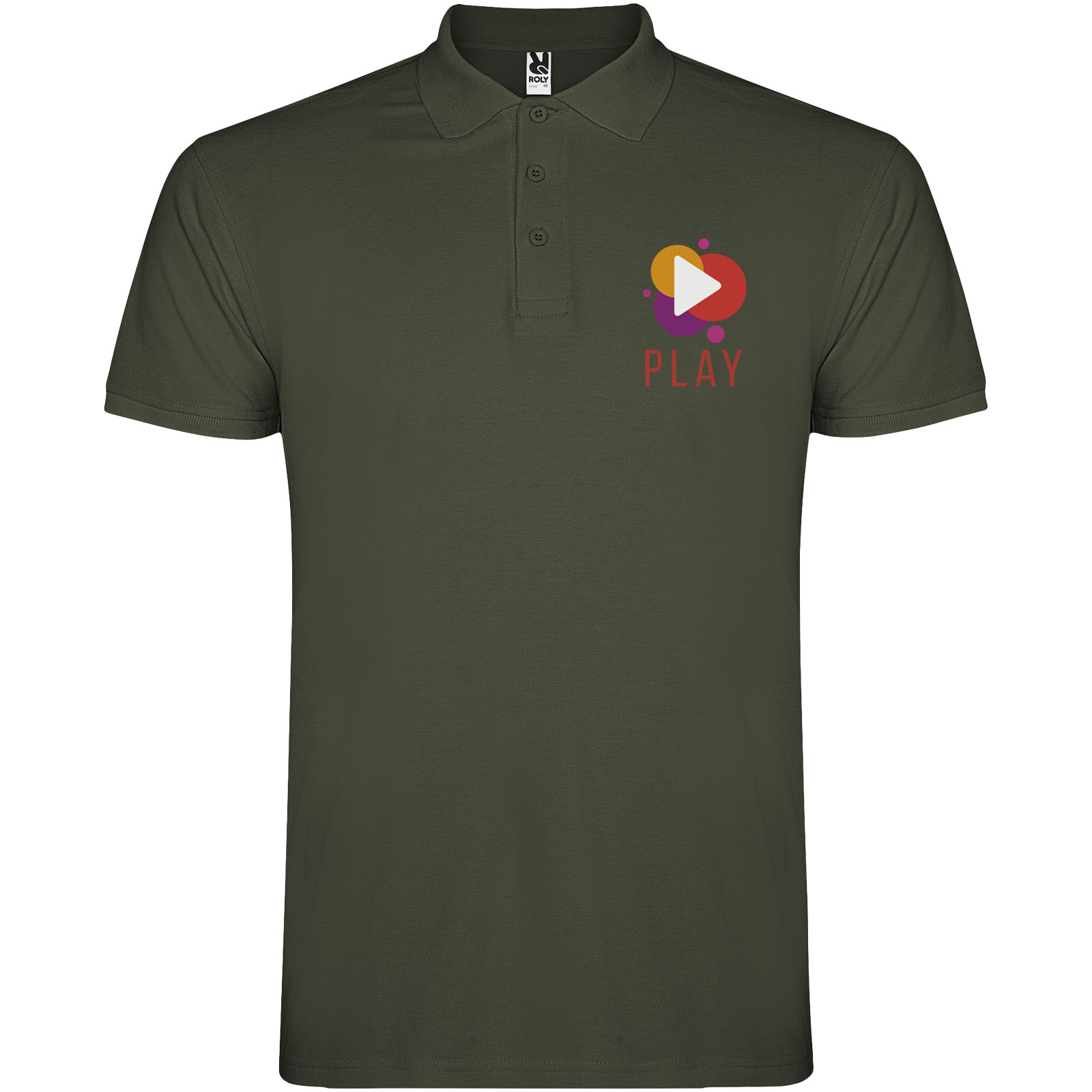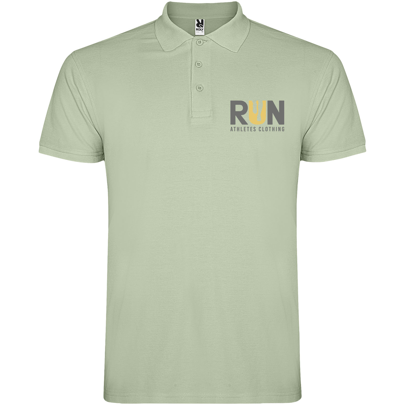 Męska koszulka polo z krótkim rękawem. Wzmocnione kryte szwy w wewnętrznym kołnierzyku. Prążkowane mankiety i kołnierzyk 1×1. Szwy boczne. Zapięcie na 3 guziki i boczne rozcięcia. Opcjonalna kieszeń. Usuwalna metka.
