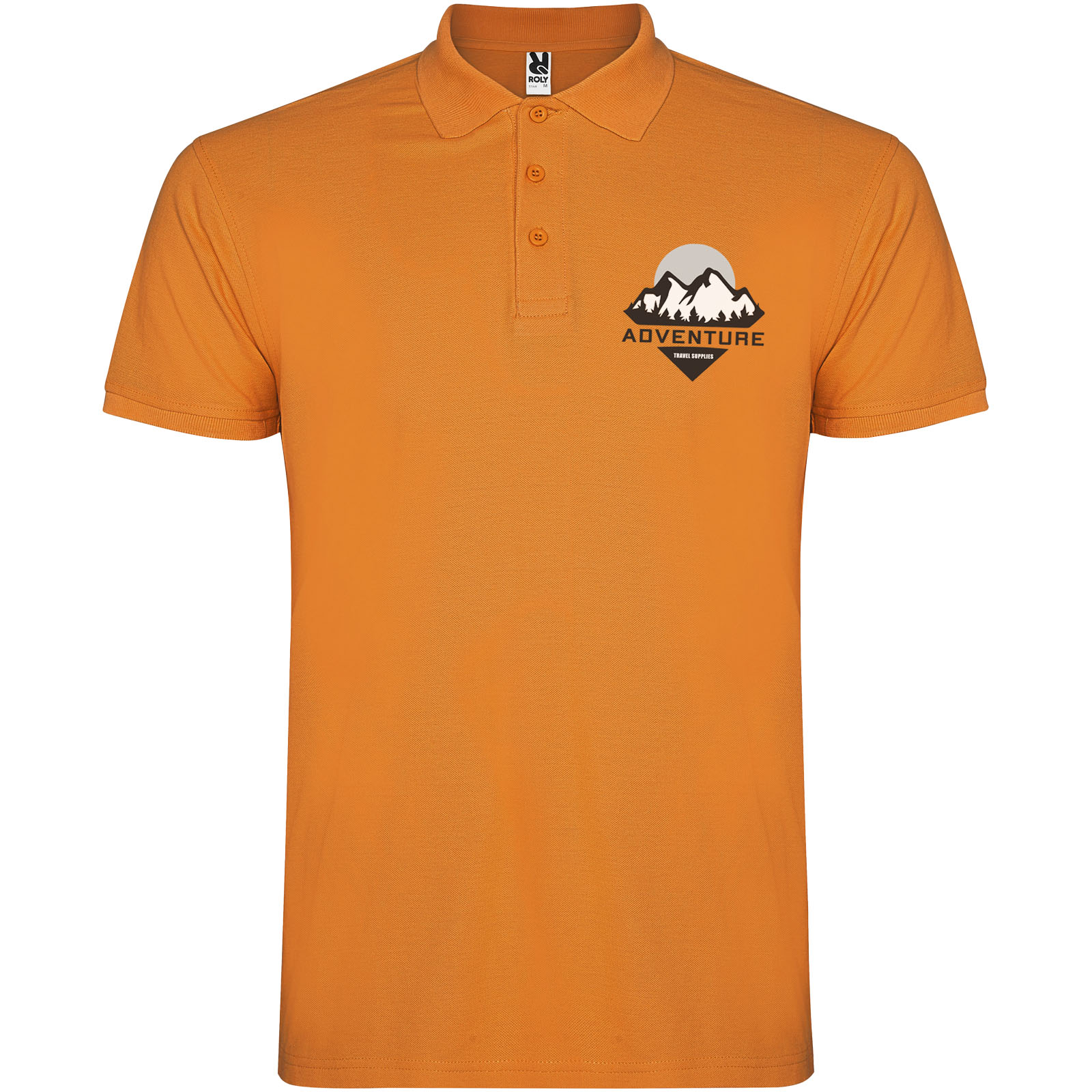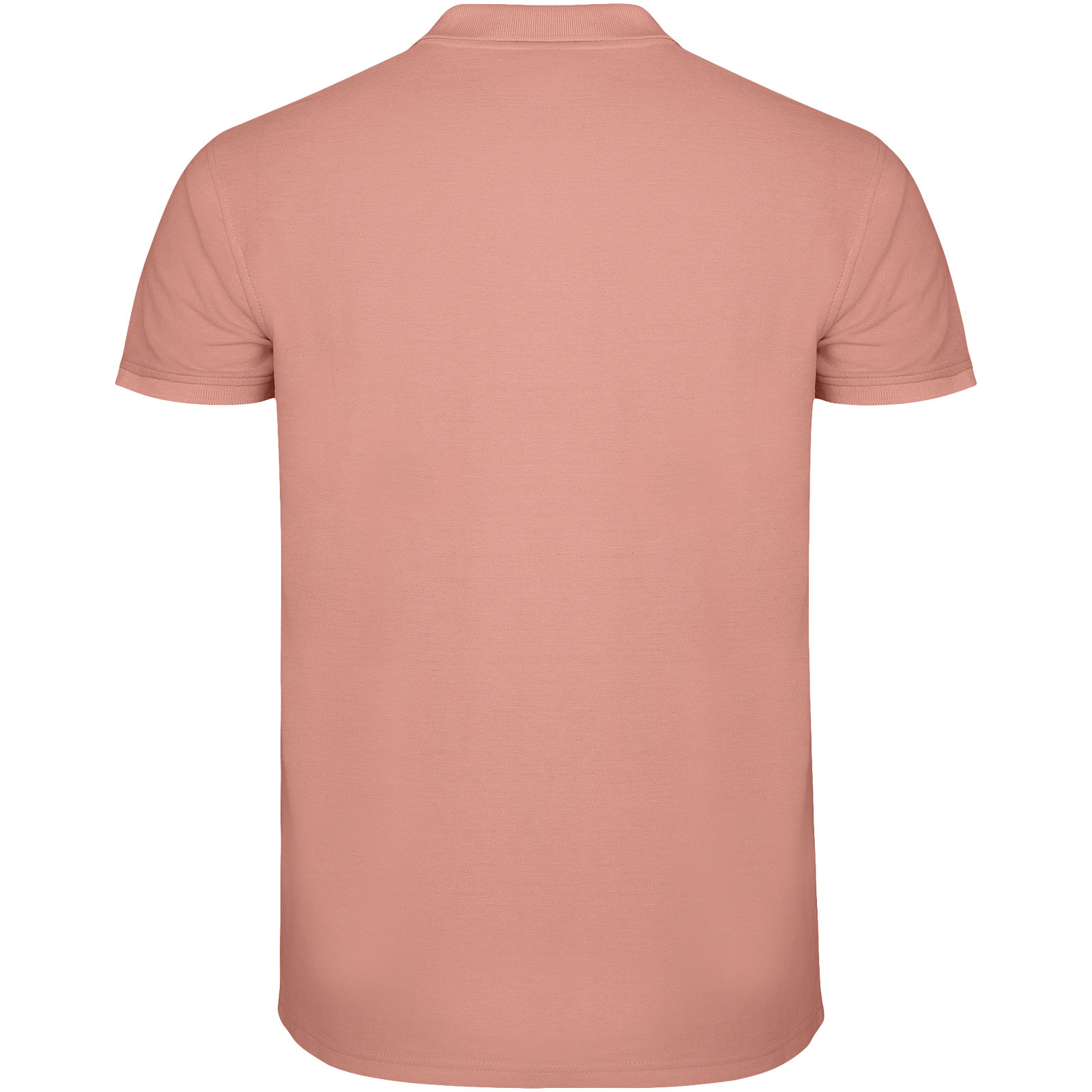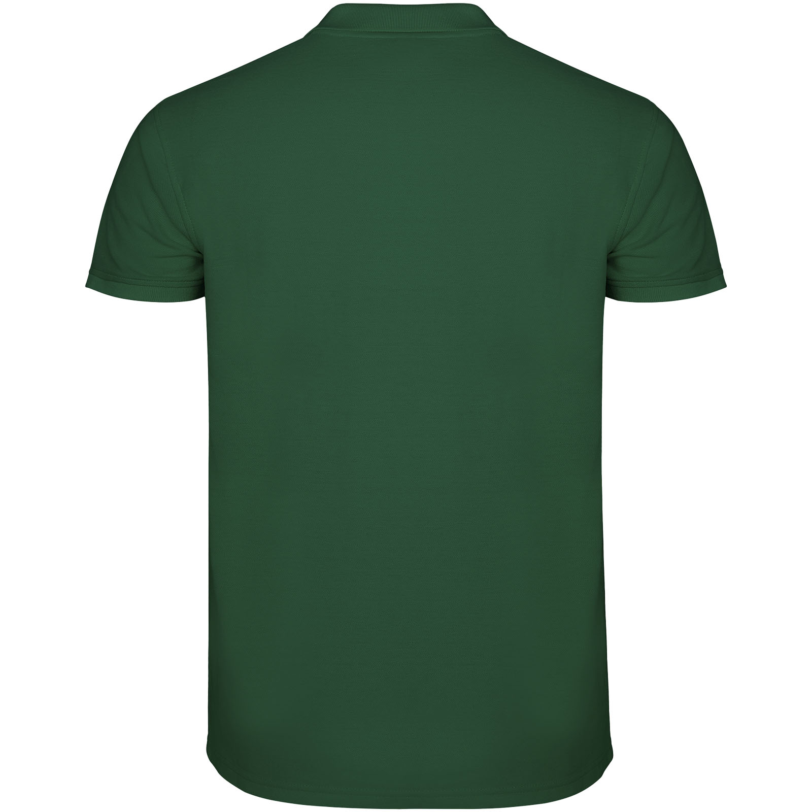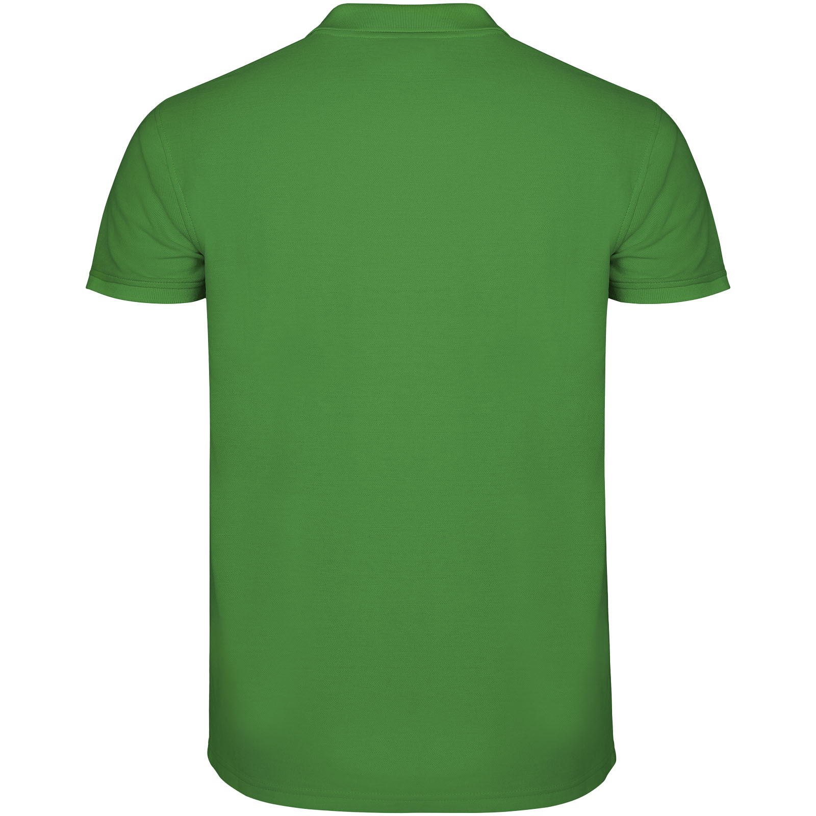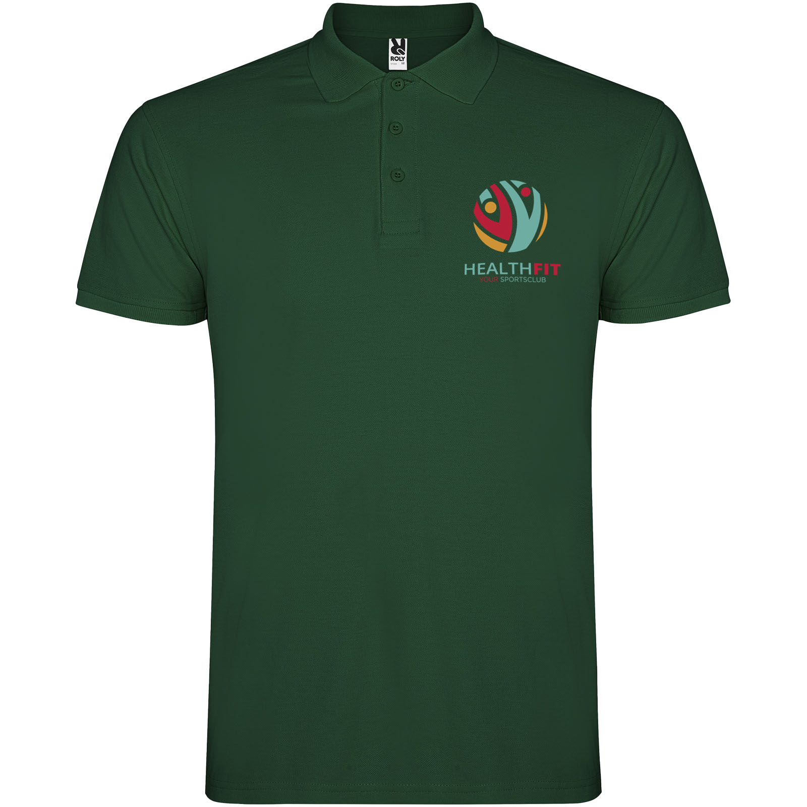 Męska koszulka polo z krótkim rękawem. Wzmocnione kryte szwy w wewnętrznym kołnierzyku. Prążkowane mankiety i kołnierzyk 1×1. Szwy boczne. Zapięcie na 3 guziki i boczne rozcięcia. Opcjonalna kieszeń. Usuwalna metka.
