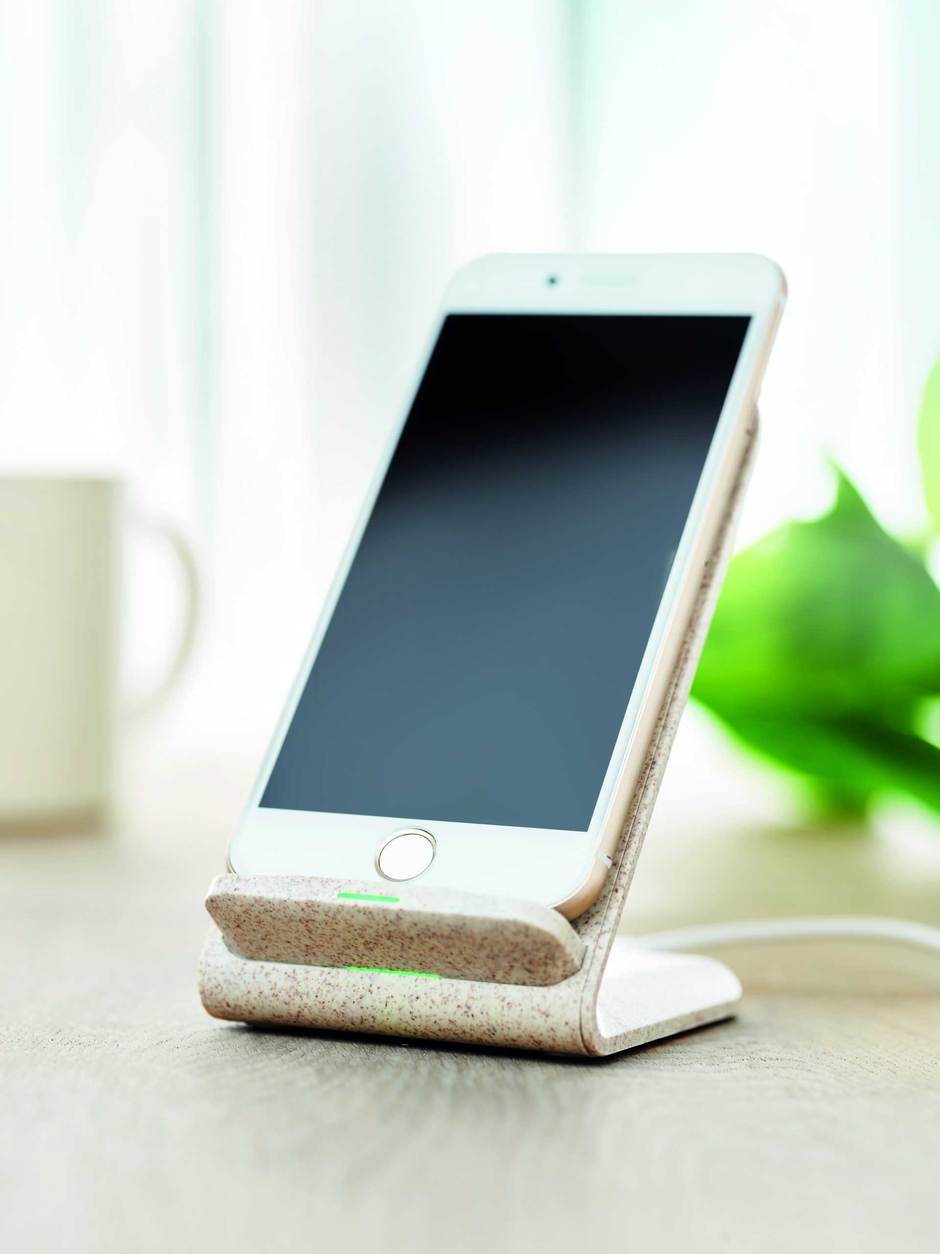 Ładowarka bezprzewodowa z funkcją stojaka. Wykonana w 35% ze słomy pszenicy i w 65% z ABS. Wyjście: DC5V/2A (10W) do szybkiego ładowania.