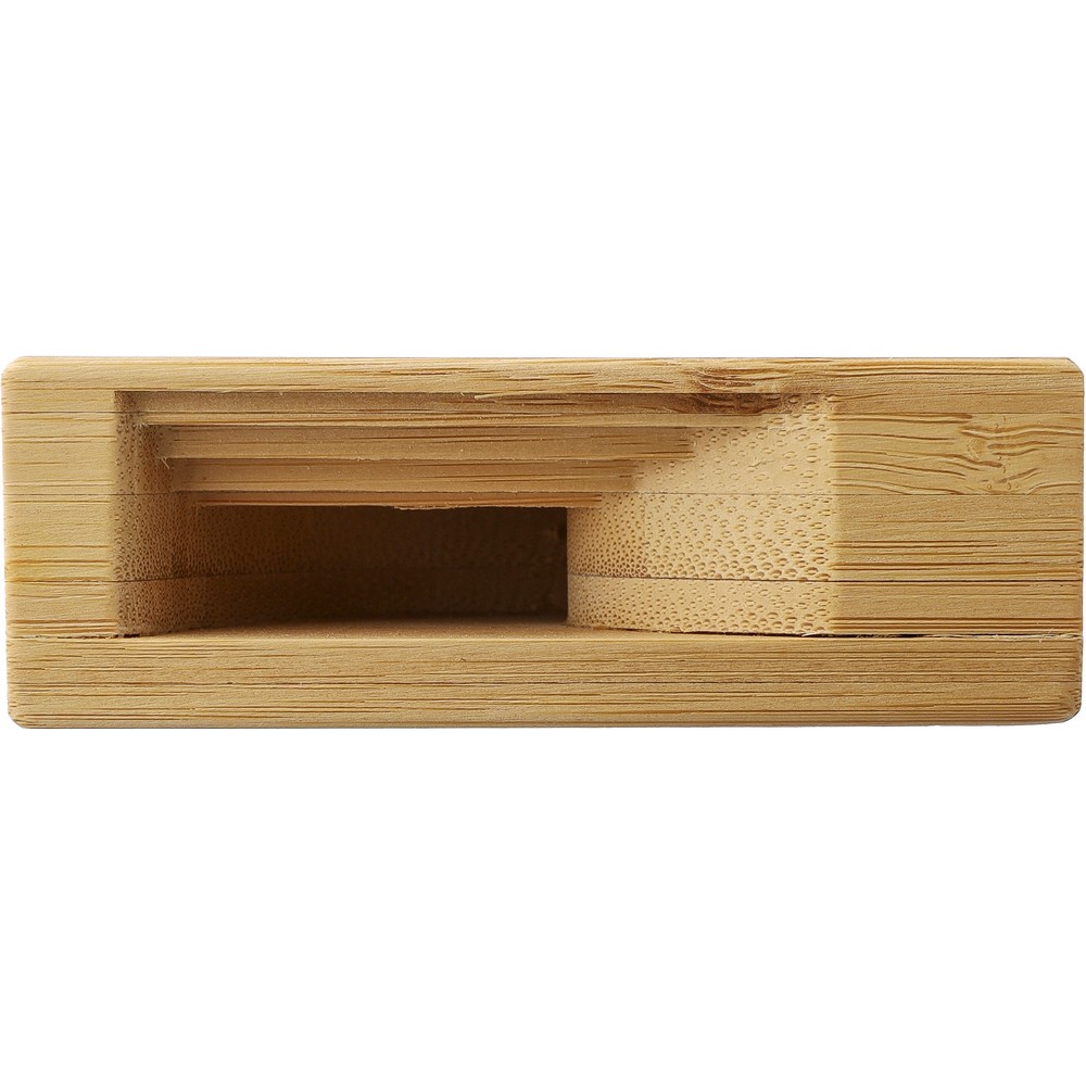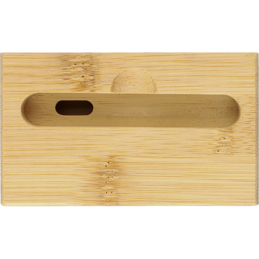 Stojak na telefon z funkcją wzmacniacza, podczas odtwarzania muzyki dźwięk będzie wydobywał się z dołu wzmocniony bez zasilania i baterii, zapakowany w brązowy kartonik, produkt wykonany z bambusa