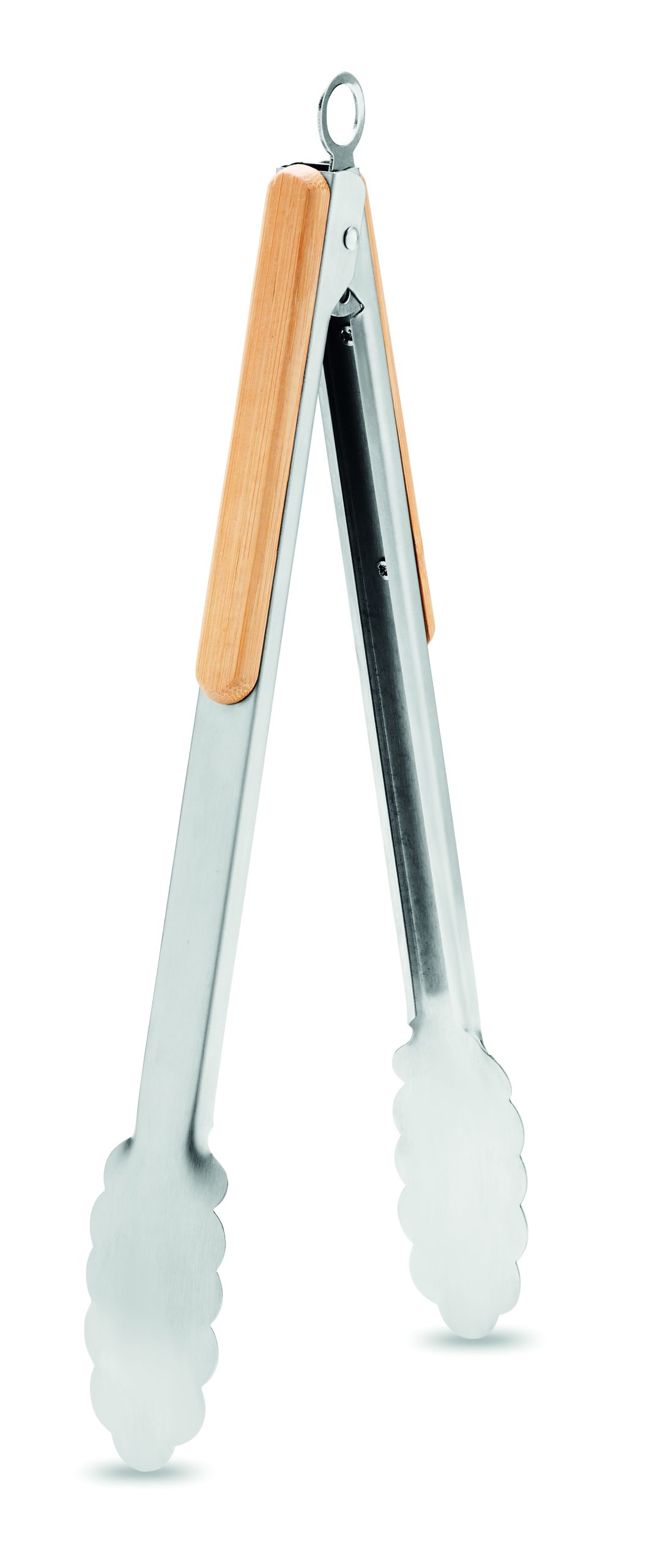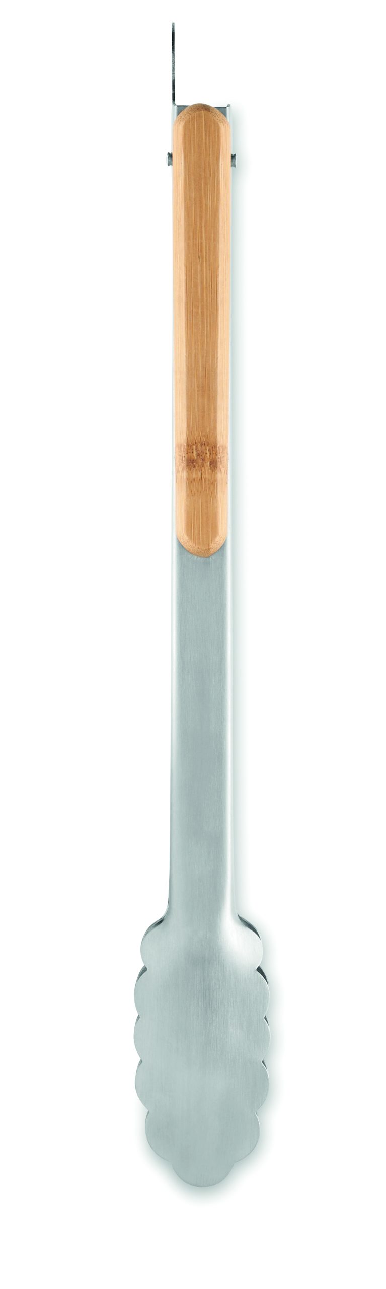 Szczypce do grilla ze stali nierdzewnej z bambusowymi uchwytami. Mechanizm blokujący. Bambus jest produktem naturalnym, dlatego mogą wystąpić nieznaczne różnice w kolorze, wzorze i rozmiarze.