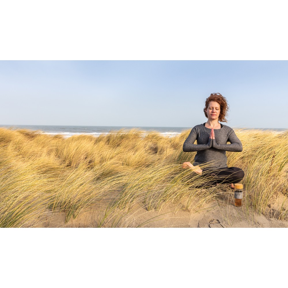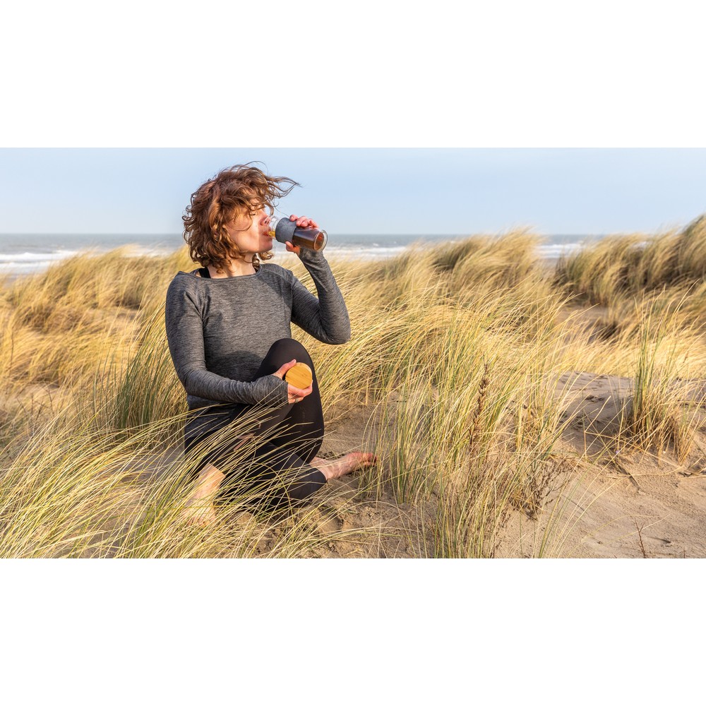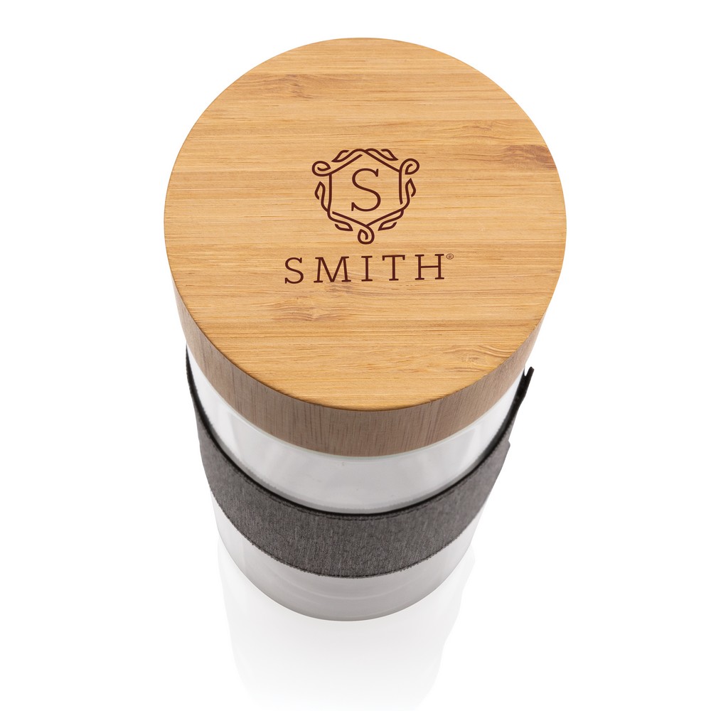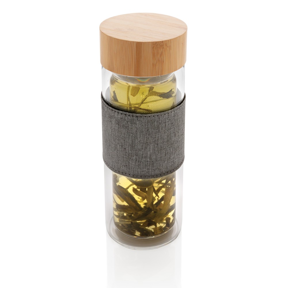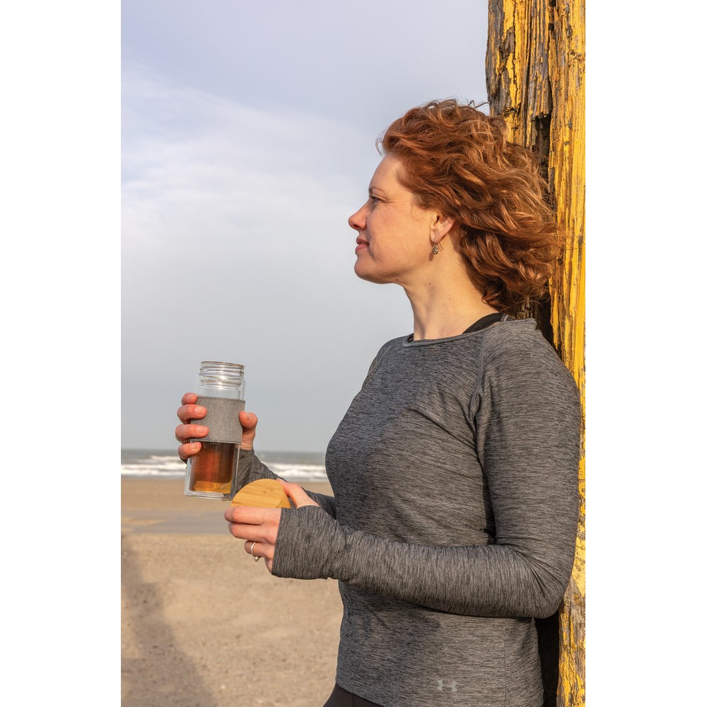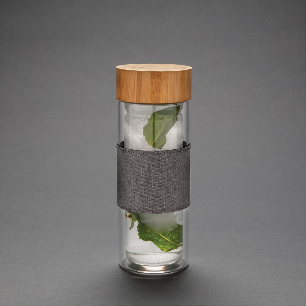 Szklana butelka 360 ml w pokrowcu z RPET, podwójne ścianki ze szkła borokrzemowego odpornego na wysoką temperaturę, 2% zysku ze sprzedaży każdego produktu jest przekazywane do fundacji Water.org, wzór zastrzeżony®