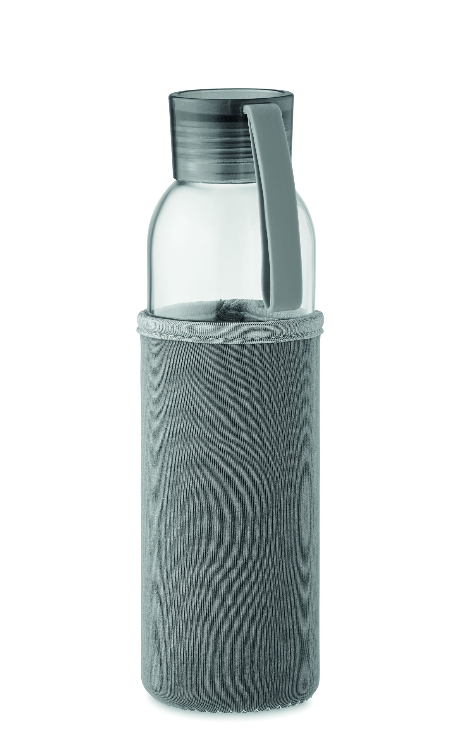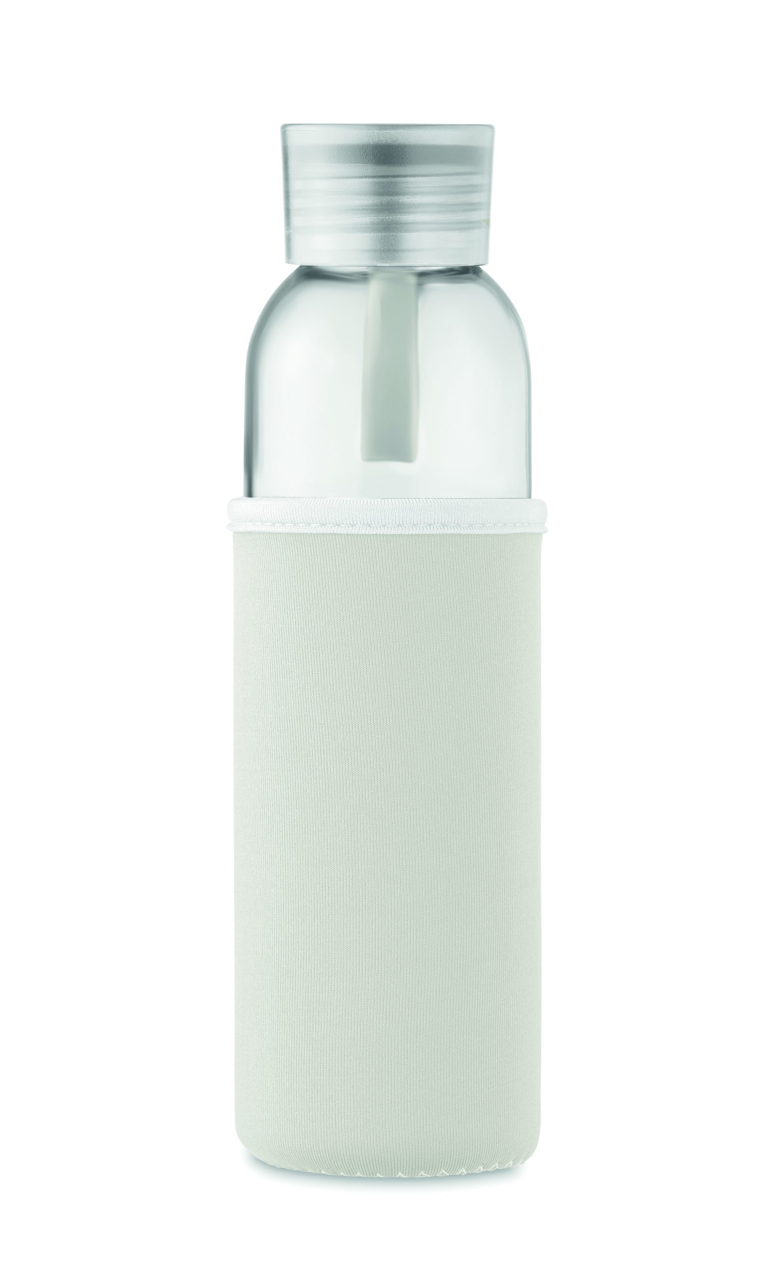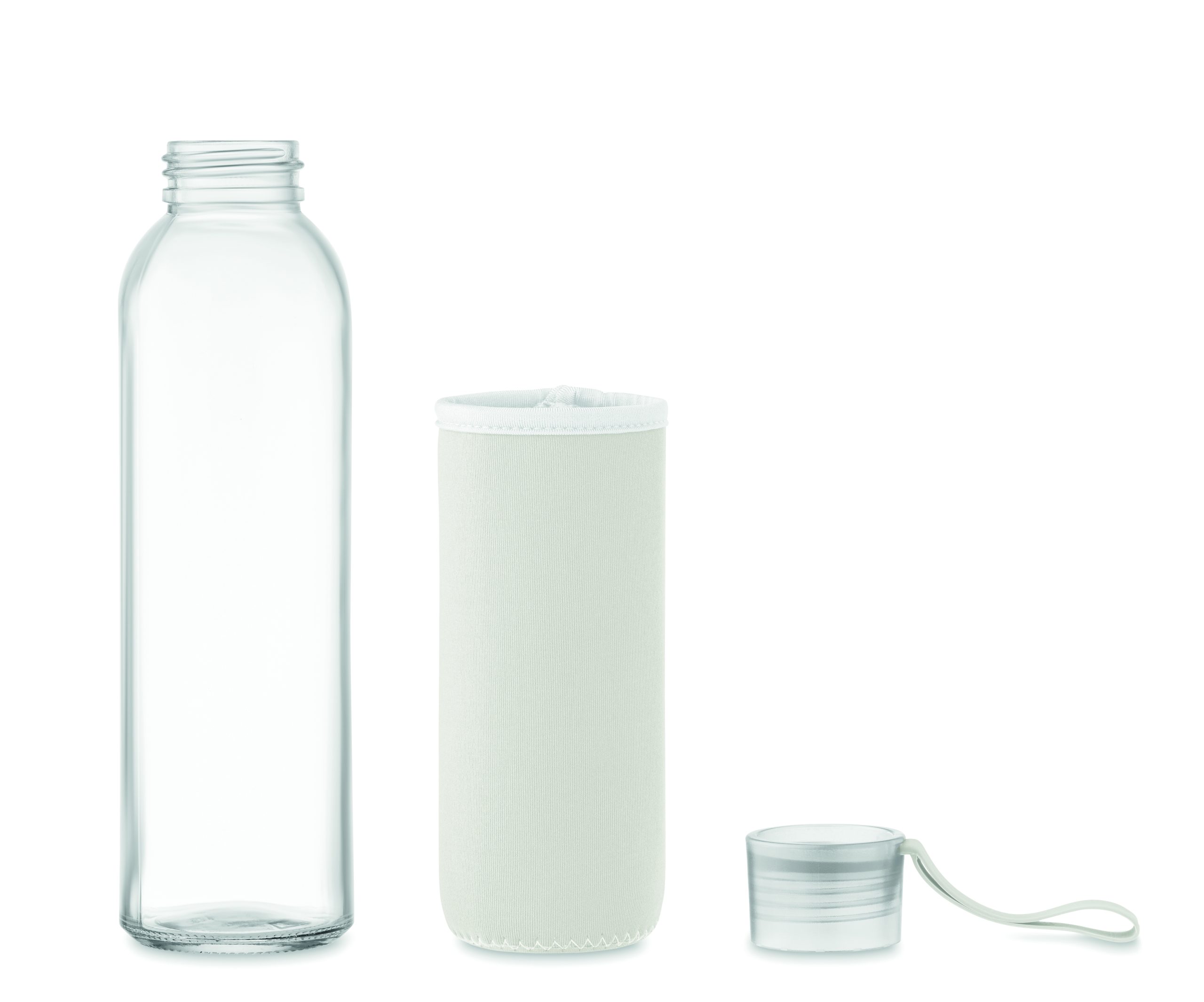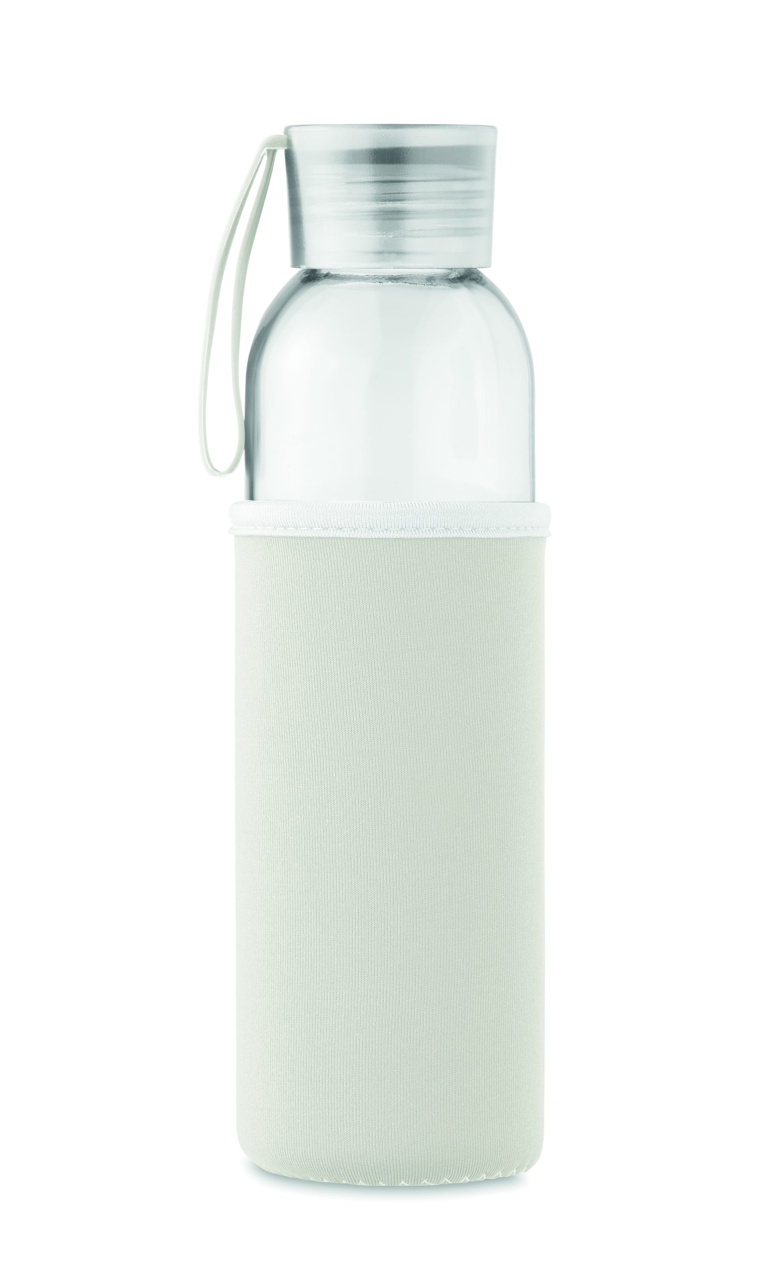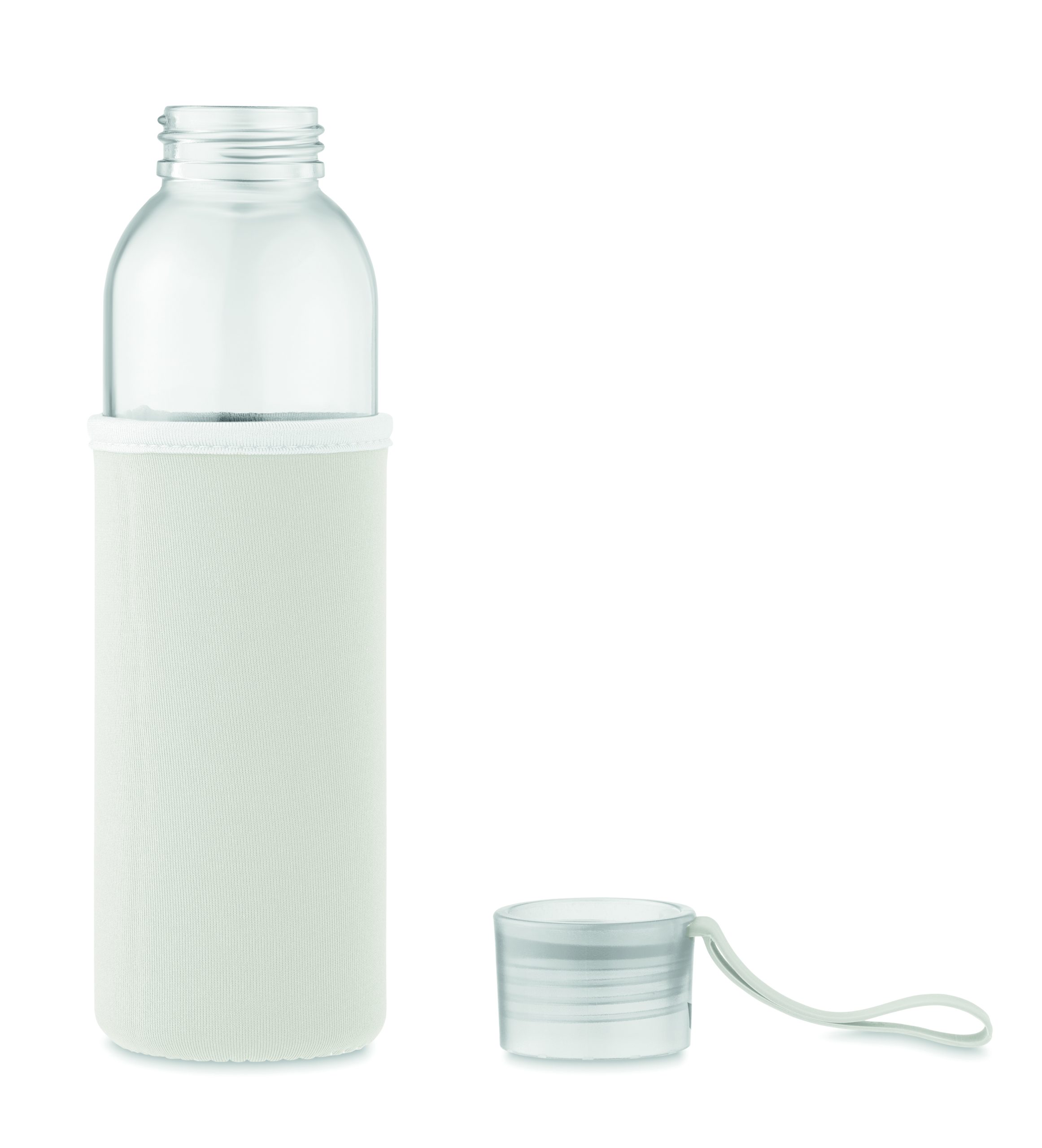 Szklana butelka z recyklingu z neoprenowym etui, z zakrętką z PP i z silikonową zwieszką. Szczelna. Pojemność: 500 ml.