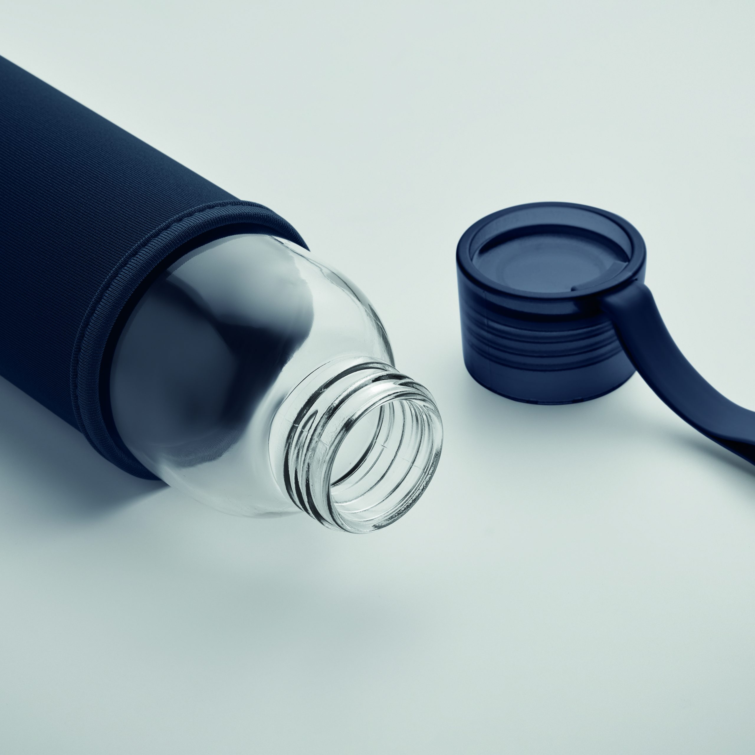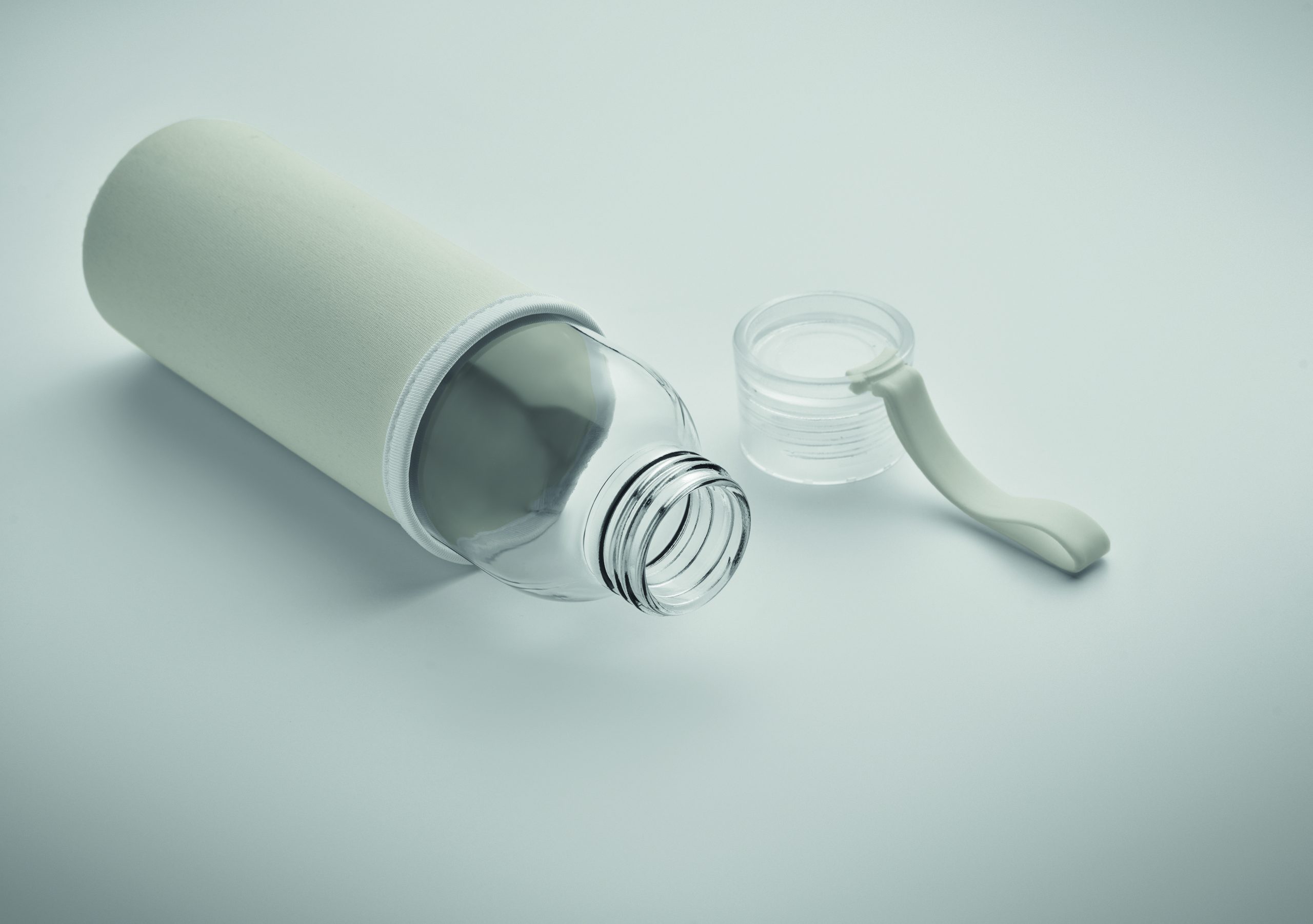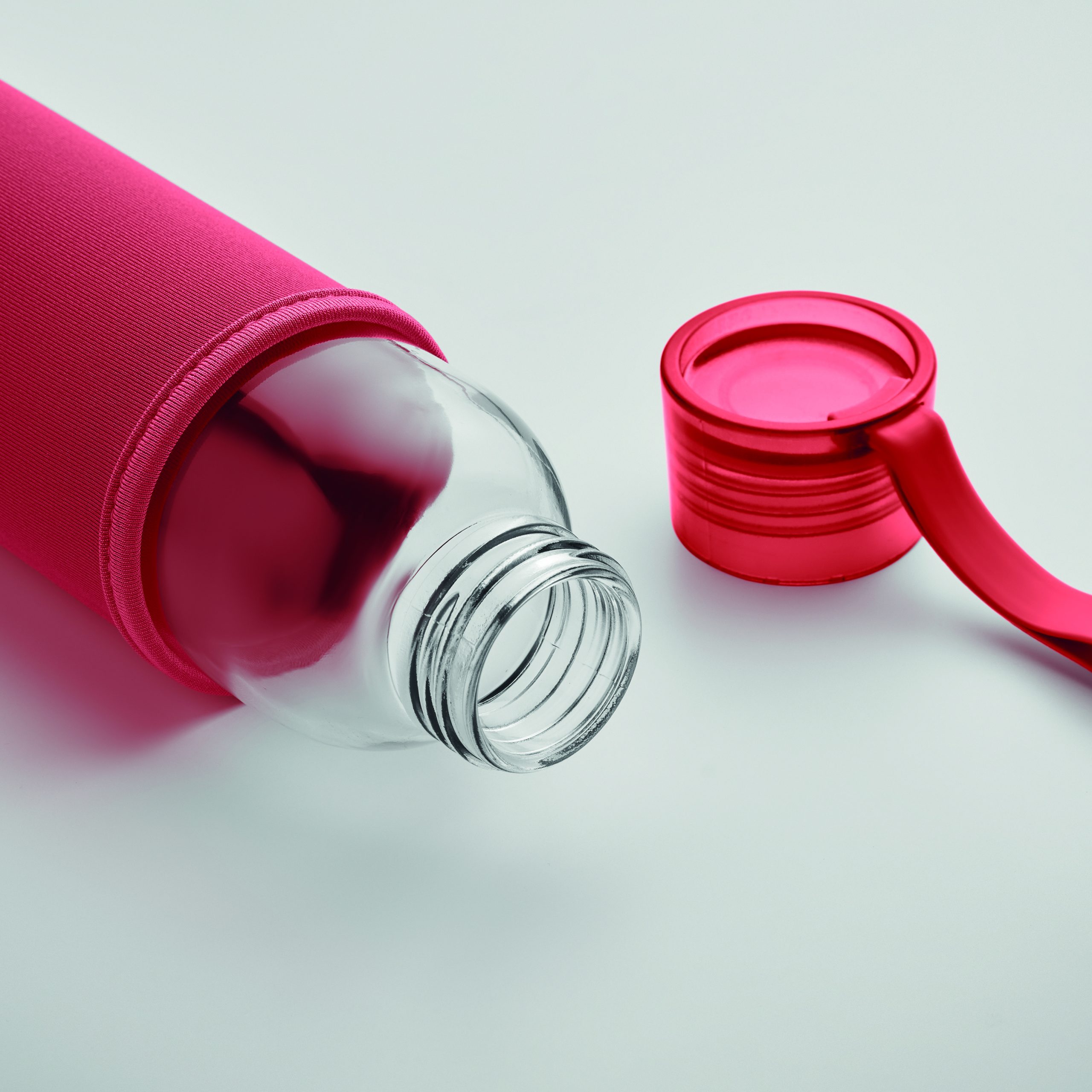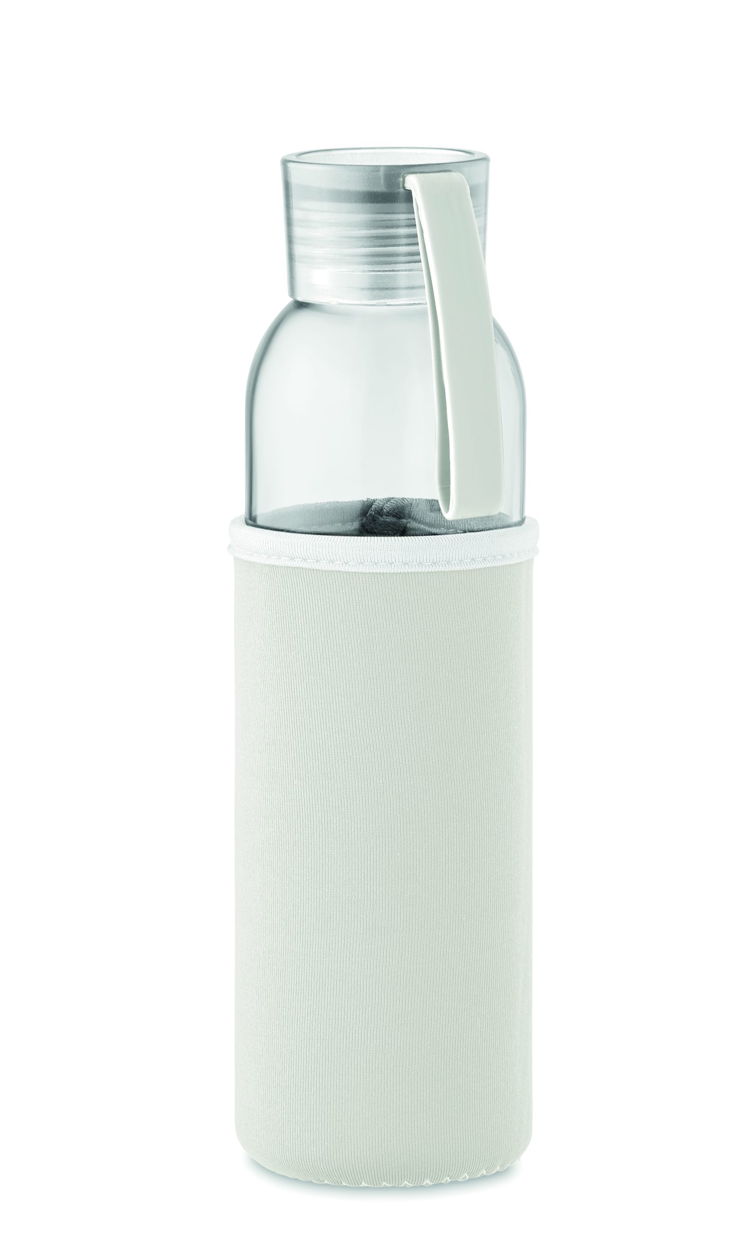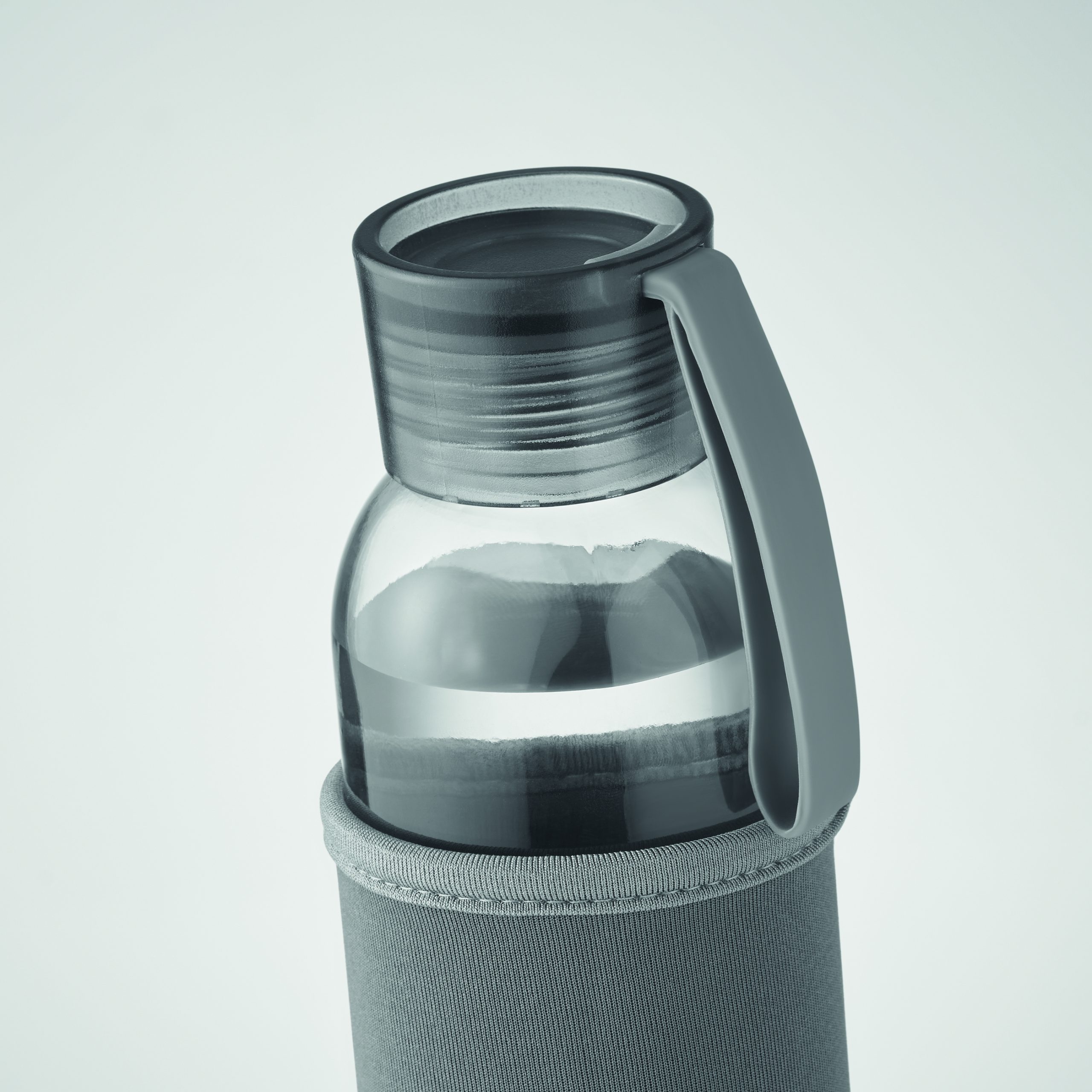 Szklana butelka z recyklingu z neoprenowym etui, z zakrętką z PP i z silikonową zwieszką. Szczelna. Pojemność: 500 ml.