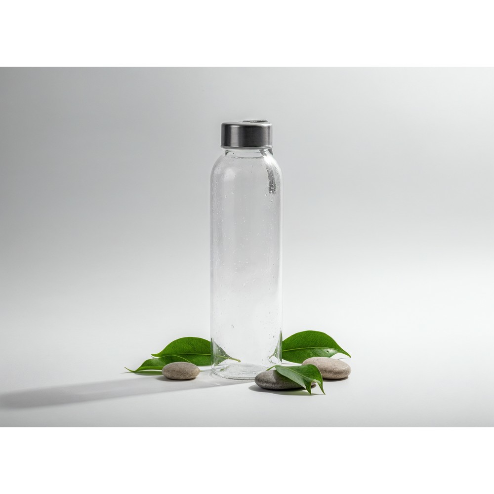 Butelka 500 ml, posiada zakrętkę w srebrnym kolorze oraz uchwyt ułatwiający noszenie, produkt wykonany ze szkła i stali nierdzewnej