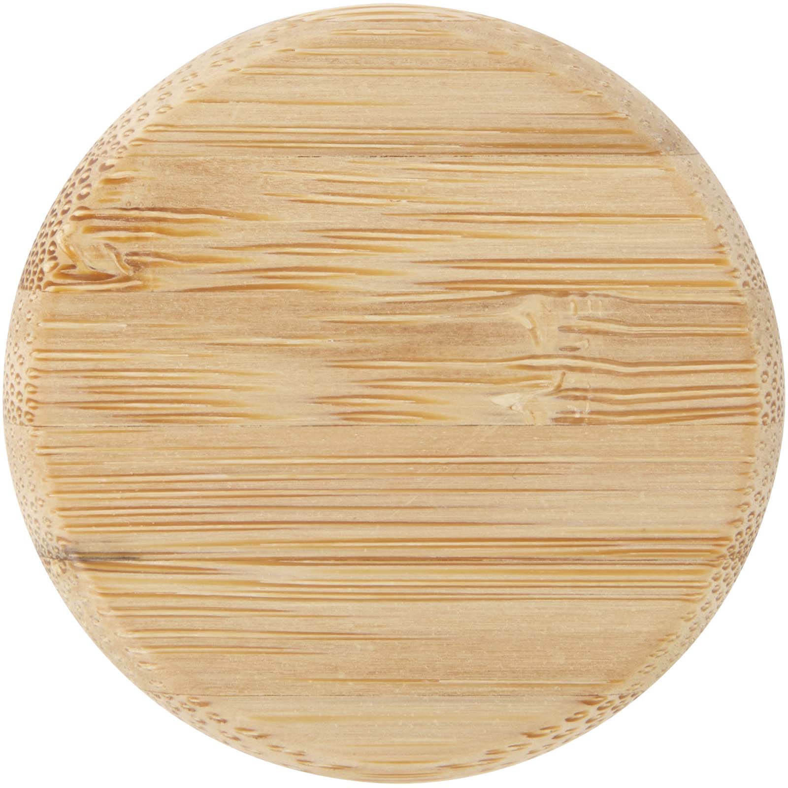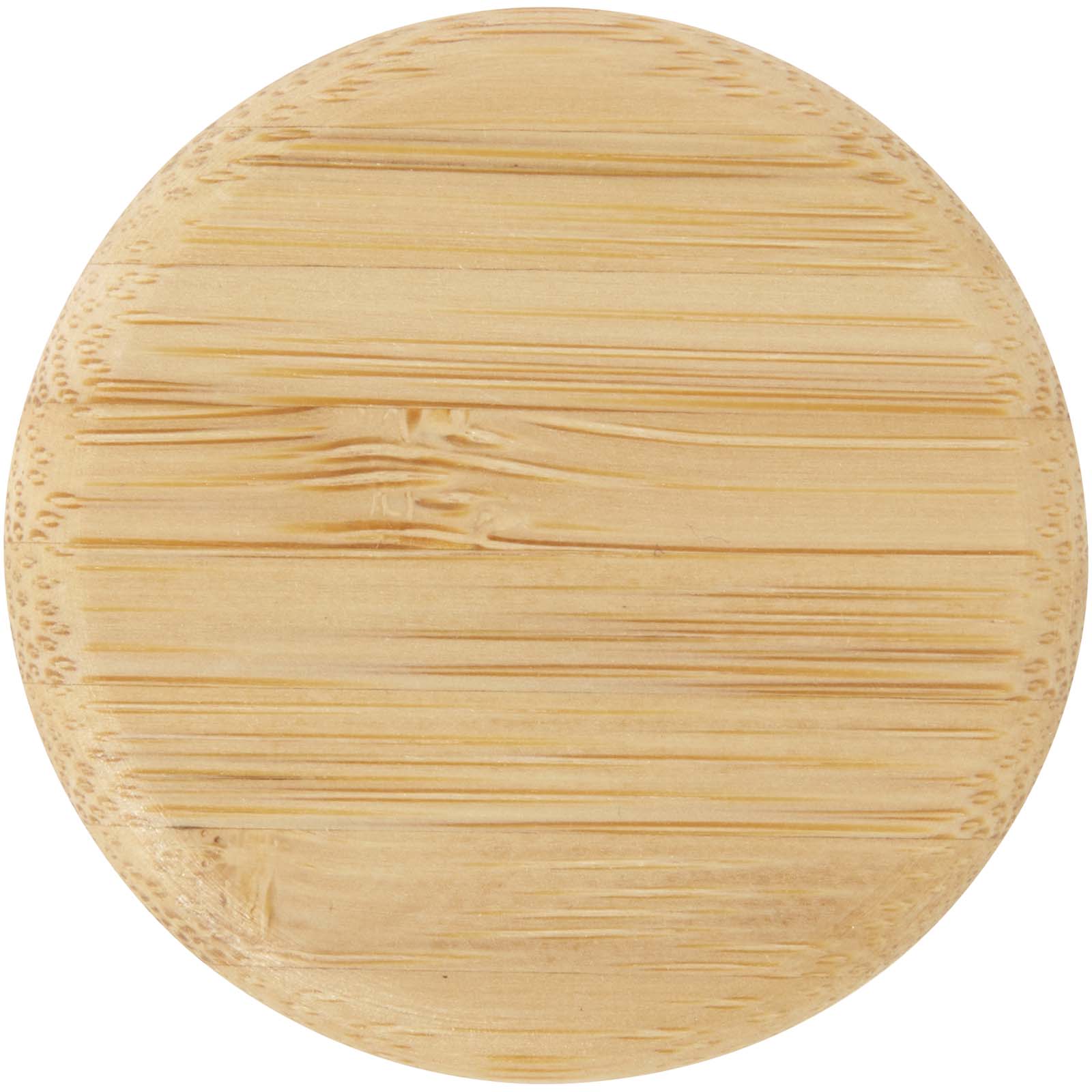 Butelka na wodę ze szkła o pojedynczych ściankach, wyposażona w zakrętkę wykonaną z bambusa, pochodzącą z bardziej zrównoważonych i społecznie odpowiedzialnych źródeł. W zestawie znajduje się wygodny silikonowy pasek ułatwiający noszenie. Zapakowane w pudełko upominkowe wykonane z kartonu z recyklingu. Pojemność: 500 ml.