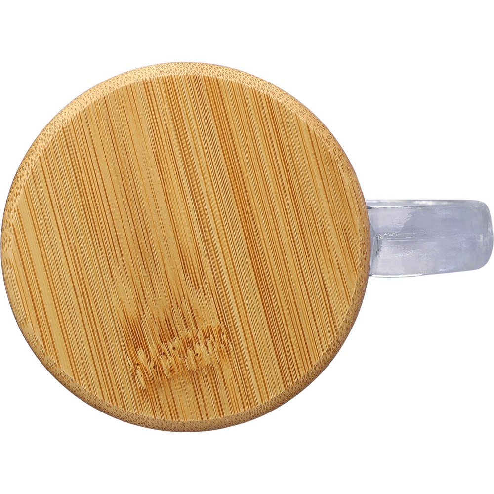 Szklany kubek 300 ml, bambusowa pokrywka, która może służyć jako podstawka, zapakowany w brązowy kartonik, produkt wykonany ze szkła z recyklingu