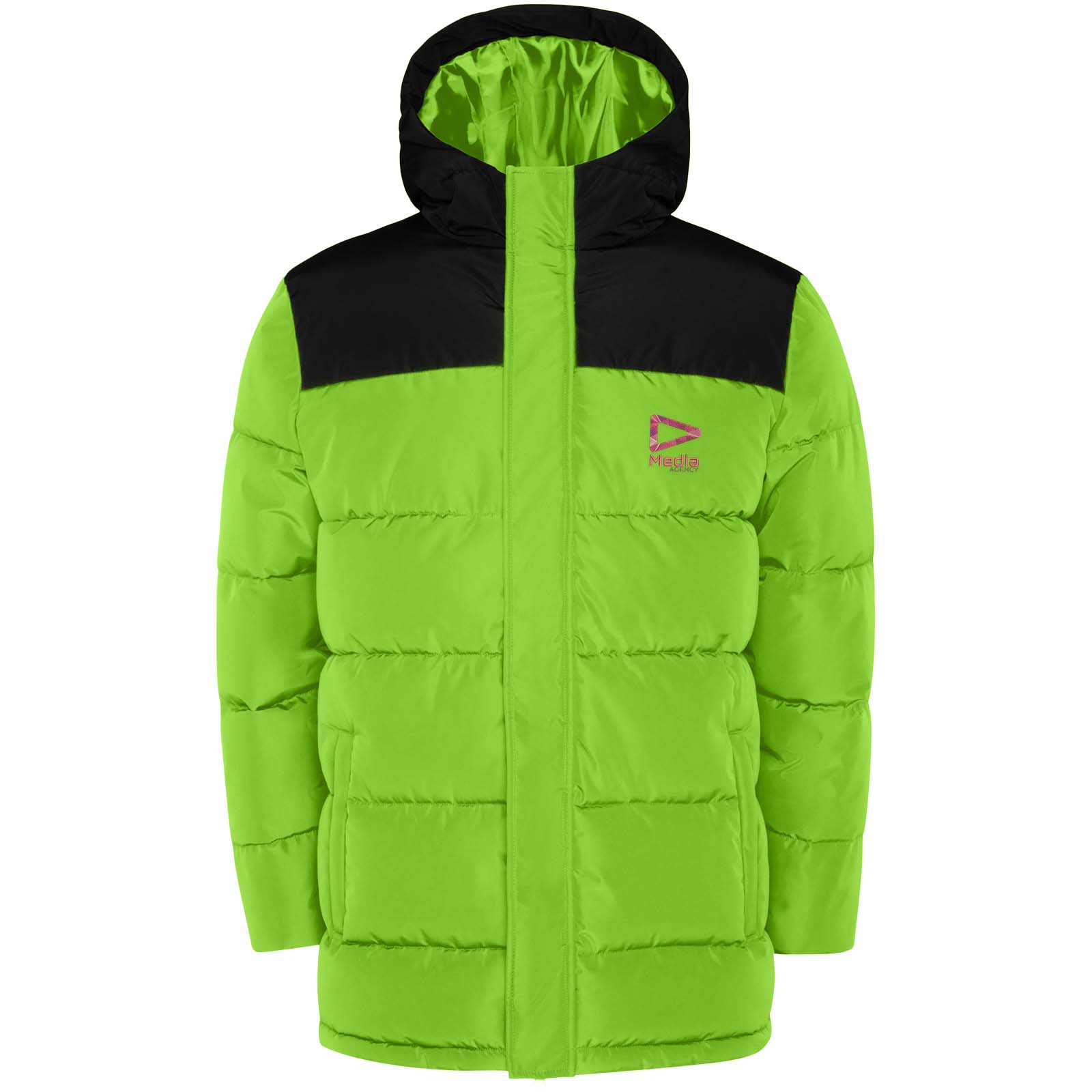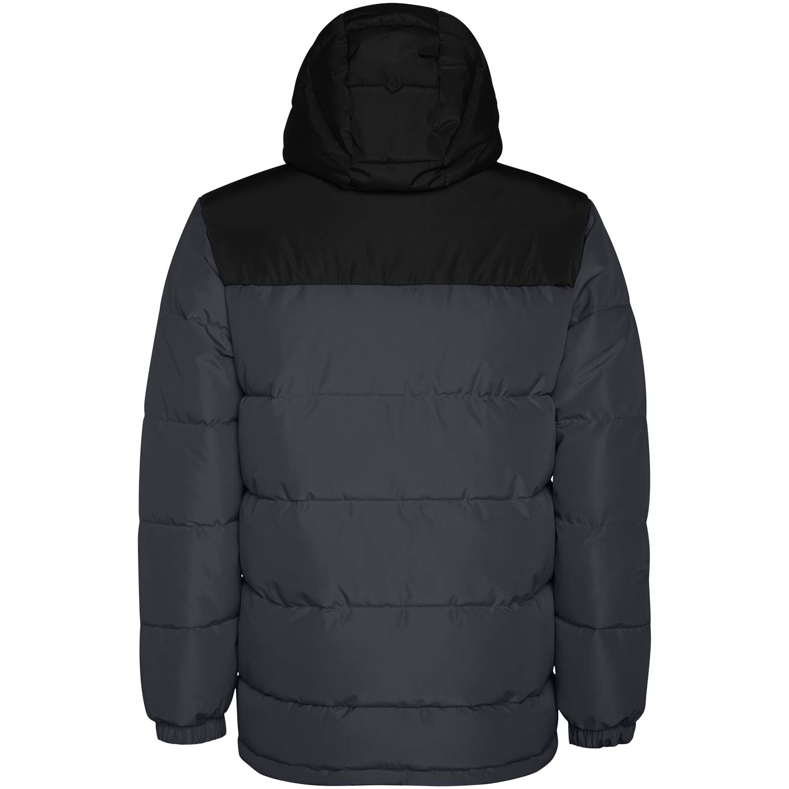 Ocieplana kurtka ze stałym kapturem. Zamek błyskawiczny z przodu kryty plisą. Osłona podbródka. Dwie boczne kieszenie zapinane na zamek. Elastyczne mankiety.