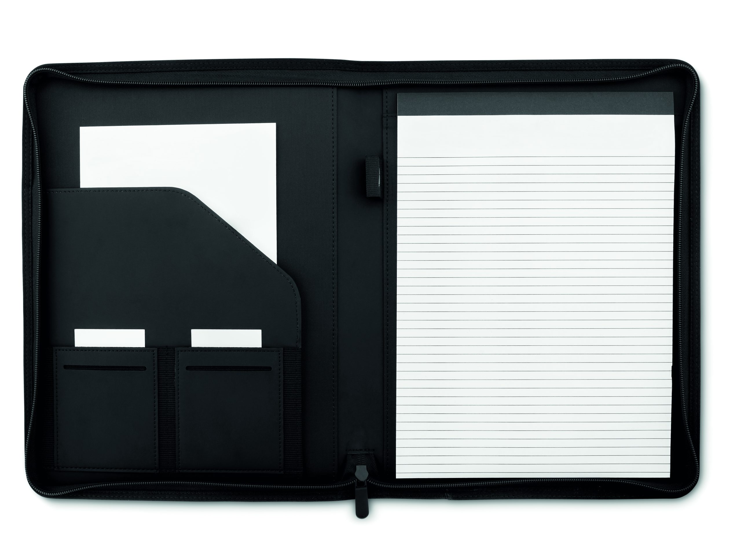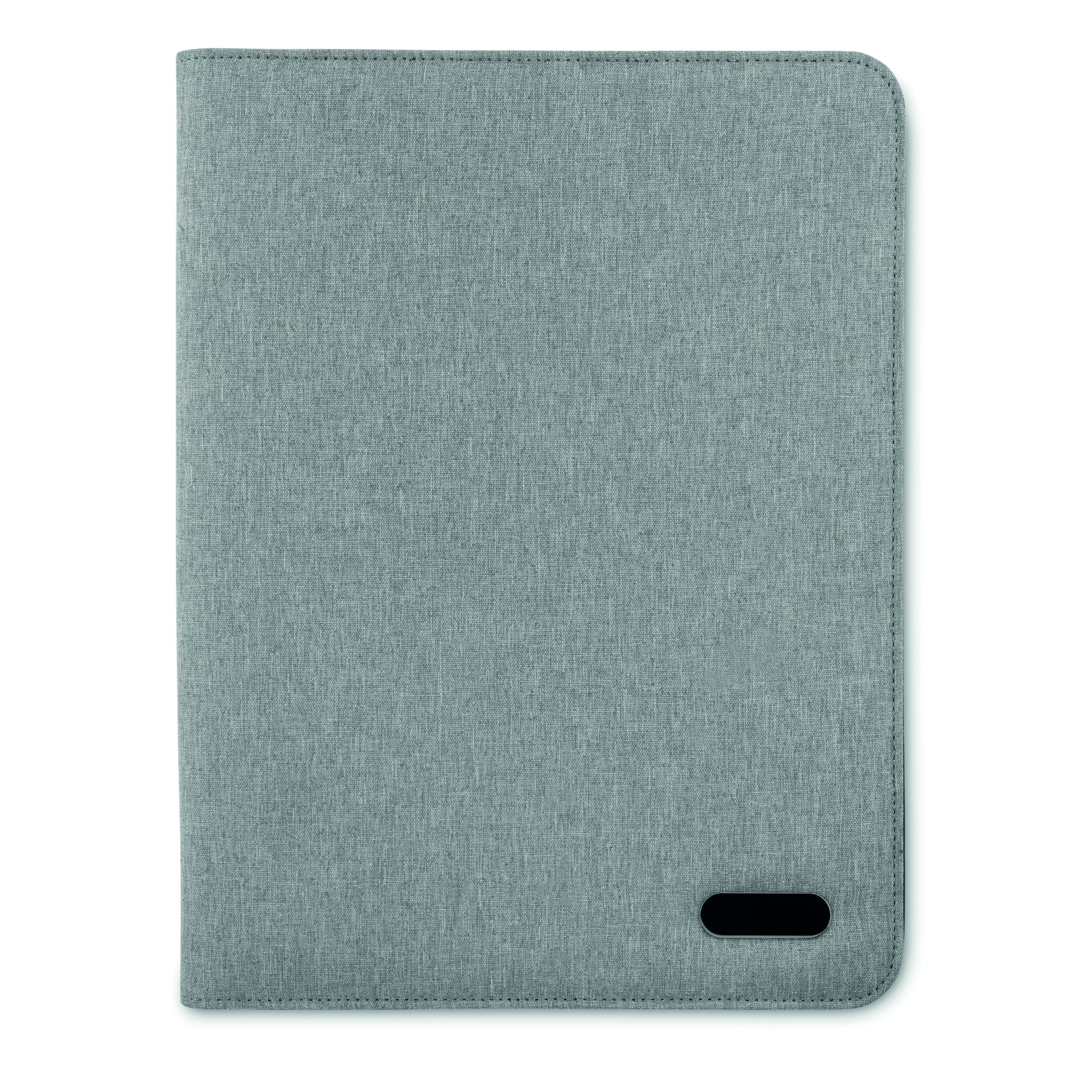 Teczka konferencyjna A4 z dwukolorowego poliestru. Zapinana na zamek błyskawiczny. Notatnik z 20 stronami w linie. 3 przegródki. Uchwyt na długopis.