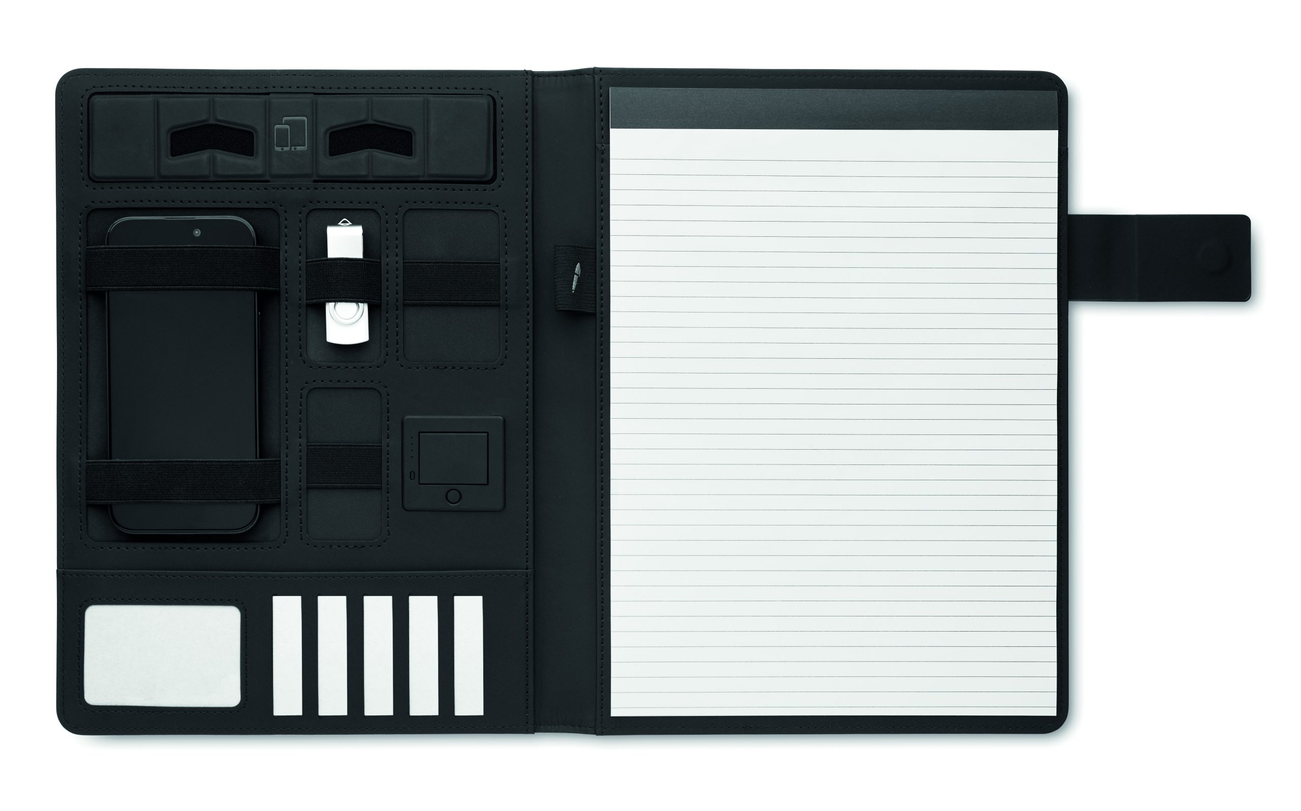 Teczka konferencyjna A4 z płócienną okładką z PU. Power bank 5000 mAh i magnetyczna ładowarka bezprzewodowa 15 W. notatnik z 20 kartkami w linie. Wiele wewnętrznych przegródek. Magnetyczne zamknięcie. Elastyczny uchwyt na długopis.