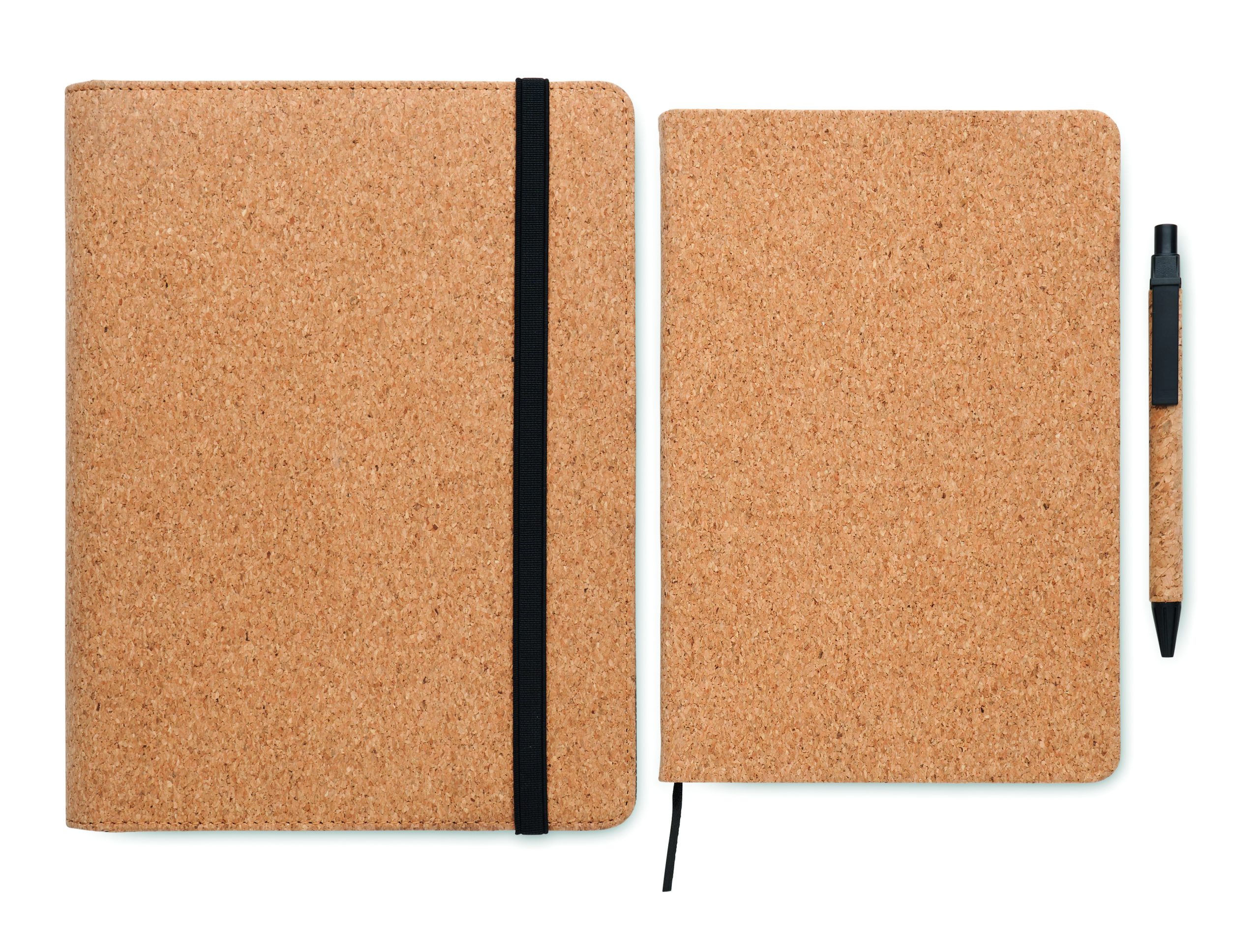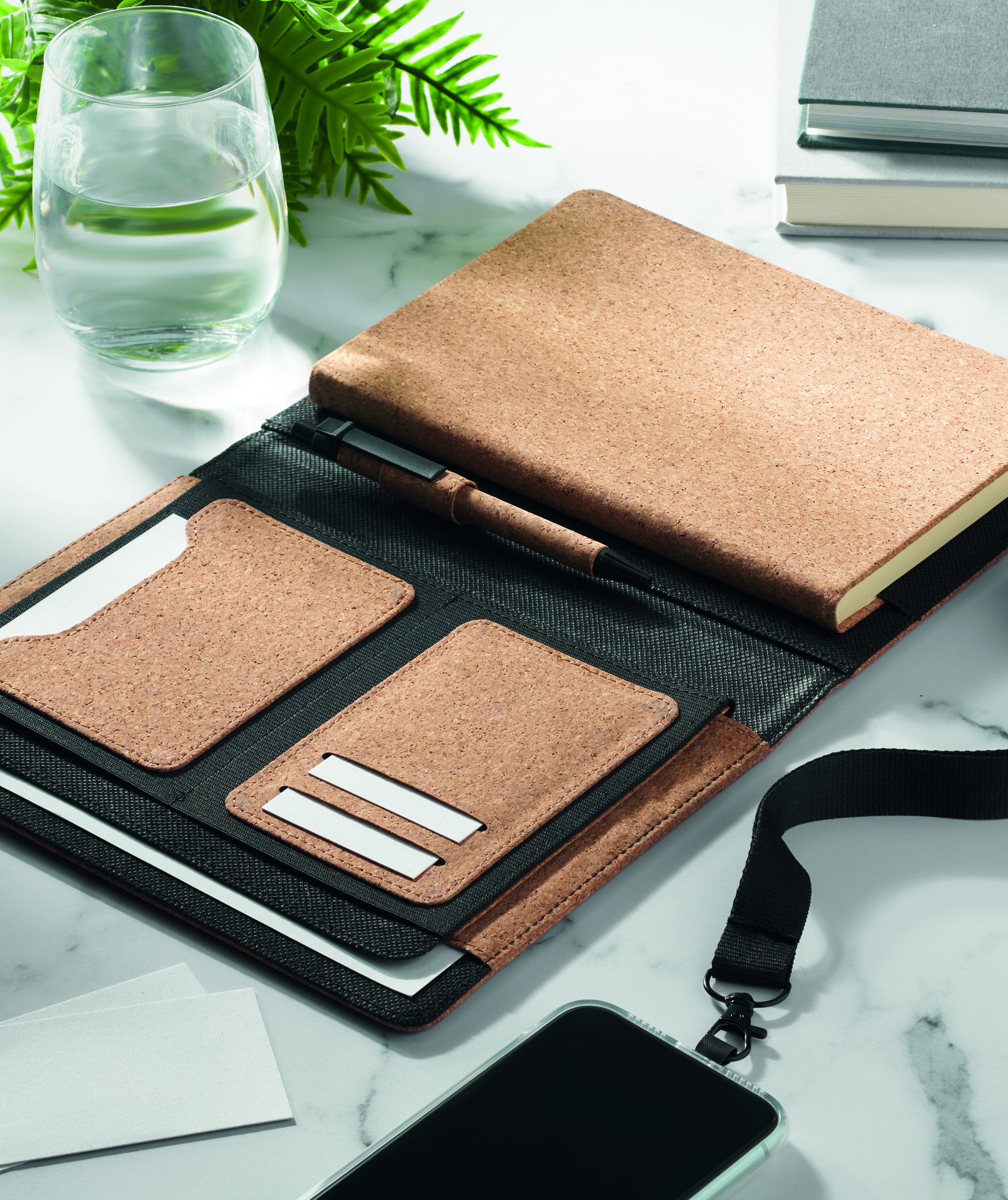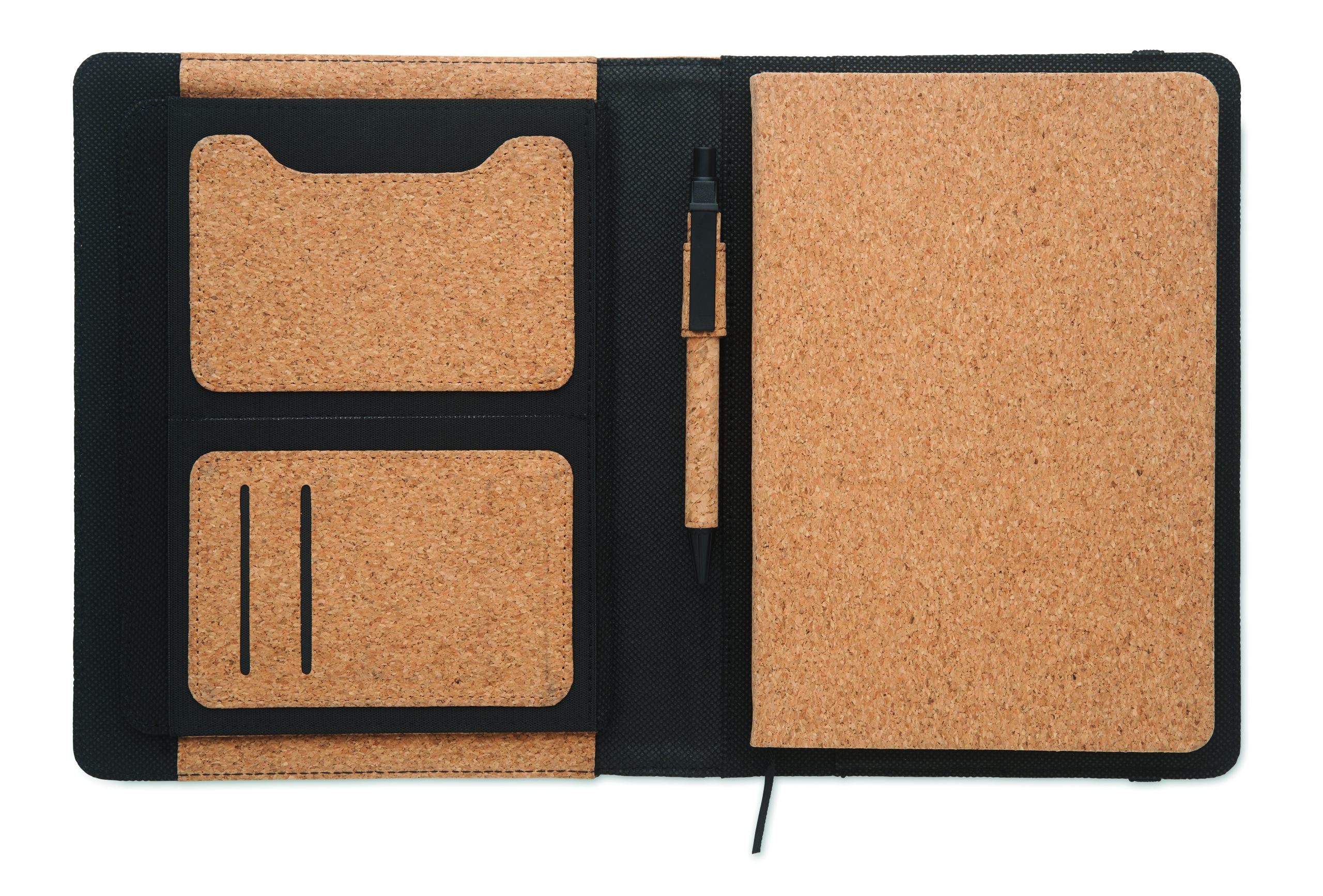 Teczka A5 z korkiem. Notatnik A5 z twardą, korkową okładką, 192 strony w linie z papieru z recyklingu (96 arkuszy). Dopasowany uchwyt na długopis i pióro. 2 kieszonki na karty i jedna duża przegroda. Elastyczny pasek zamykający.