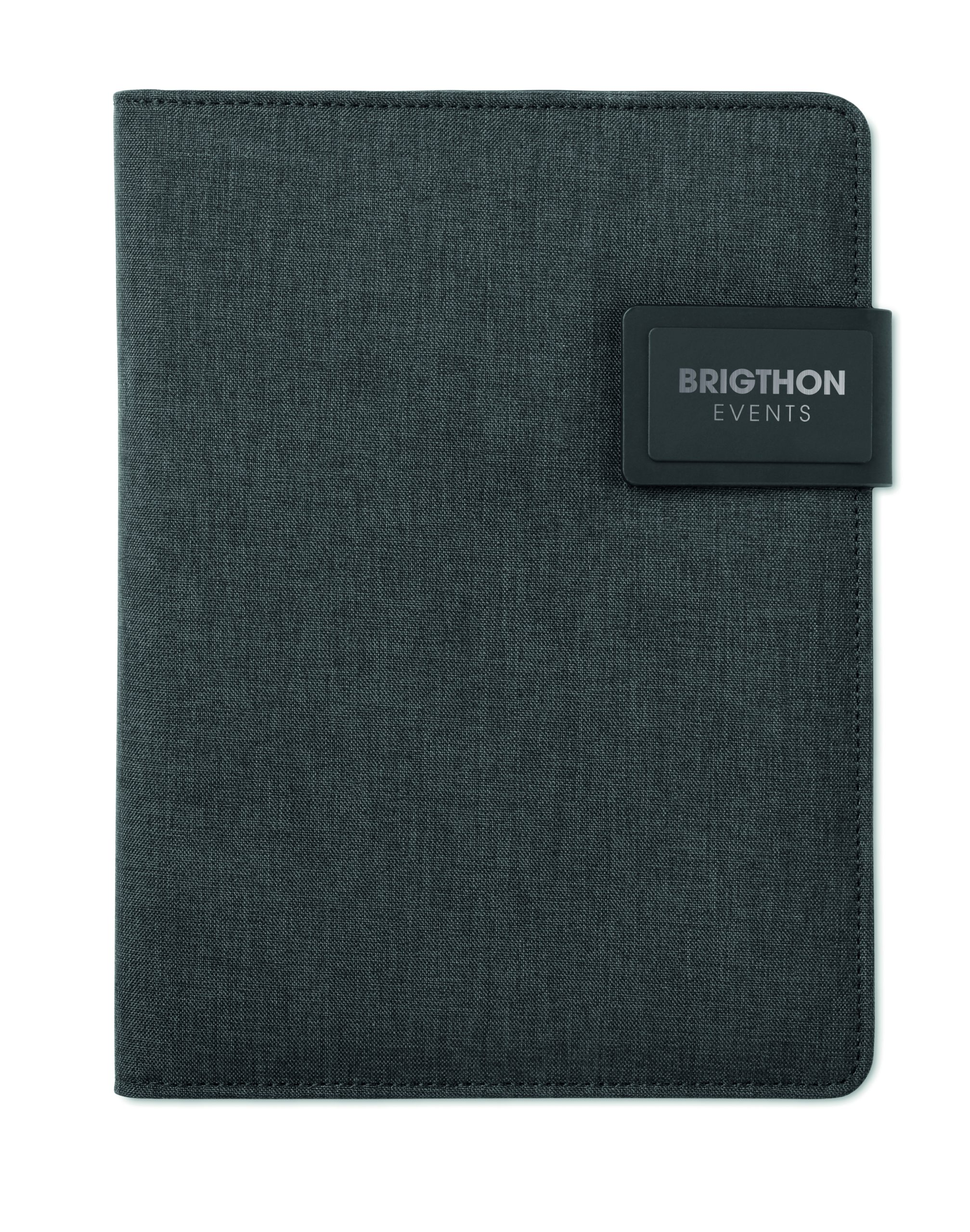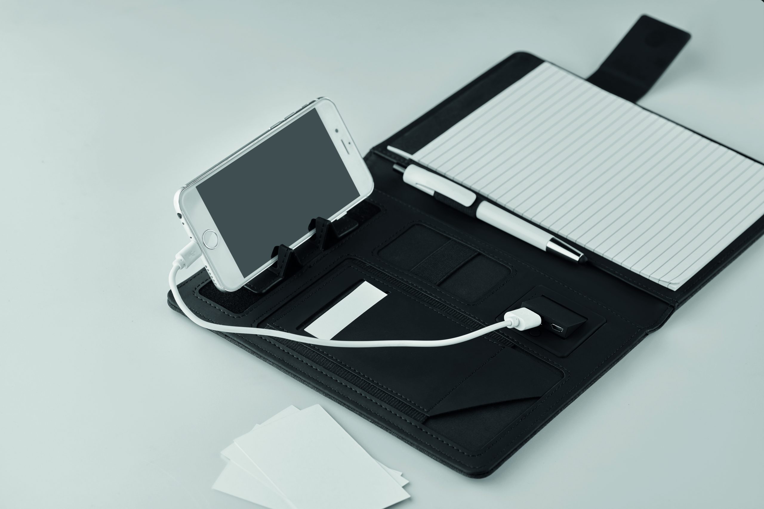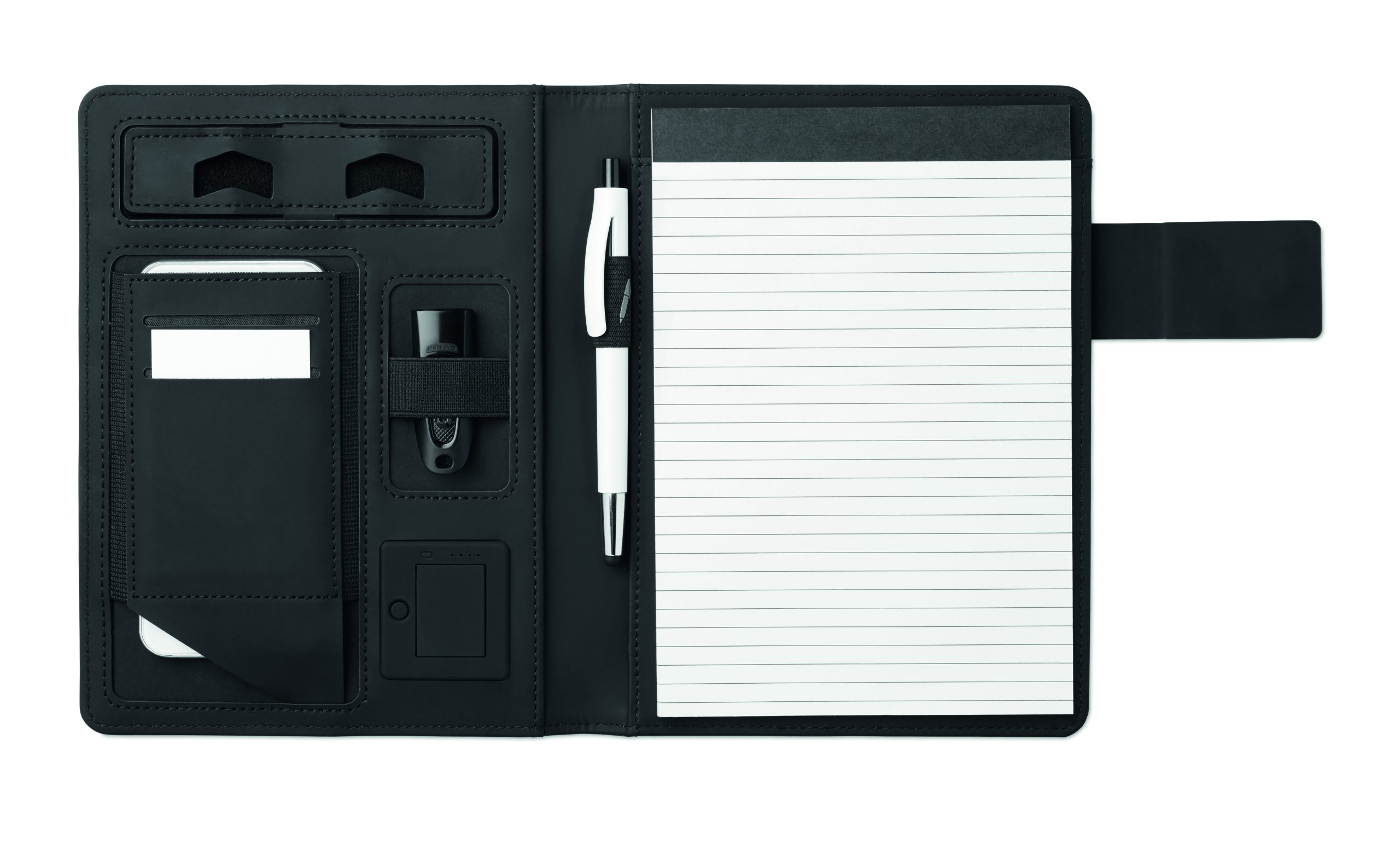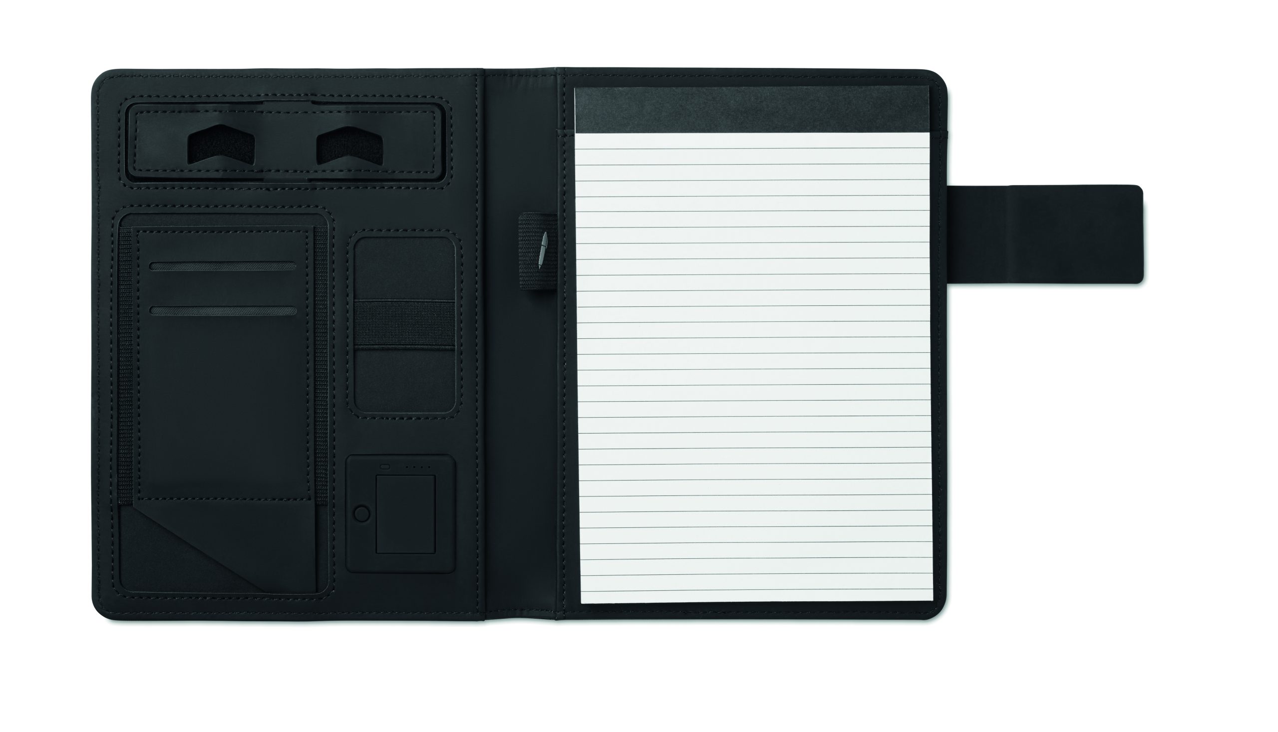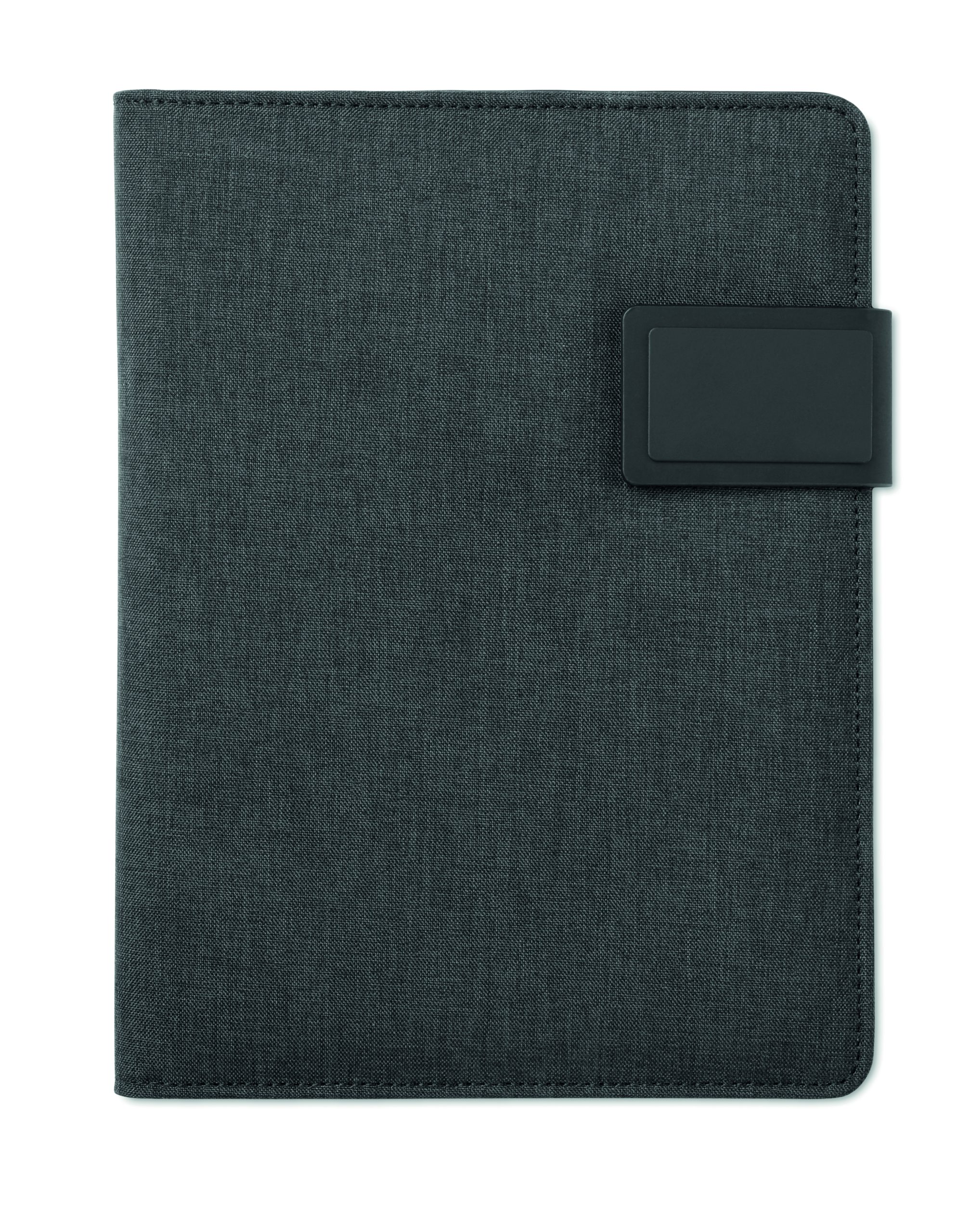 Teczka konferencyjna A5 z okładką z płótna PU. Powerbank o pojemności 4000 mAh. Wbudowane złącze micro USB do złącza typu C. Notatnik z 20 kartkami w linie. Wiele wewnętrznych przegródek. Zamknięcie magnetyczne. Elastyczny uchwyt na długopis.