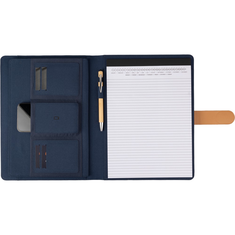 Teczka konferencyjna w formacie ok. A4, zawiera notatnik z 20 kartkami w linie, przegródki na dokumenty i pętelkę na długopis, zamknięcie magnetyczne, pakowany pojedynczo w kraftowy rękaw, produkt wykonany z RPET