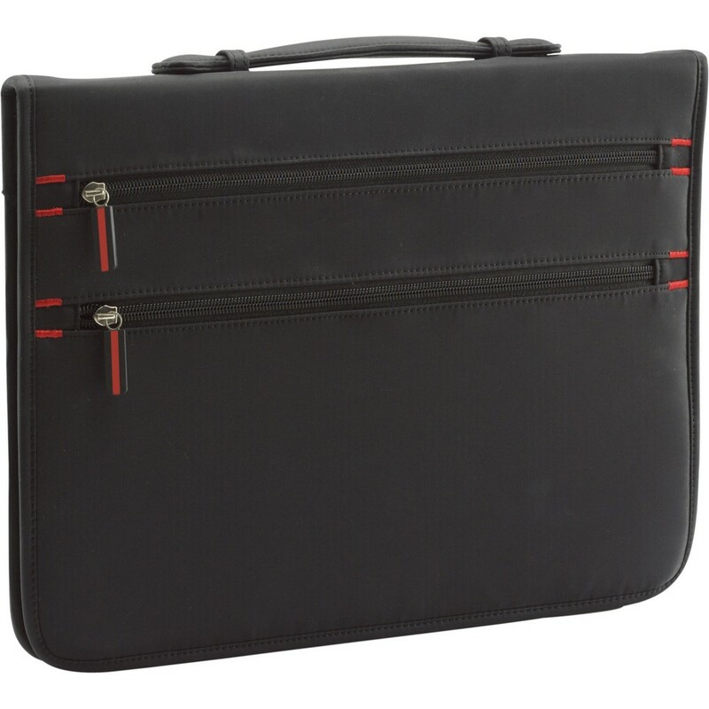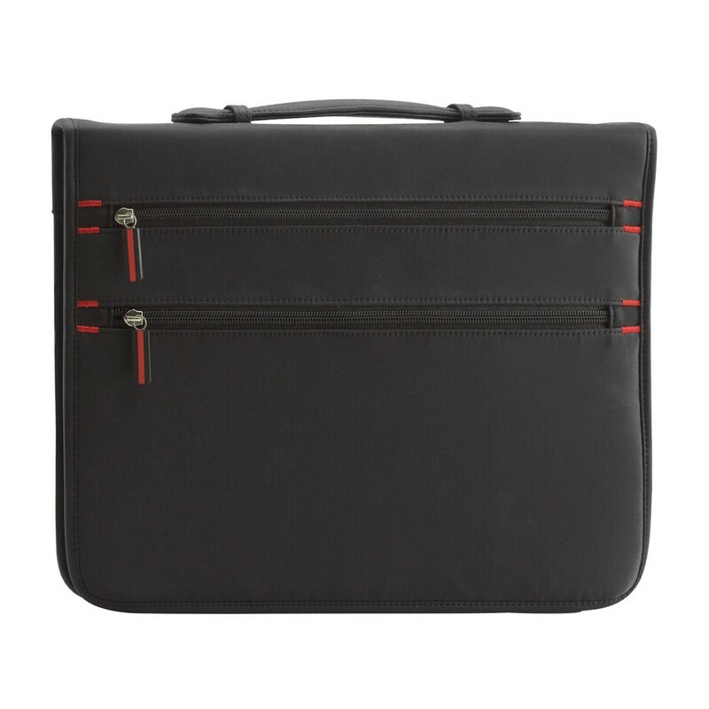 Teczka konferencyjna ok. A4 na zamek, kalkulator i notatnik (20 kartek w linie, jednostronnie), miejsce na przybory do pisania, 2 zewnętrzne kieszenie na zamek, w środku 1 kieszeń na zamek i 4 miejsca na karty kredytowe