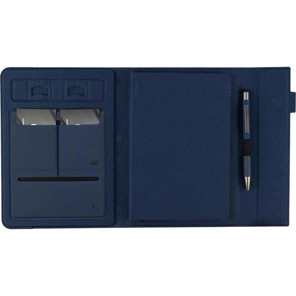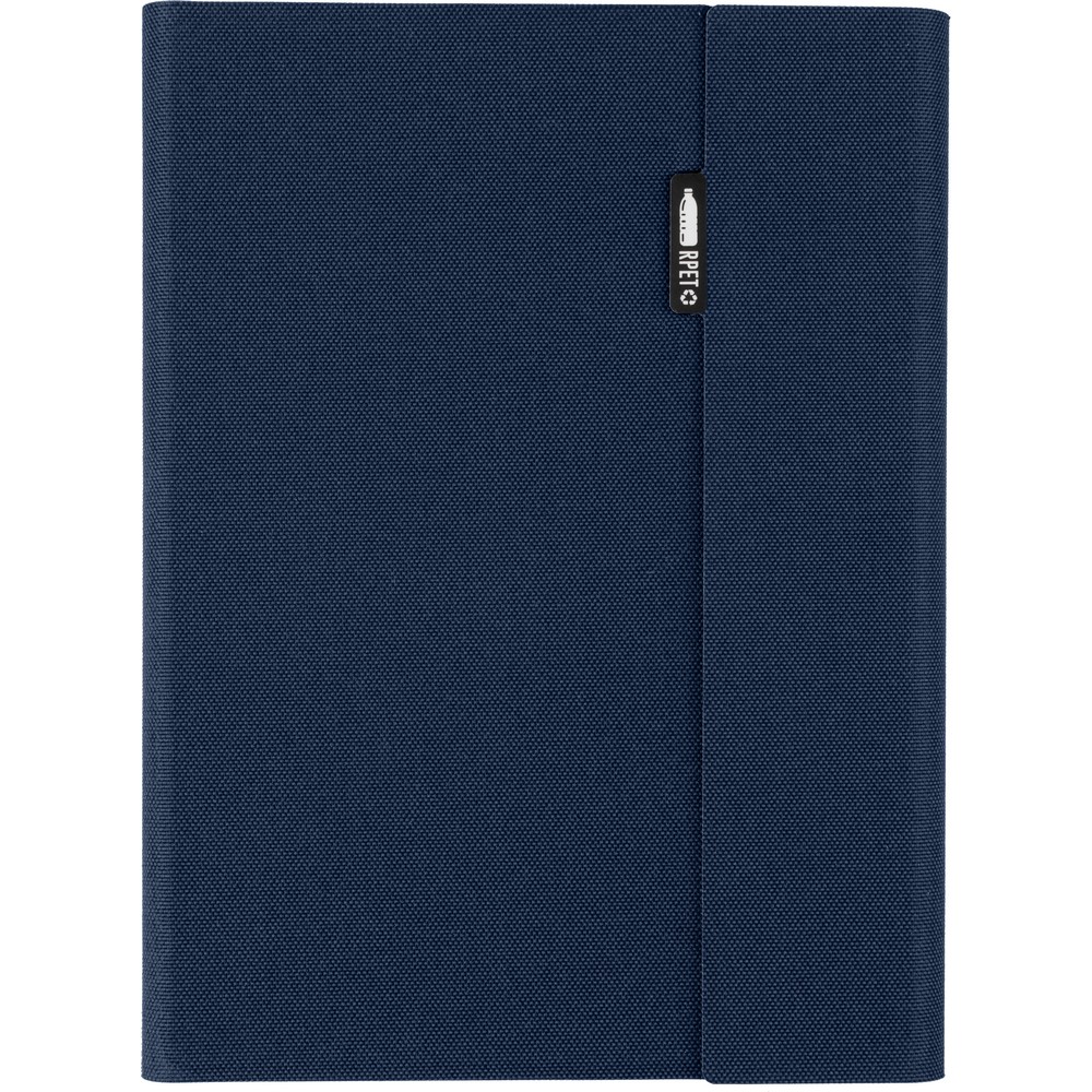 Teczka konferencyjna w formacie ok. A5, zawiera notatnik posiada 64 kartki w linie, przegródki na dokumenty, uchwyt na telefon, zamknięcie magnetyczne, pakowany pojedynczo w kraftowy rękaw, produkt wykonany z RPET