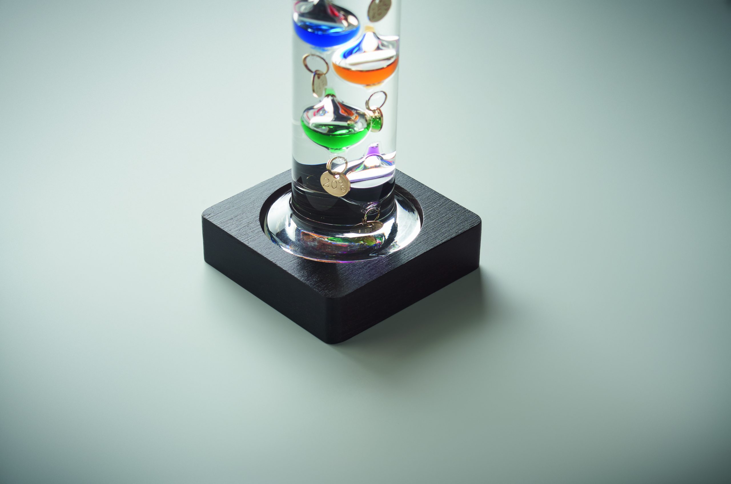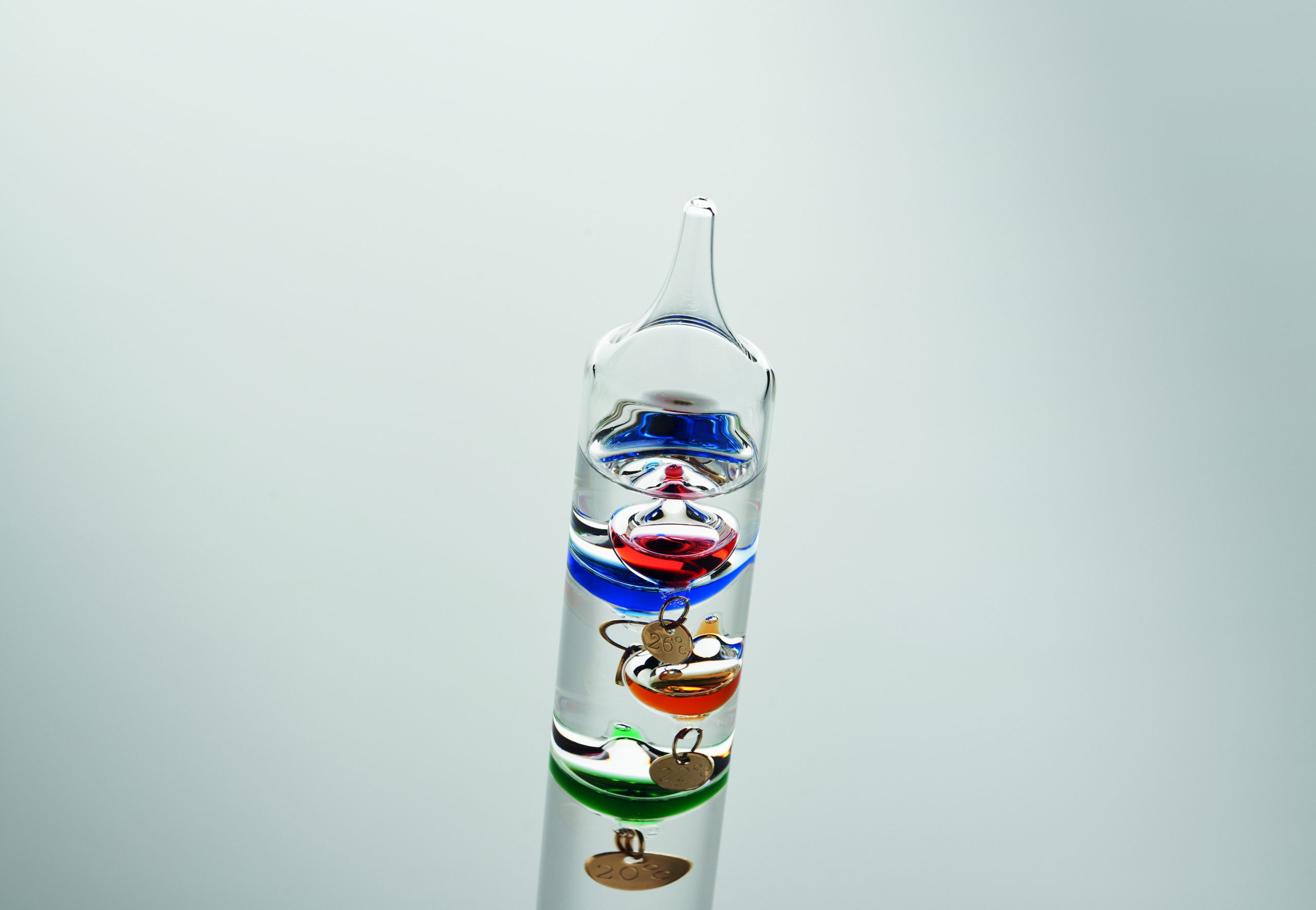 Szklany termometr Galileo z pięcioma kolorowymi pływającymi kulami. Każda kula wskazuje temperaturę od 18°c do 26°: Czerwona – 26°, Niebieska – 24°, Pomarańczowa – 22°, Zielona – 20° i Fioletowa – 18°. Najniższa kula w górnej grupie wskazuje temperaturę otoczenia.