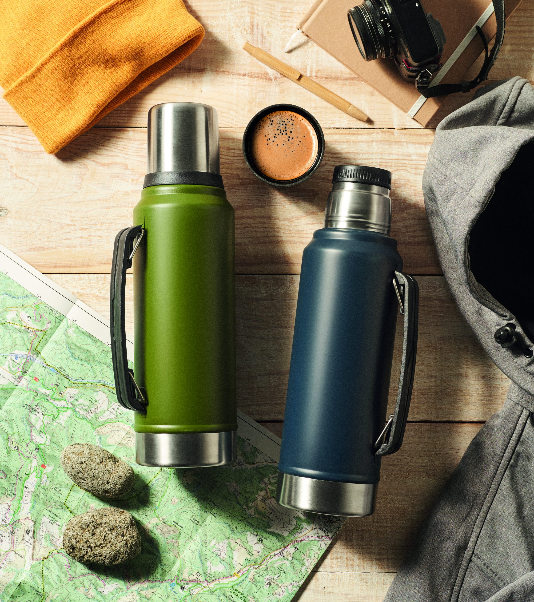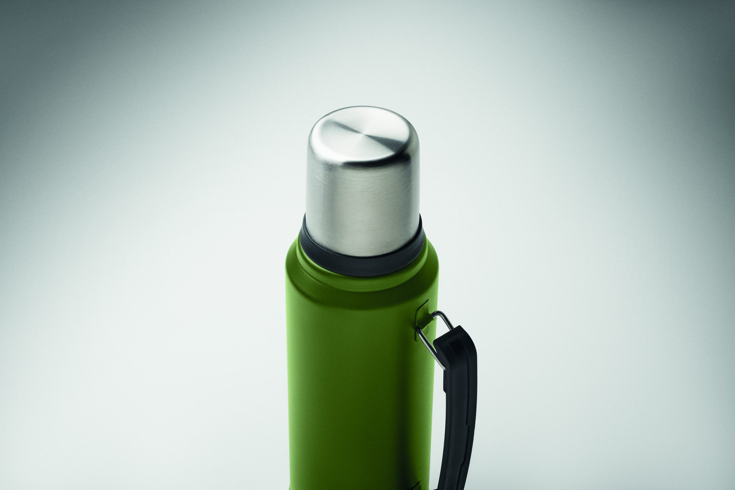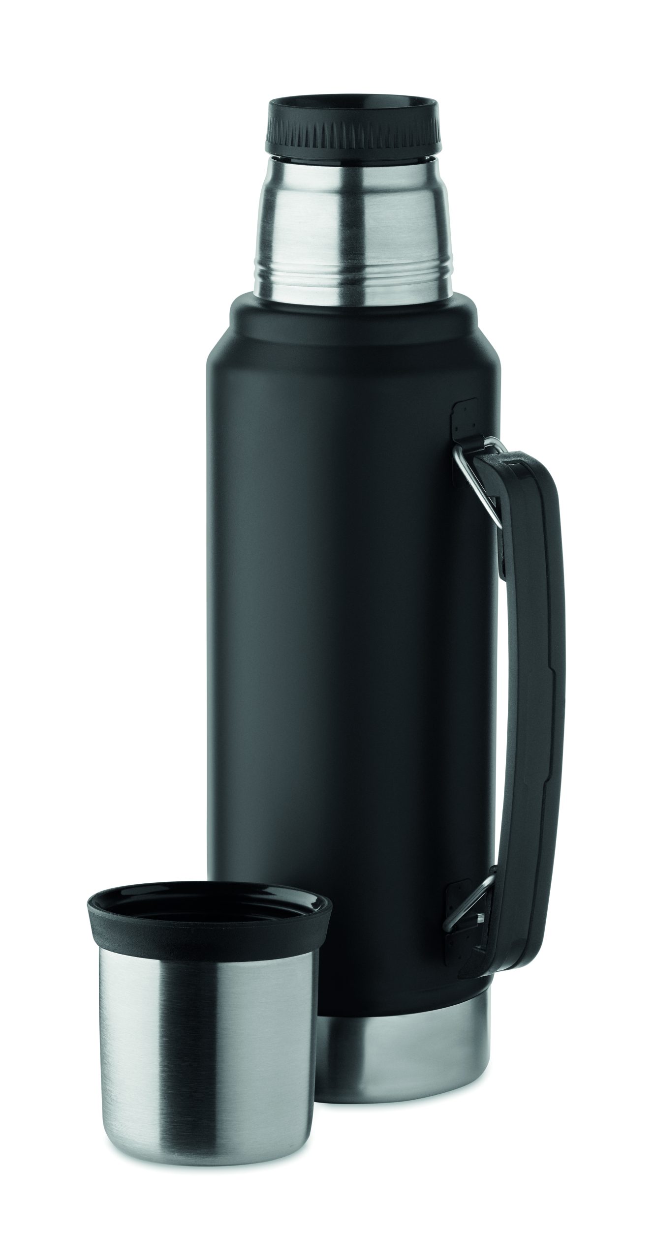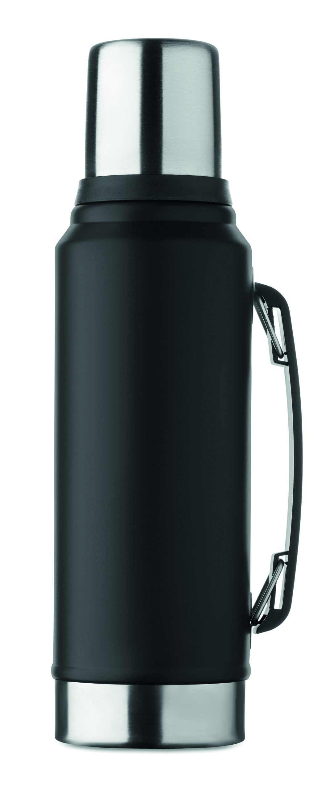 Dwuścienny termos z izolacją próżniową wykonany ze stali nierdzewnej z recyklingu (90% stali nierdzewnej pochodzącej z recyklingu i 10% stali nierdzewnej) z uchwytem z boku. Z pokrywką z PP i kubkiem z recyklingowanej stali nierdzewnej. Nie przecieka. Pojemność: 1 l.