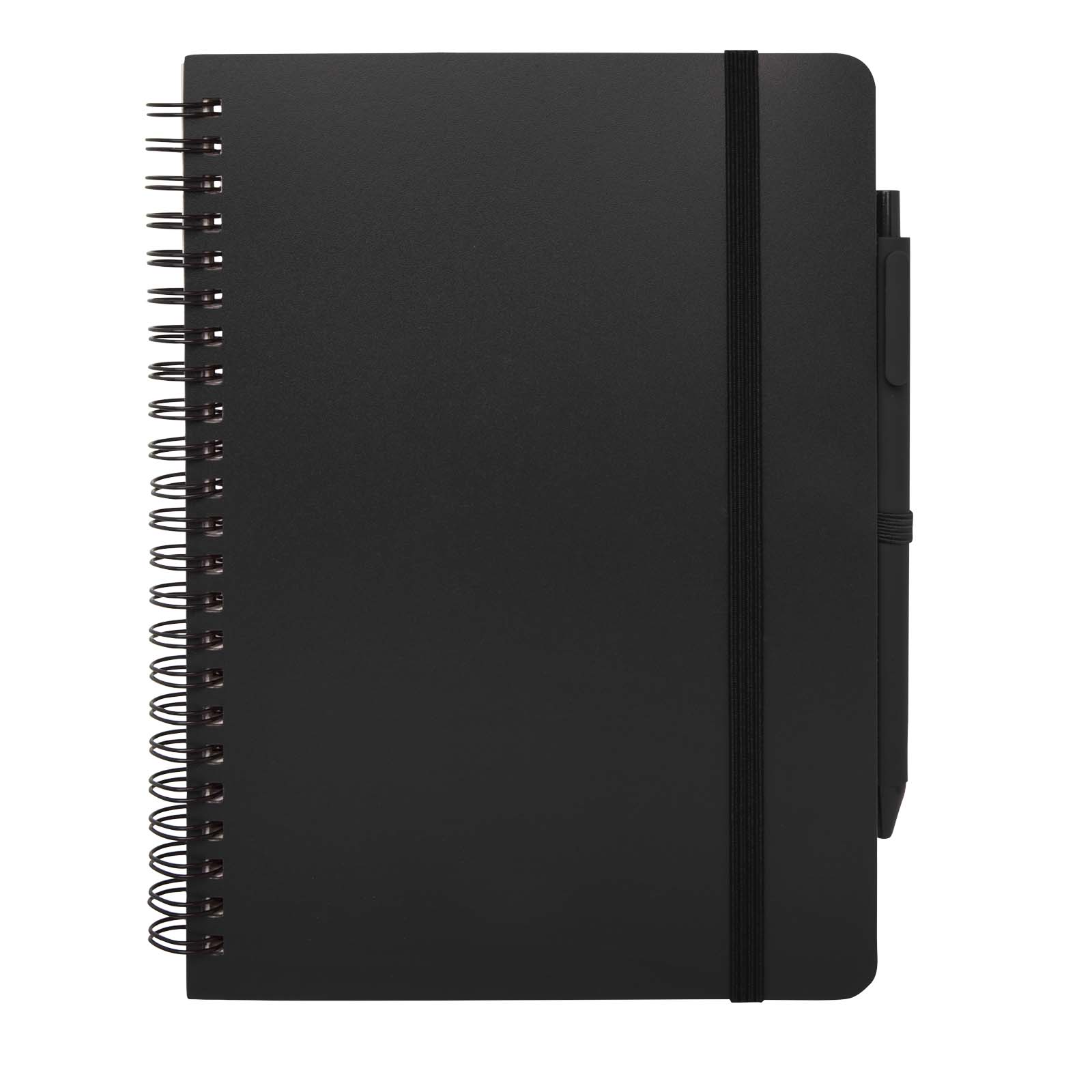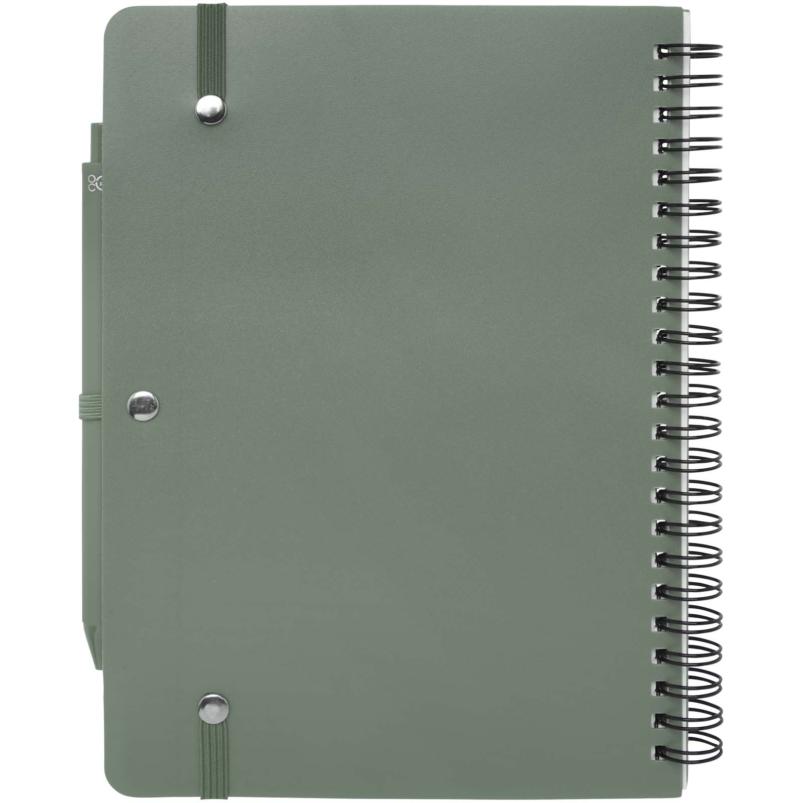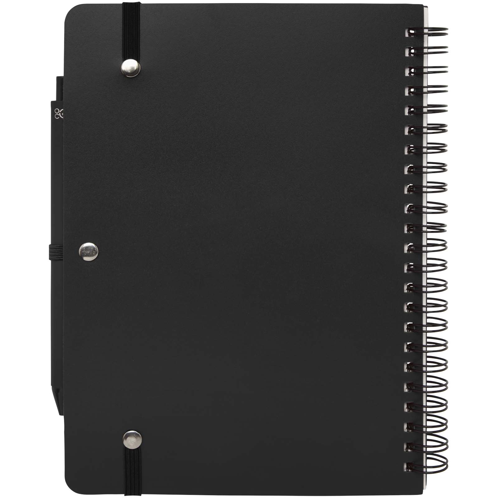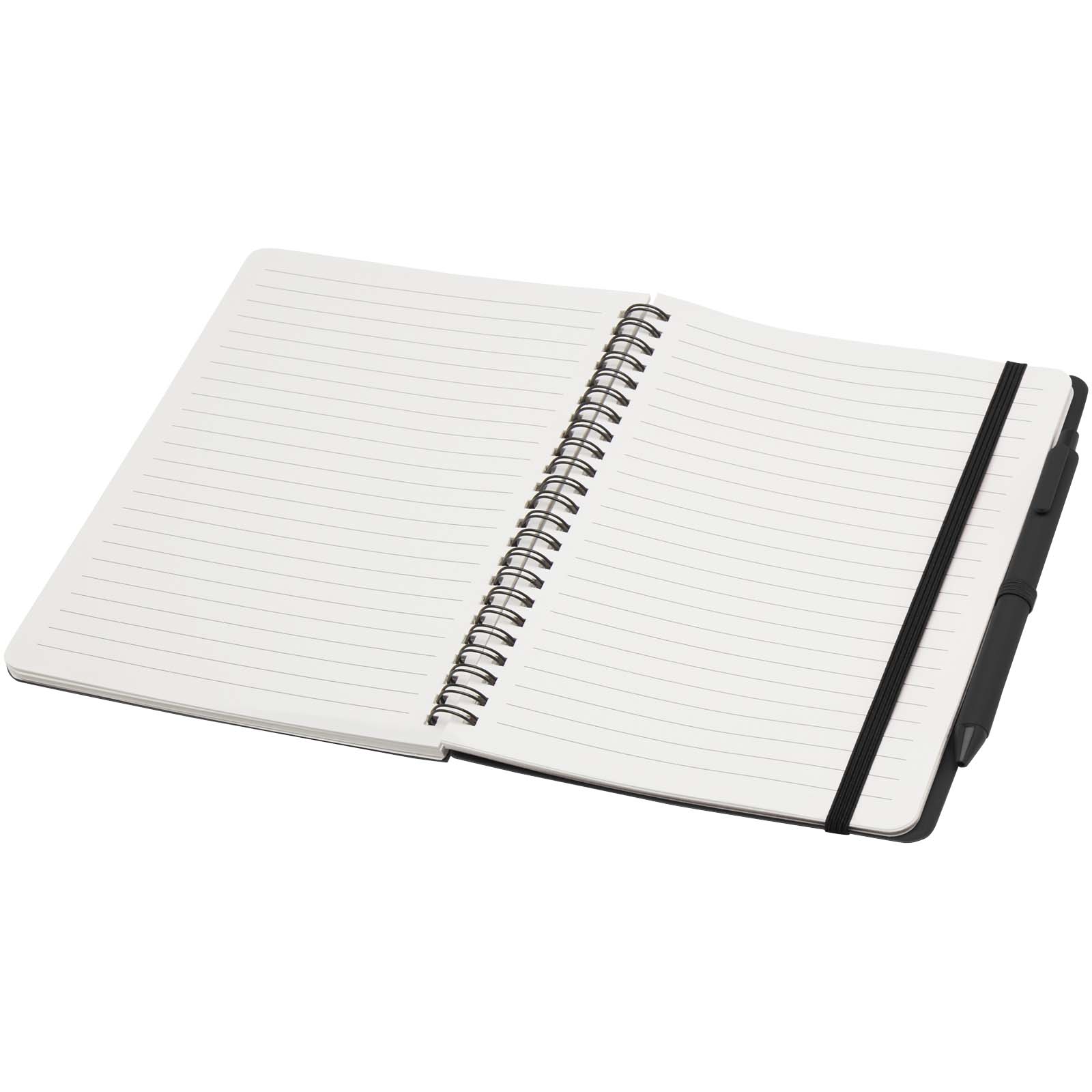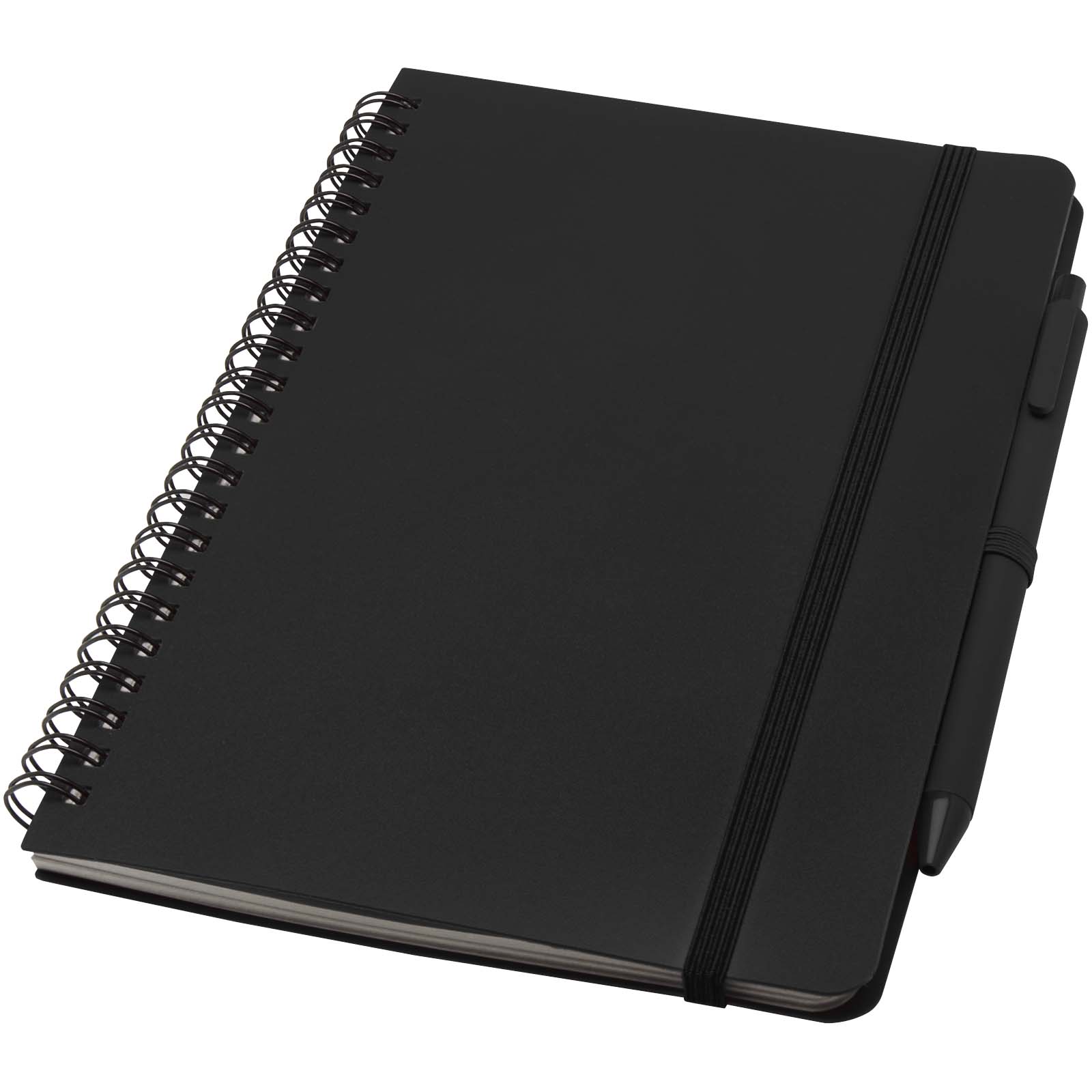 Notatnik w twardej oprawie Thalaasa w formacie A5 jest wykonany z przetworzonego plastiku pochodzącego z oceanów i zawiera 80 kartek w linie o gramaturze 70 g/m² w kolorze kremowym. Notatnik ma zaokrąglone rogi, elastyczne zamknięcie i szlufkę na długopis. Długopis z czarnym tuszem również został wykonany z plastiku pochodzącego z recyklingu i wyrzuconego do oceanu. Żywotność: 1000 metrów. Rozmiar stalówki: 1,0 mm.