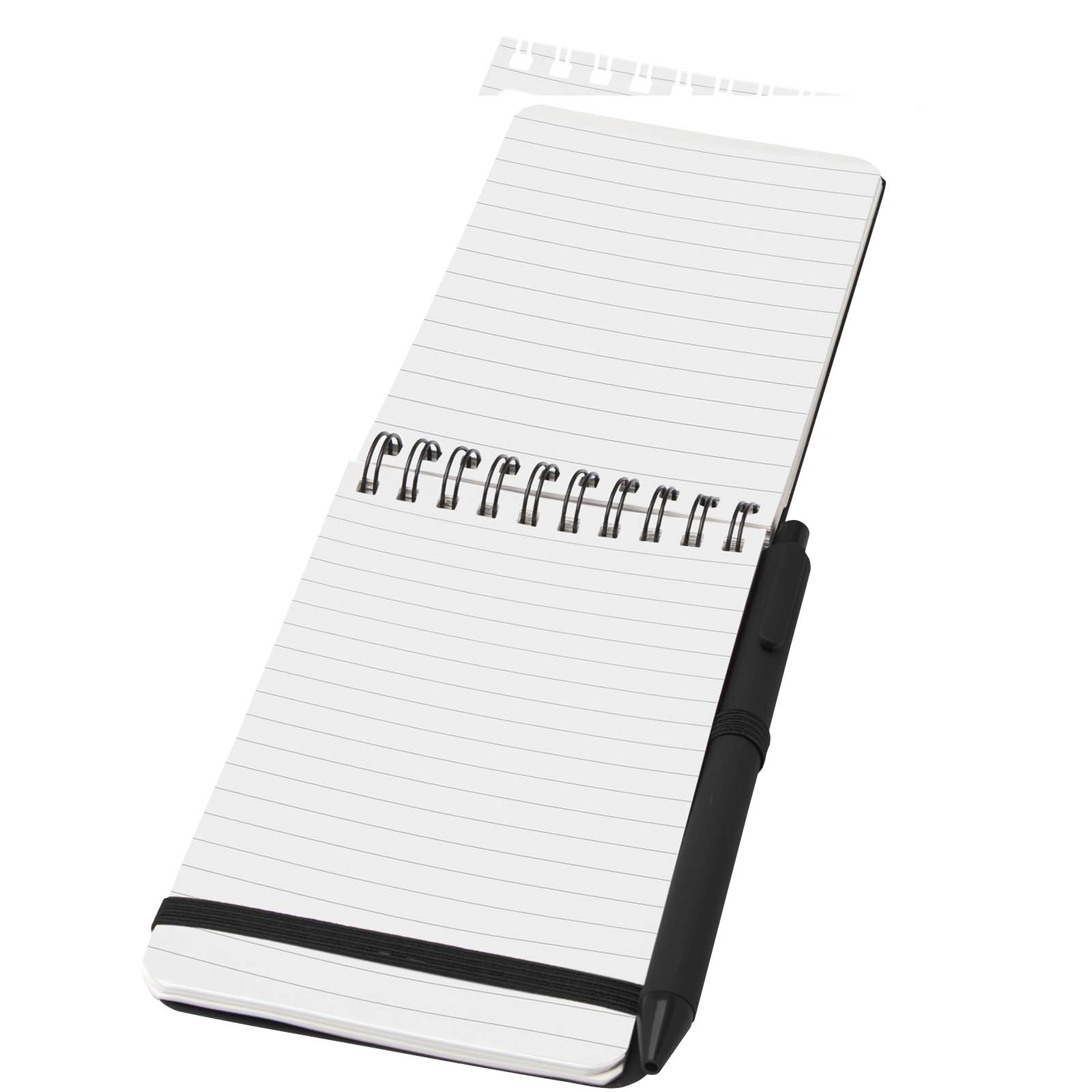 Notatnik w twardej oprawie Thalaasa w formacie A6 jest wykonany z przetworzonego plastiku pochodzącego z oceanów i zawiera 80 kartek w linie o gramaturze 70 g/m² w kolorze kremowym. Notatnik ma zaokrąglone rogi, elastyczne zamknięcie i szlufkę na długopis. Długopis z czarnym tuszem również został wykonany z plastiku pochodzącego z recyklingu i wyrzuconego do oceanu. Żywotność: 1000 metrów. Rozmiar stalówki: 1,0 mm.