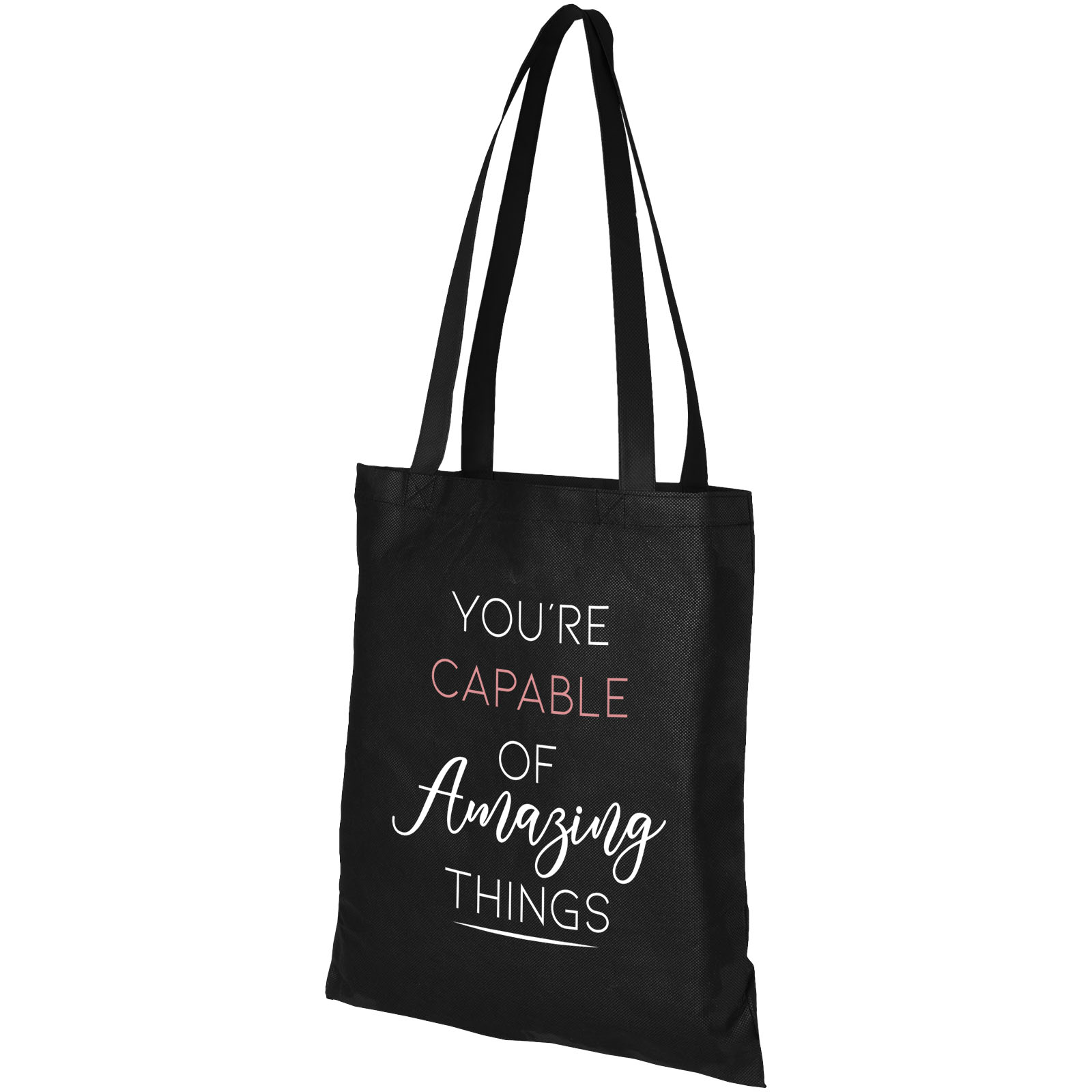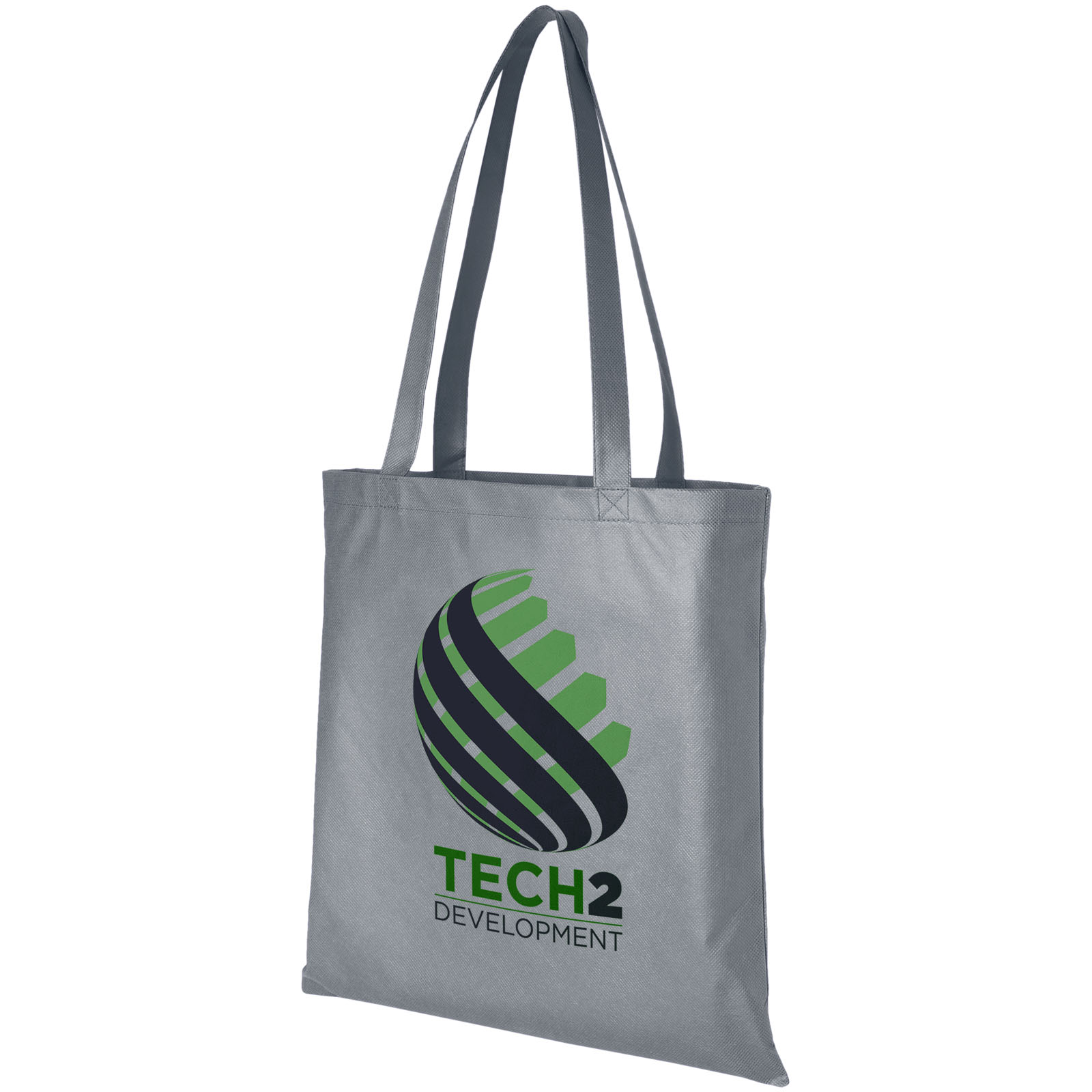 Potrzebujesz dobrej torby na każde targi lub konferencję? Duża torba z włókniny Zeus to doskonała opcja. Jej smukły design sprawia, że jest to model elegancki i odpowiedni do przenoszenia lekkich przedmiotów, takich jak notatnik i długopis. Rączki mają długość 29 cm, dzięki czemu można ją łatwo przewiesić przez ramię.