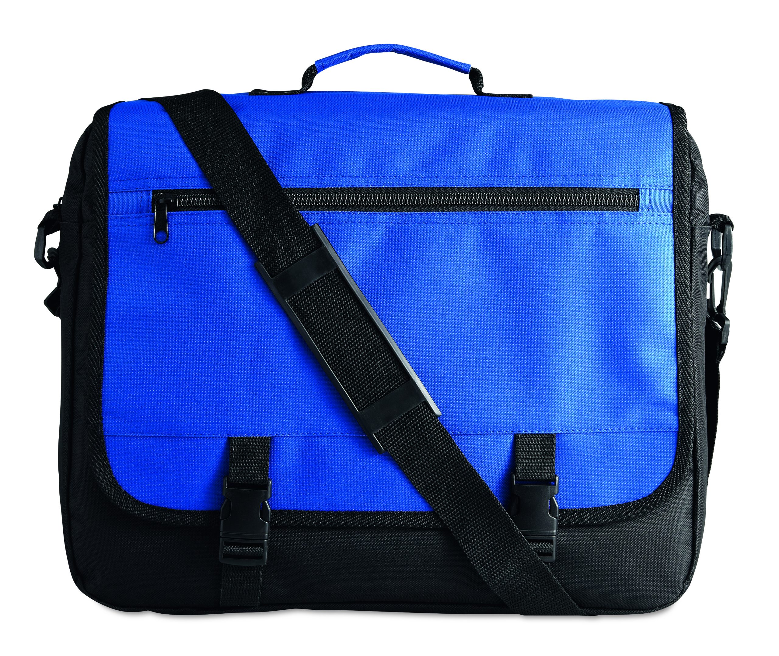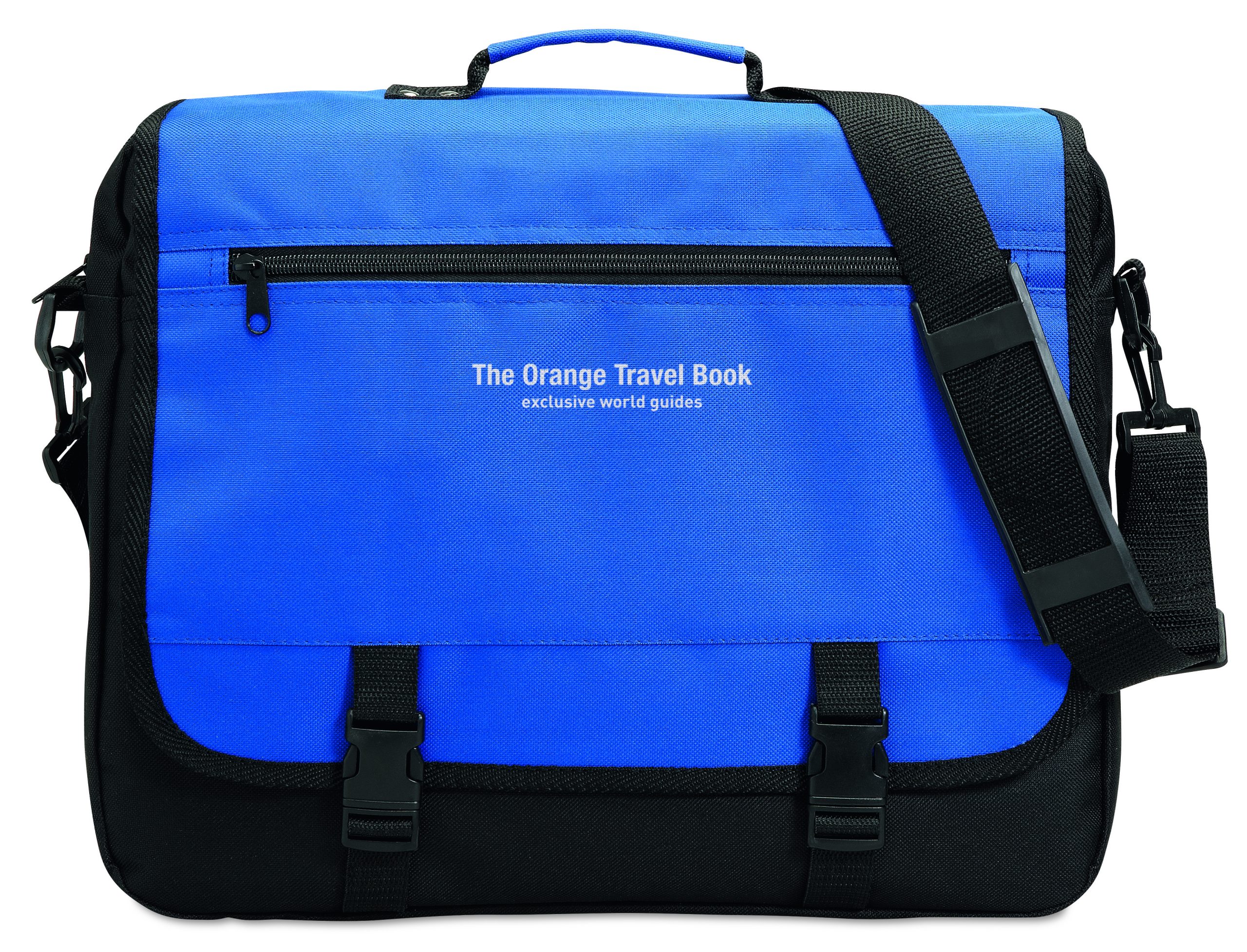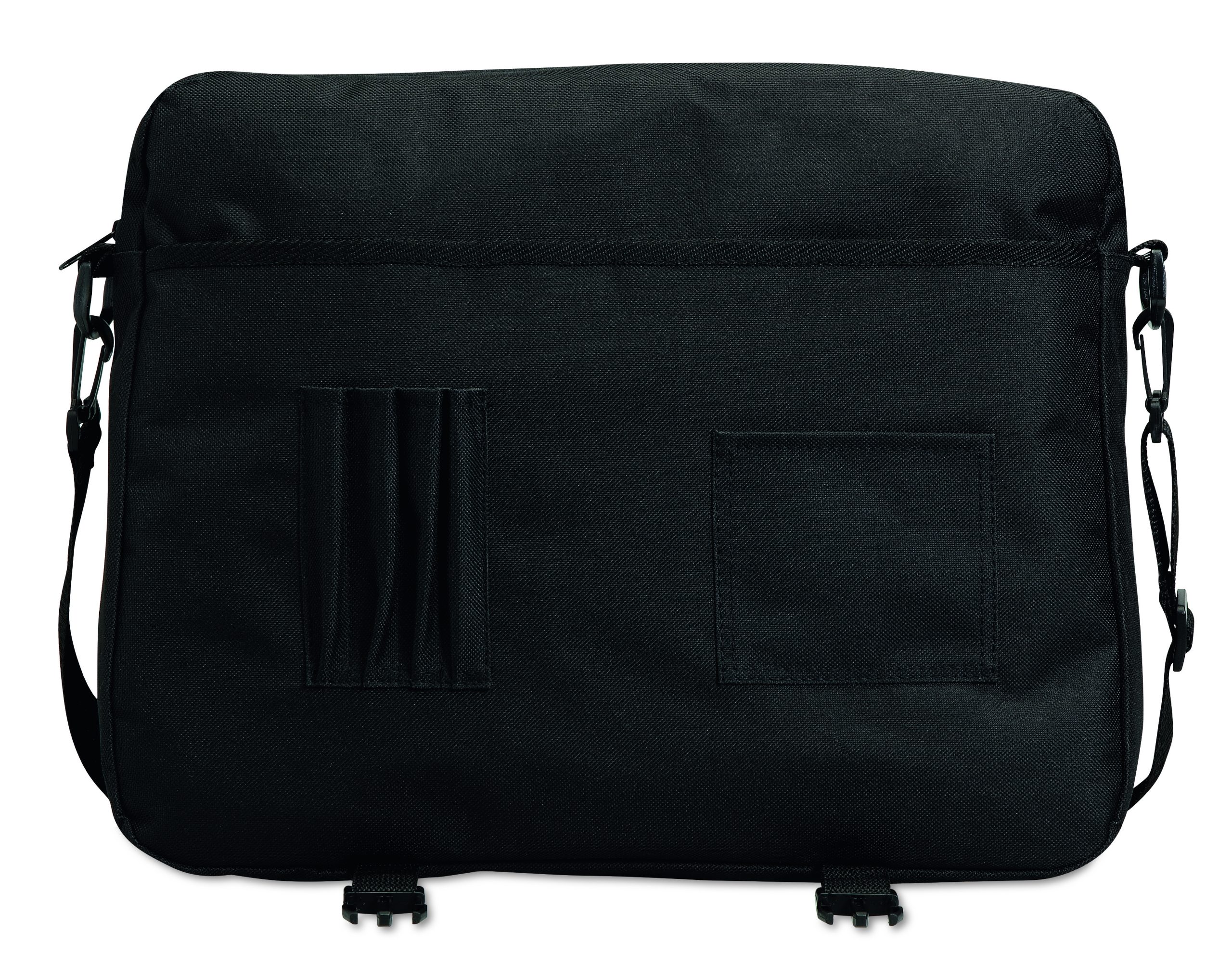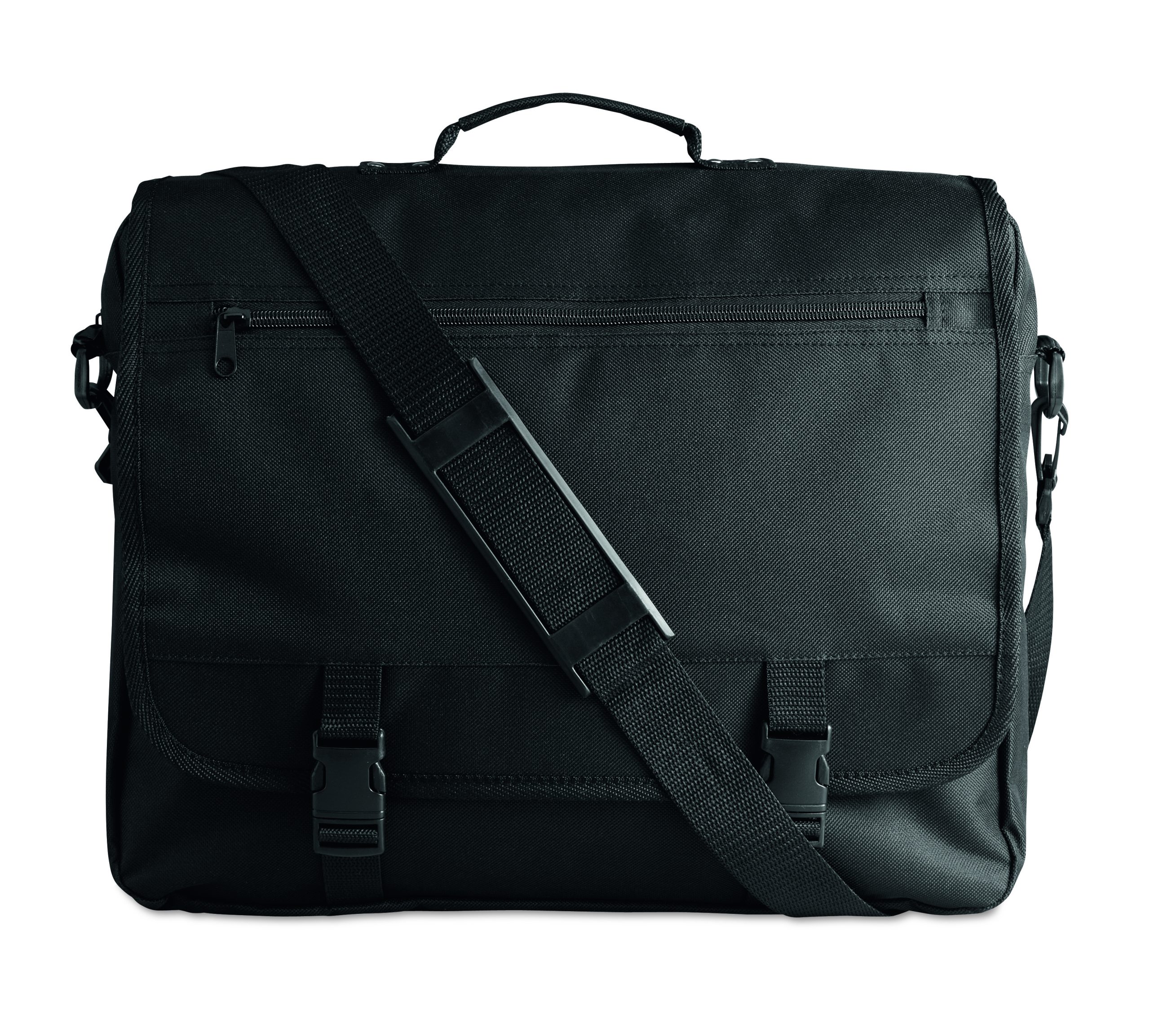 Torba na dokumenty z przednią kieszenią zamykaną na zamek oraz 2 klamry. Wykonana z poliestru 600D. Odpinany i regulowany pasek na ramię.
