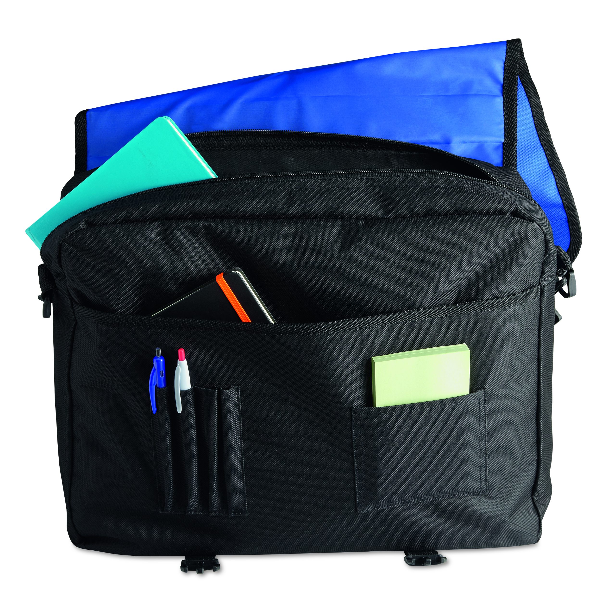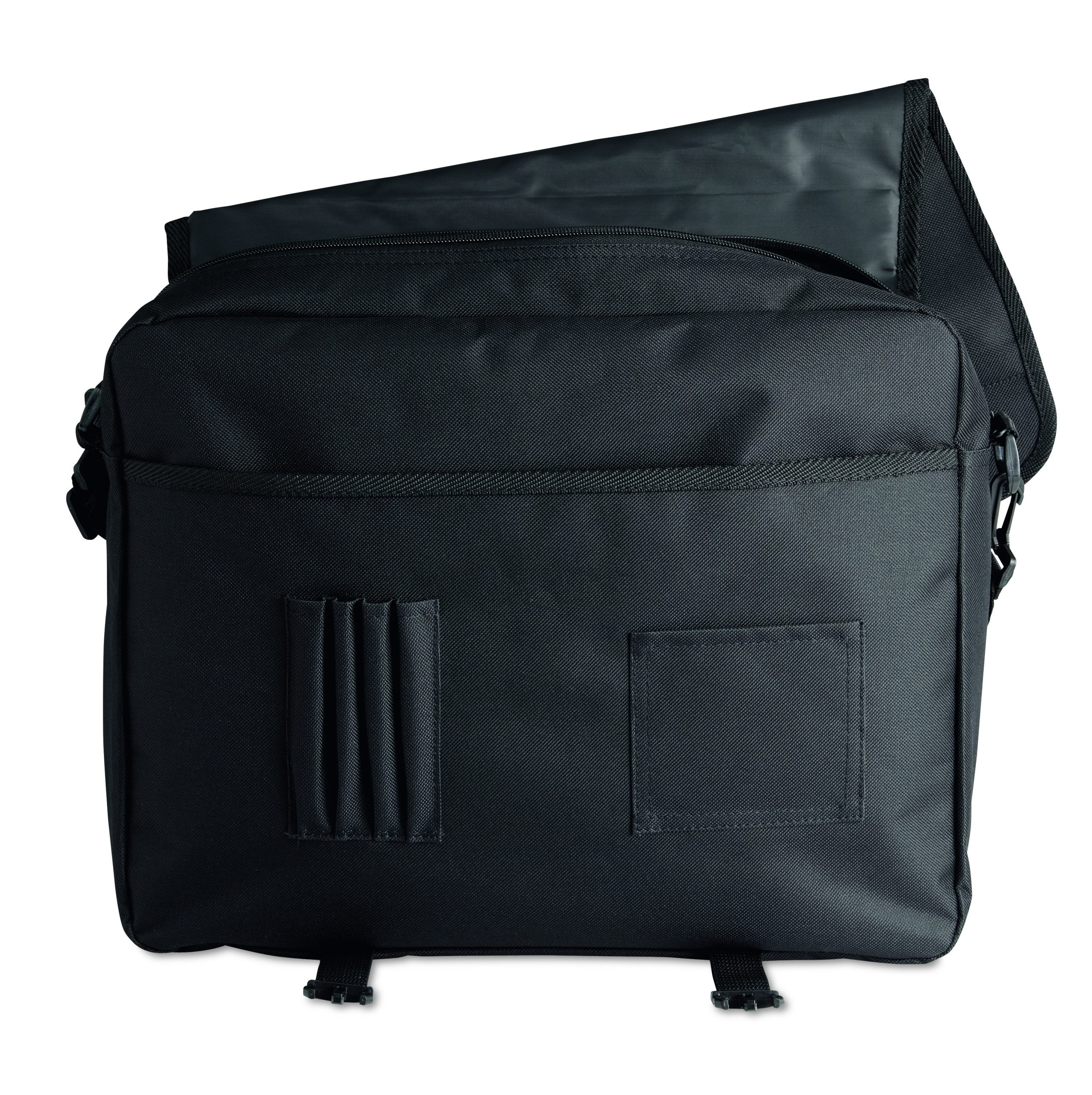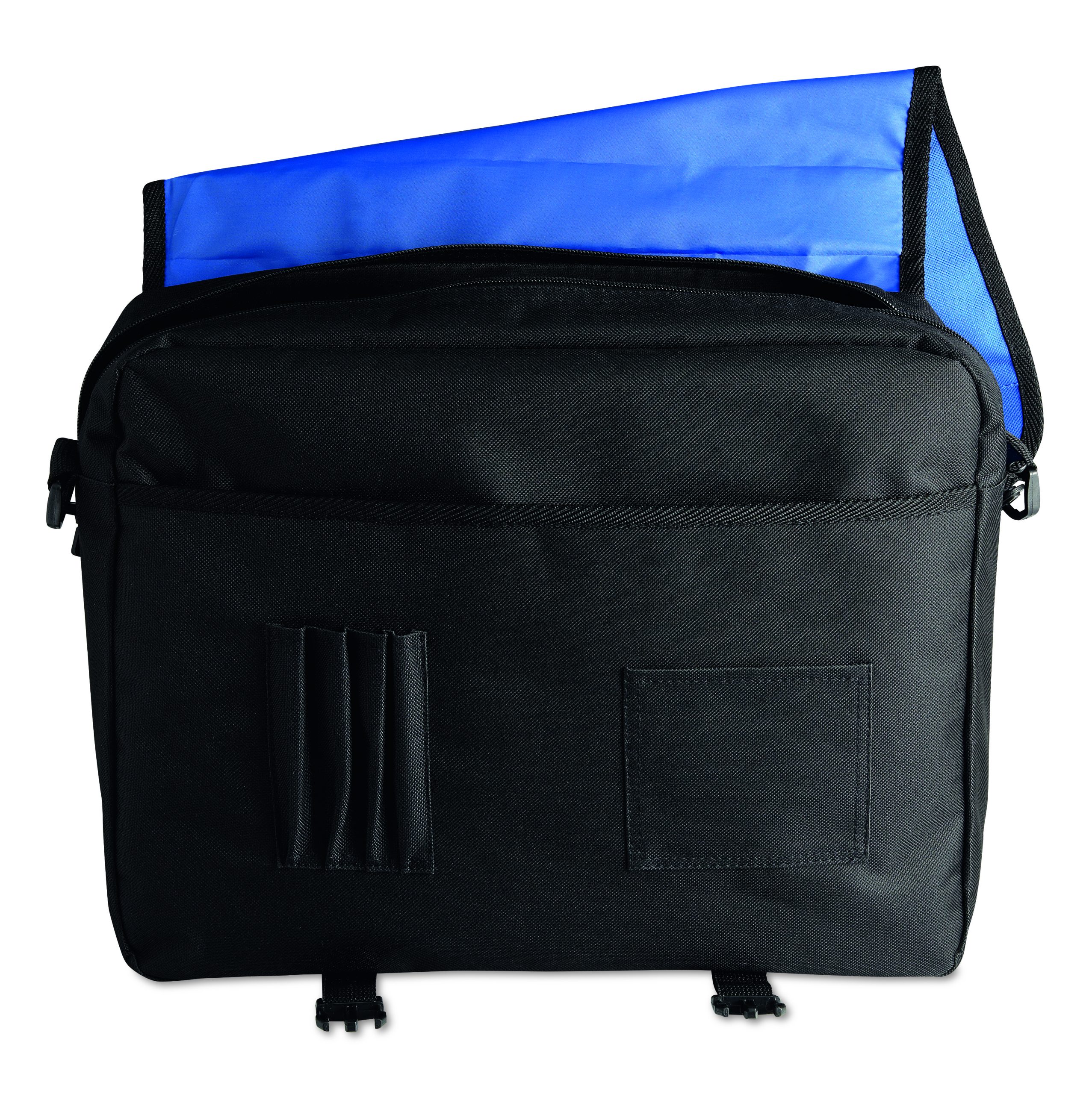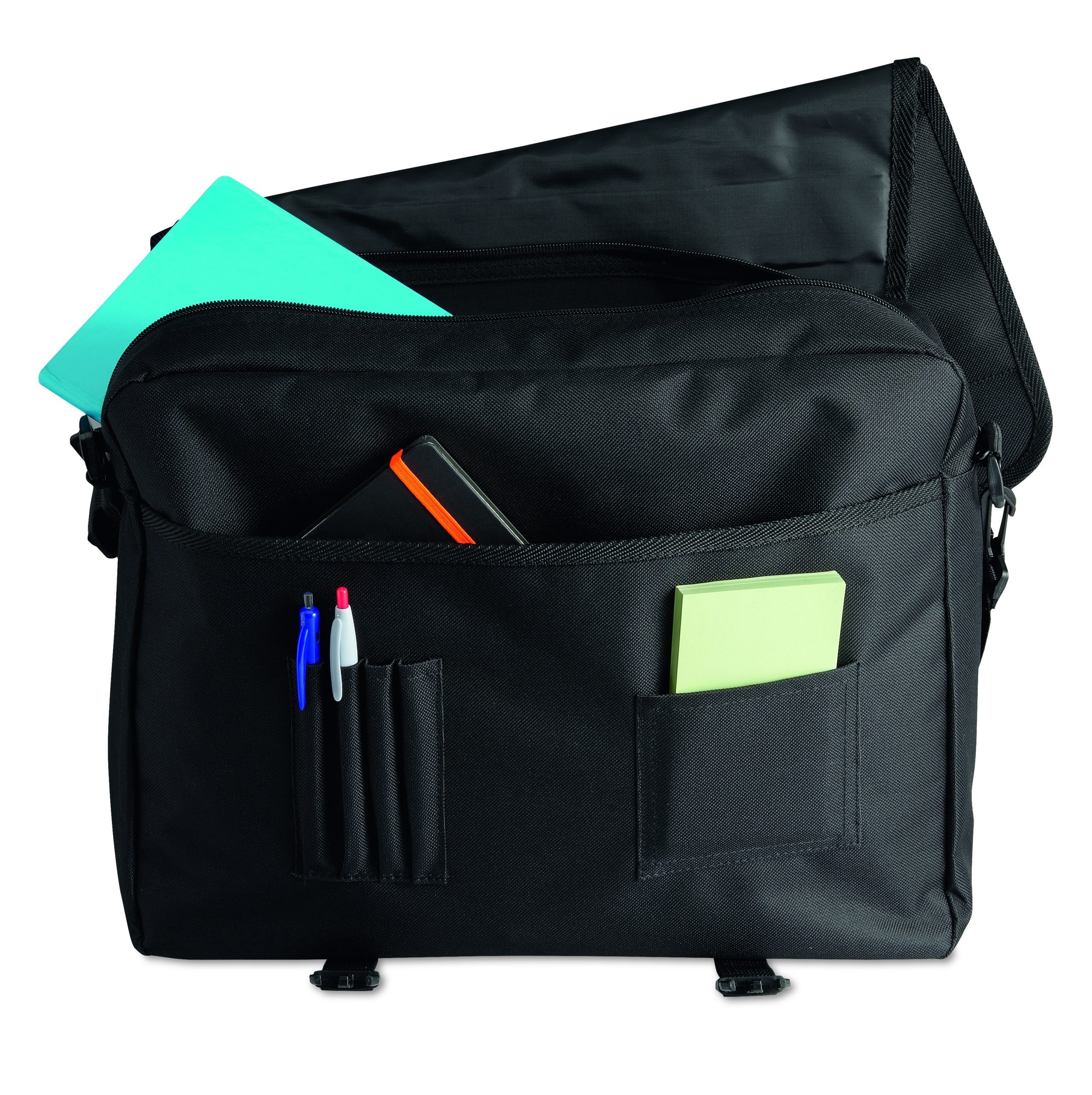 Torba na dokumenty z przednią kieszenią zamykaną na zamek oraz 2 klamry. Wykonana z poliestru 600D. Odpinany i regulowany pasek na ramię.