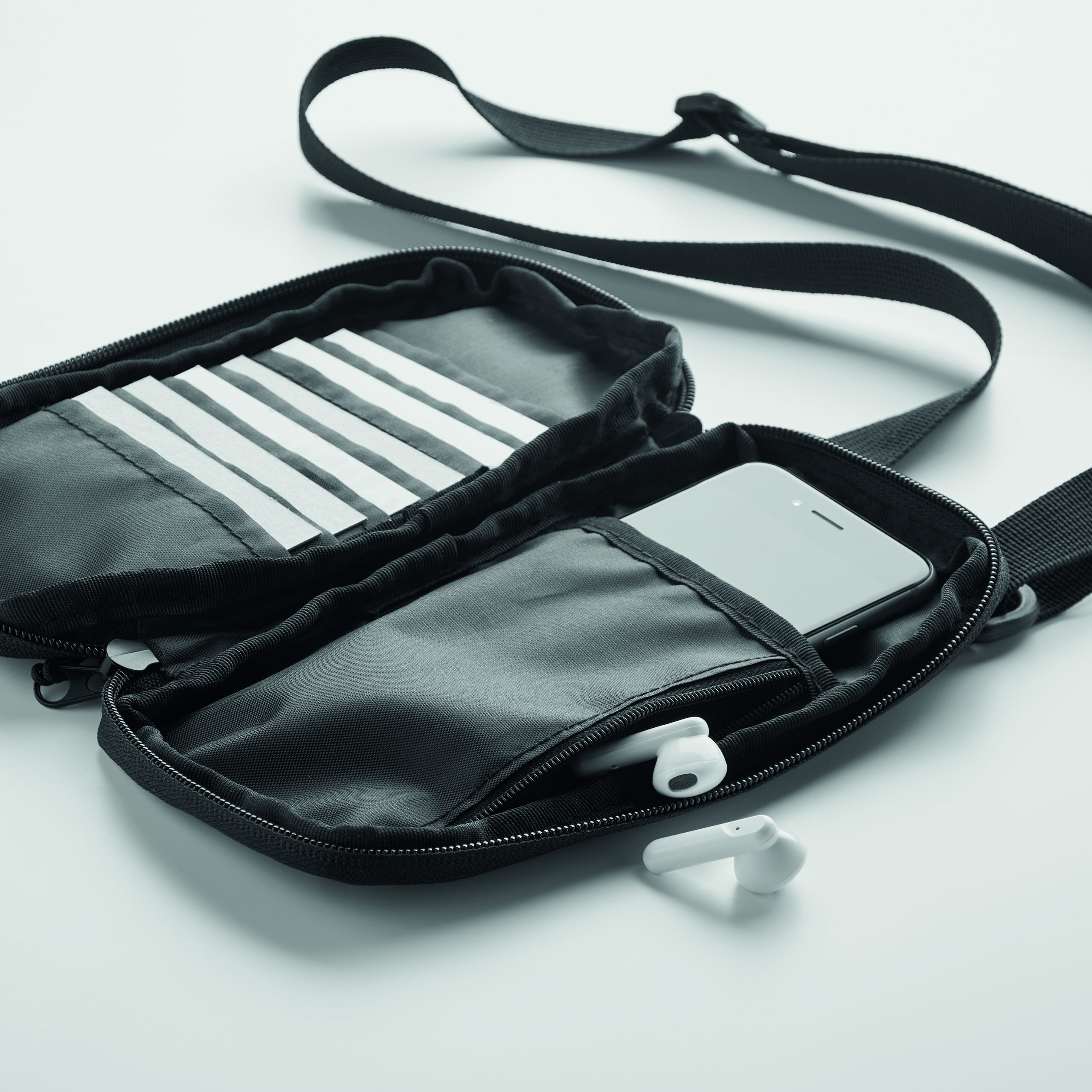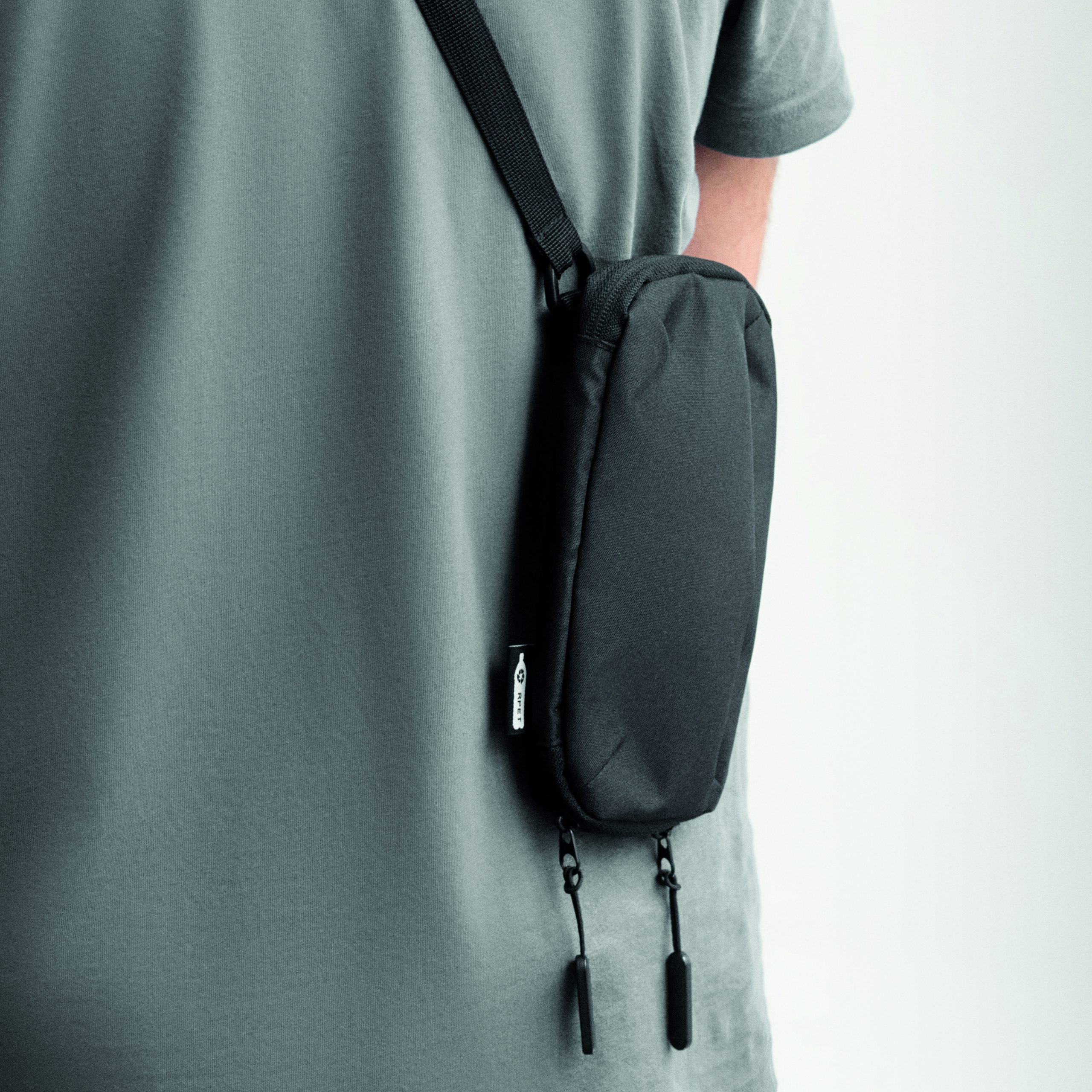 Uniwersalna torba na smartfona z poliestru 300D RPET z regulowanym paskiem. Przednia i boczna kieszeń na zamek błyskawiczny. Główna komora posiada kilka kieszeni.
