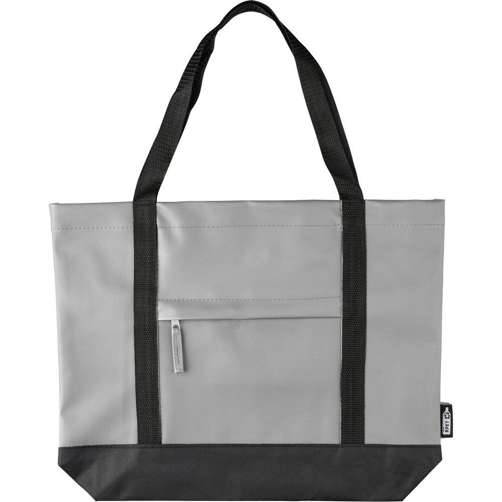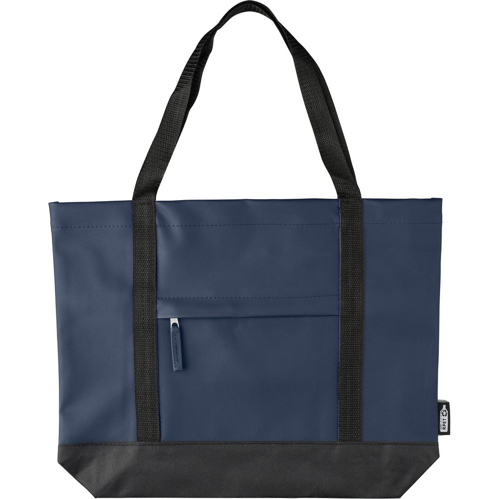 Torba na zakupy z dwustronną powłoką zapewniającą wodoodporność, pojemność: 10 l, udźwig: 10 kg, długie uchwyty ułatwiające noszenie, dwie zapinane kieszenie, kieszeń wewnętrzna, ikona RPET na metce, produkt wykonany z RPET
