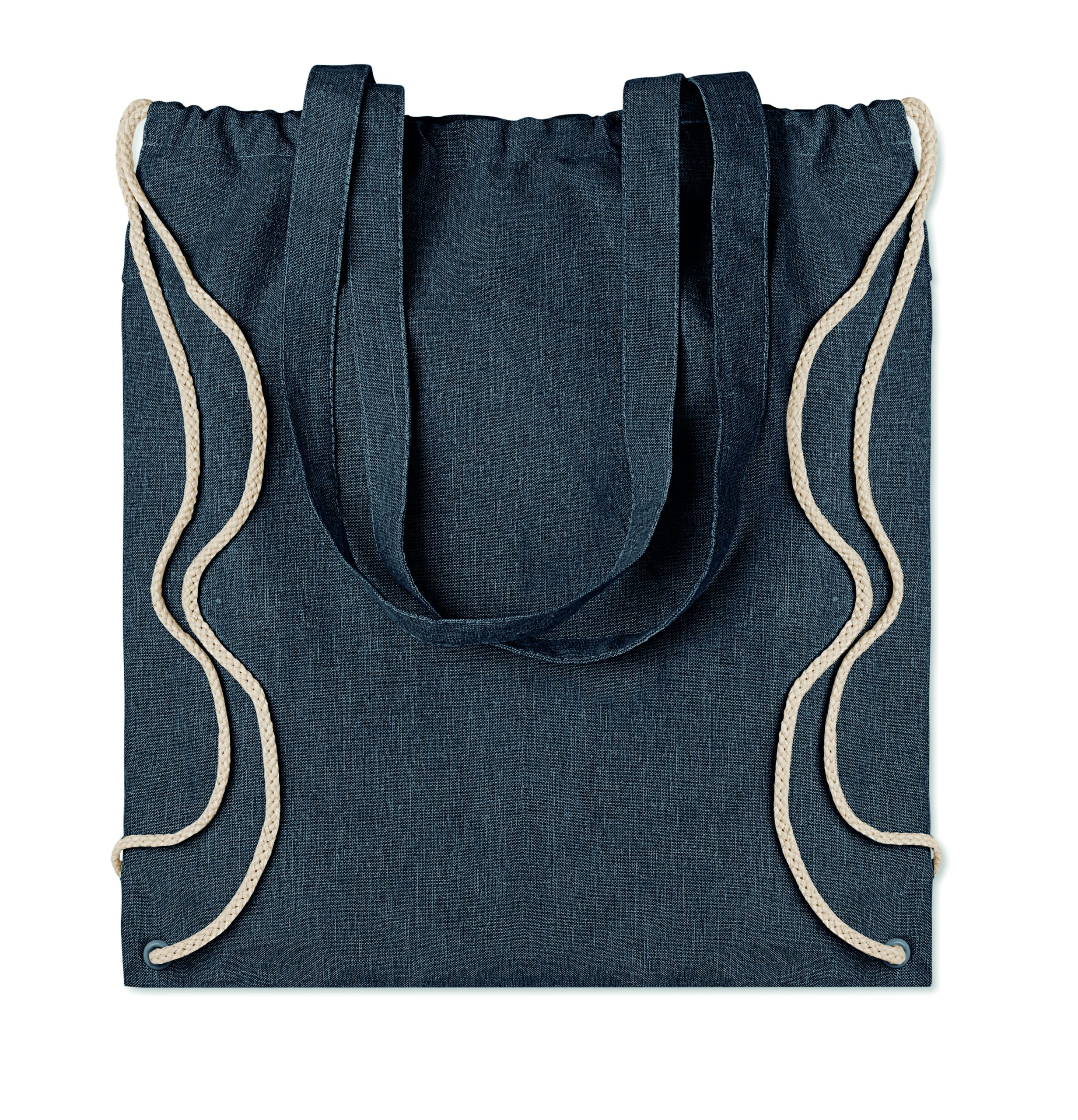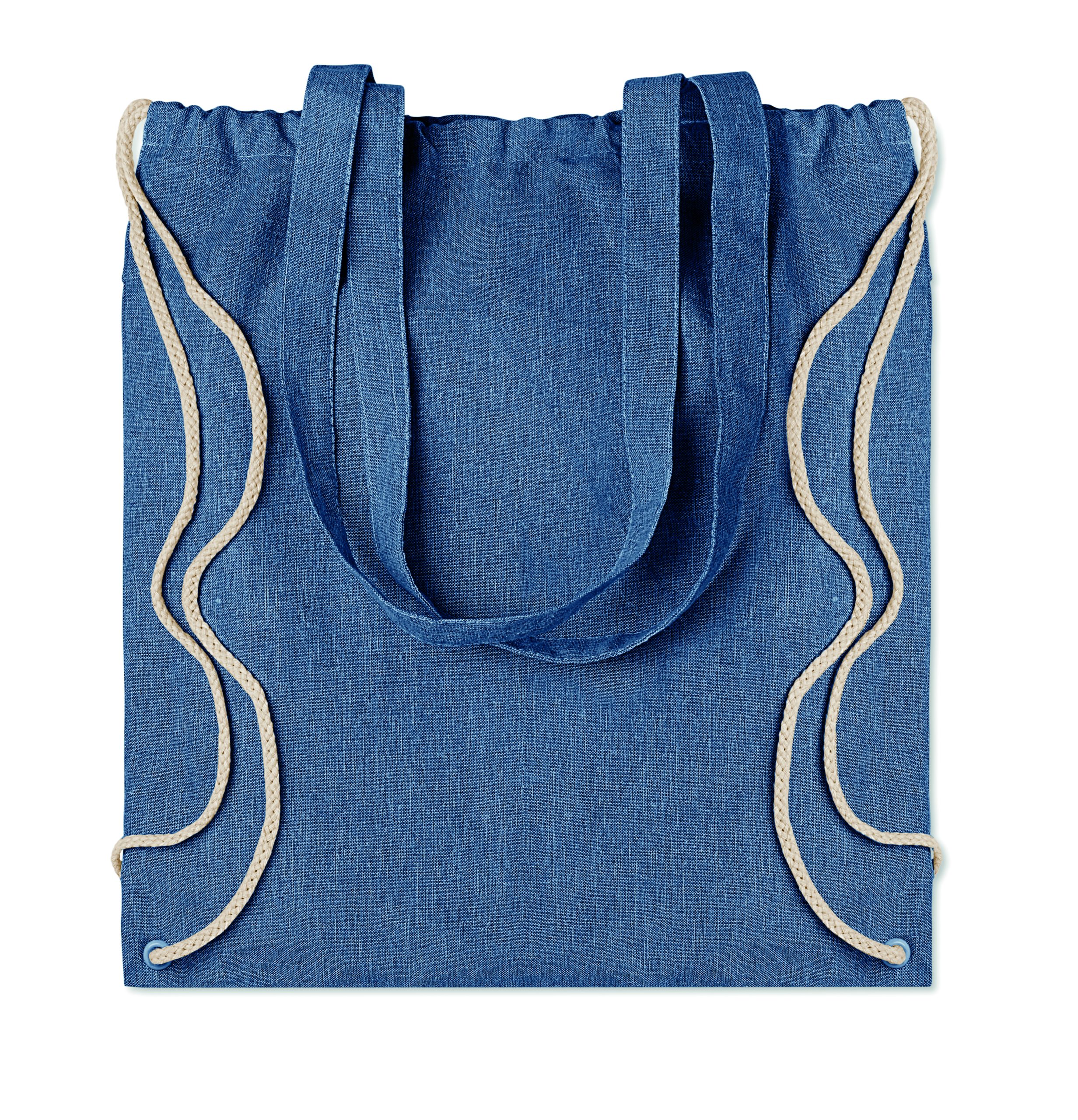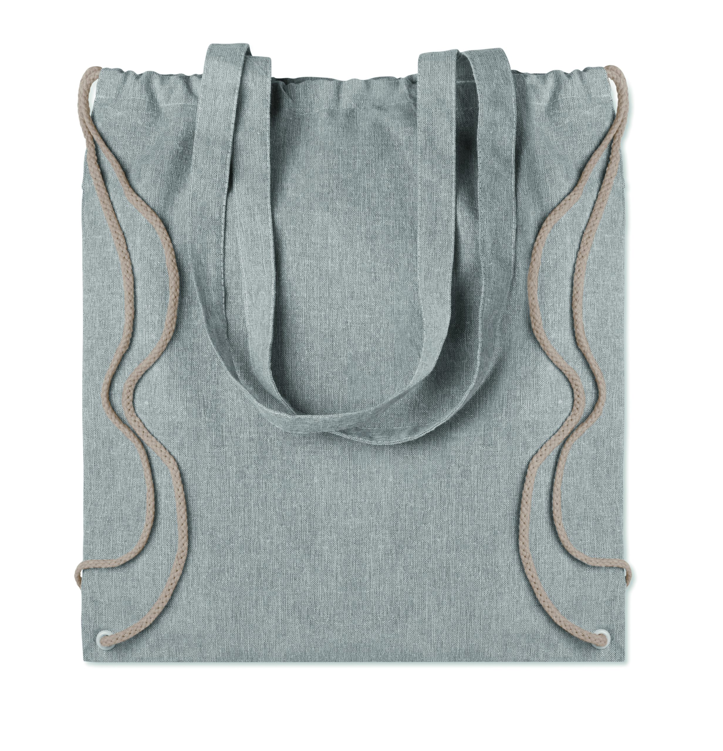 Dwukolorowa torba na zakupy z bawełny z recyklingu oraz z poliestru z recyklingu, ze sznurkiem i długimi uchwytami (20%/80%). Ok. 140 gr / m². Ten produkt może się kurczyć po zadrukowaniu.