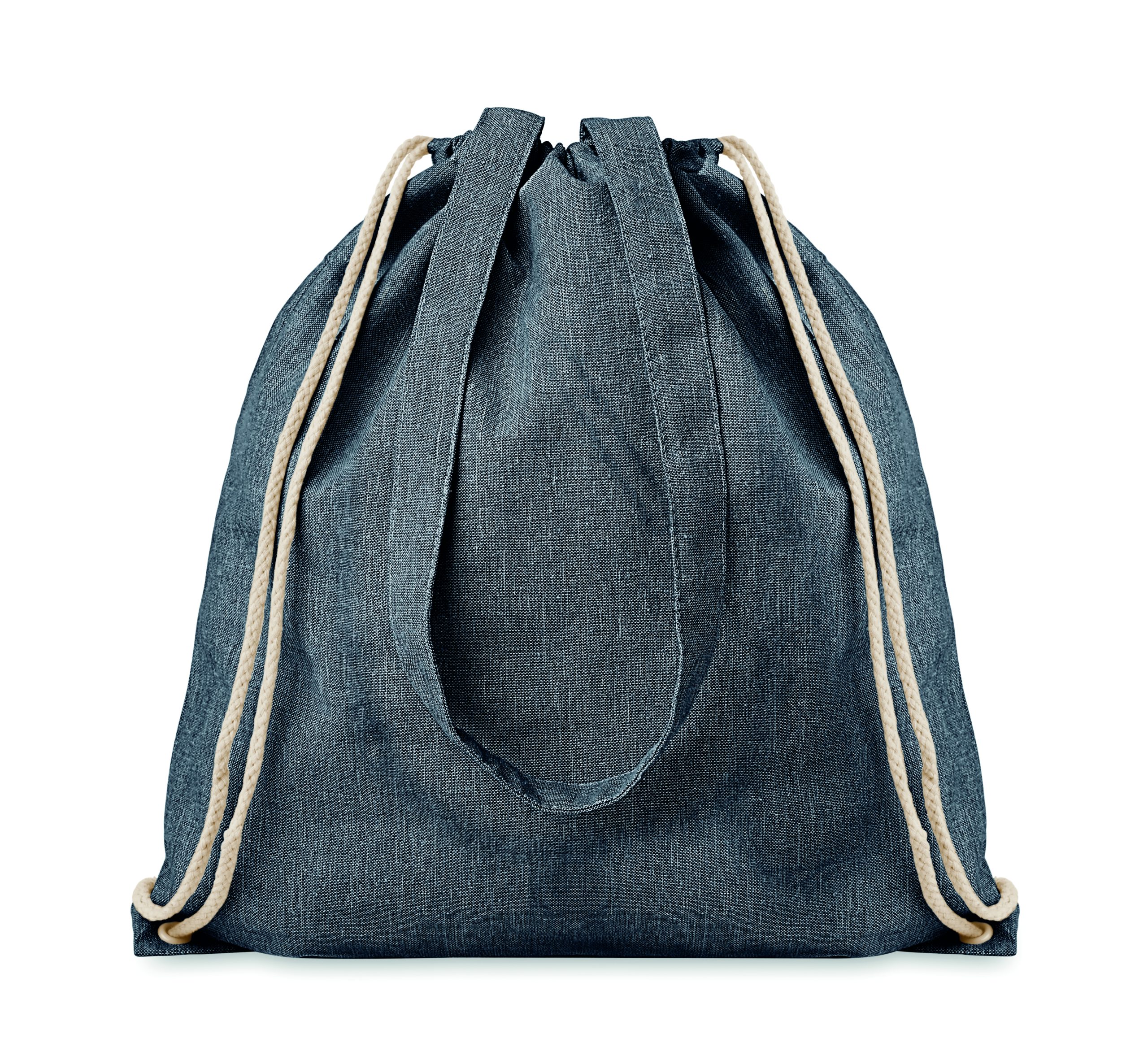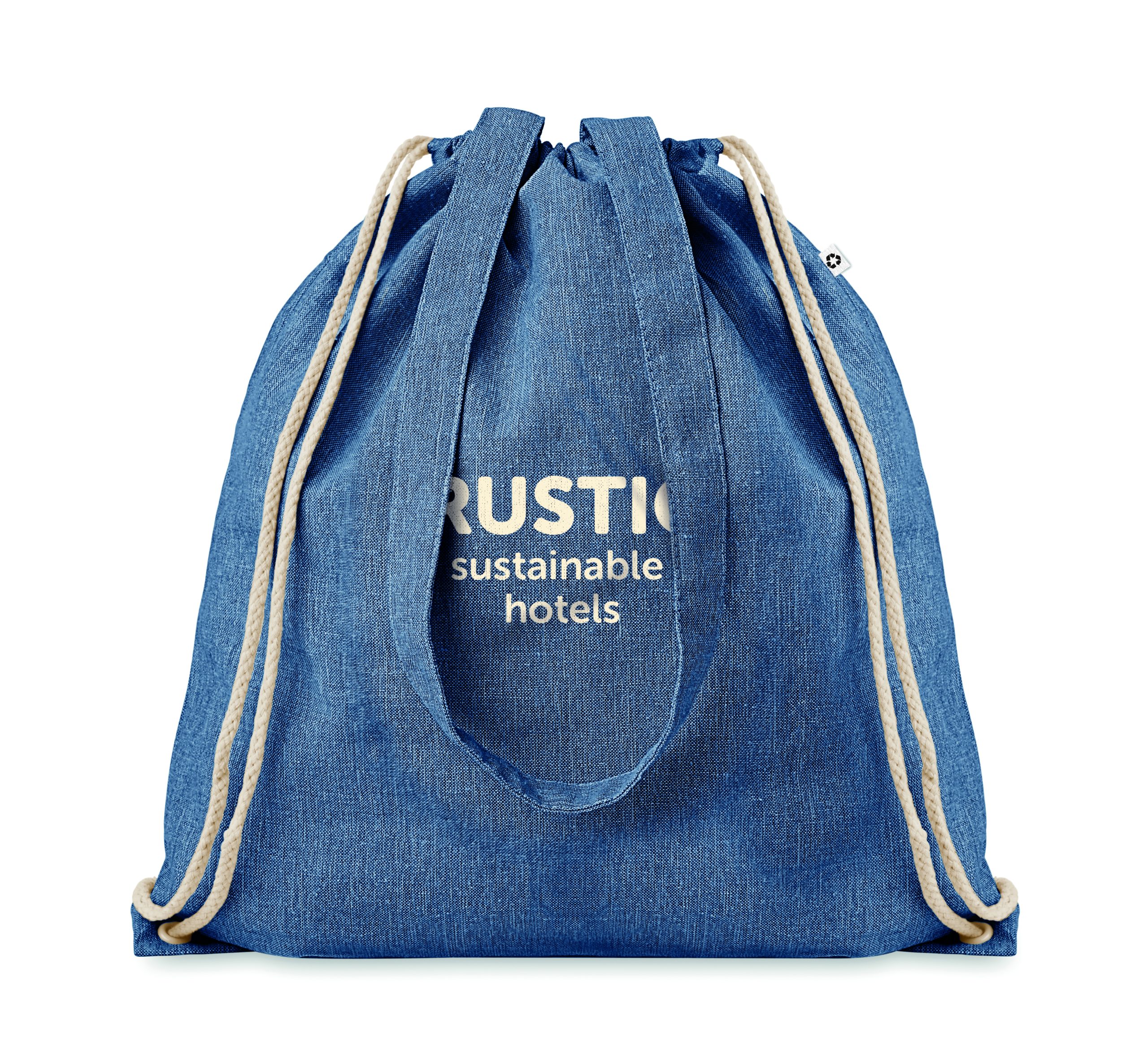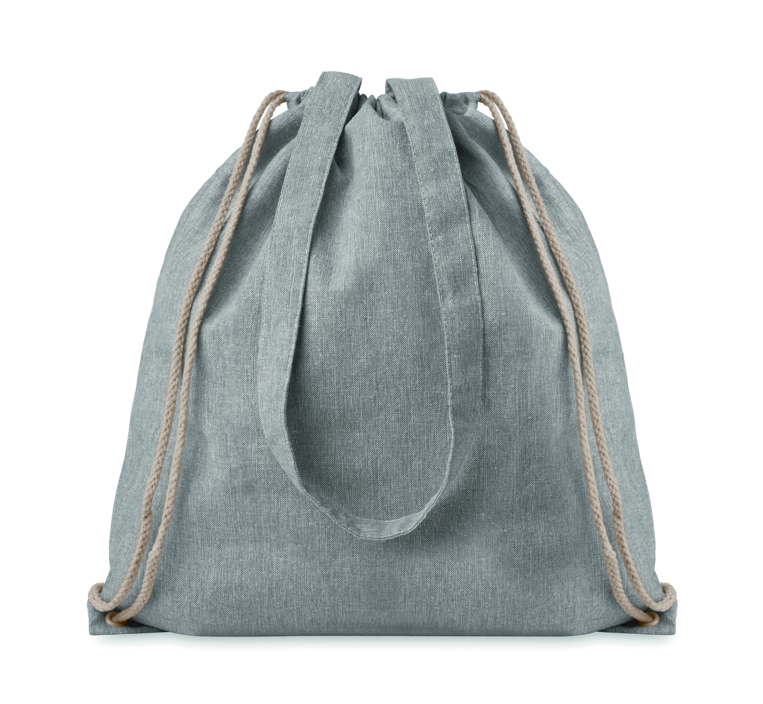 Dwukolorowa torba na zakupy z bawełny z recyklingu oraz z poliestru z recyklingu, ze sznurkiem i długimi uchwytami (20%/80%). Ok. 140 gr / m². Ten produkt może się kurczyć po zadrukowaniu.