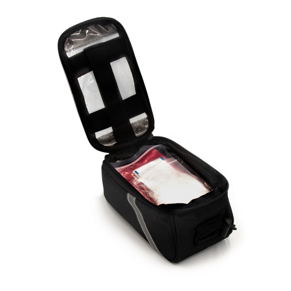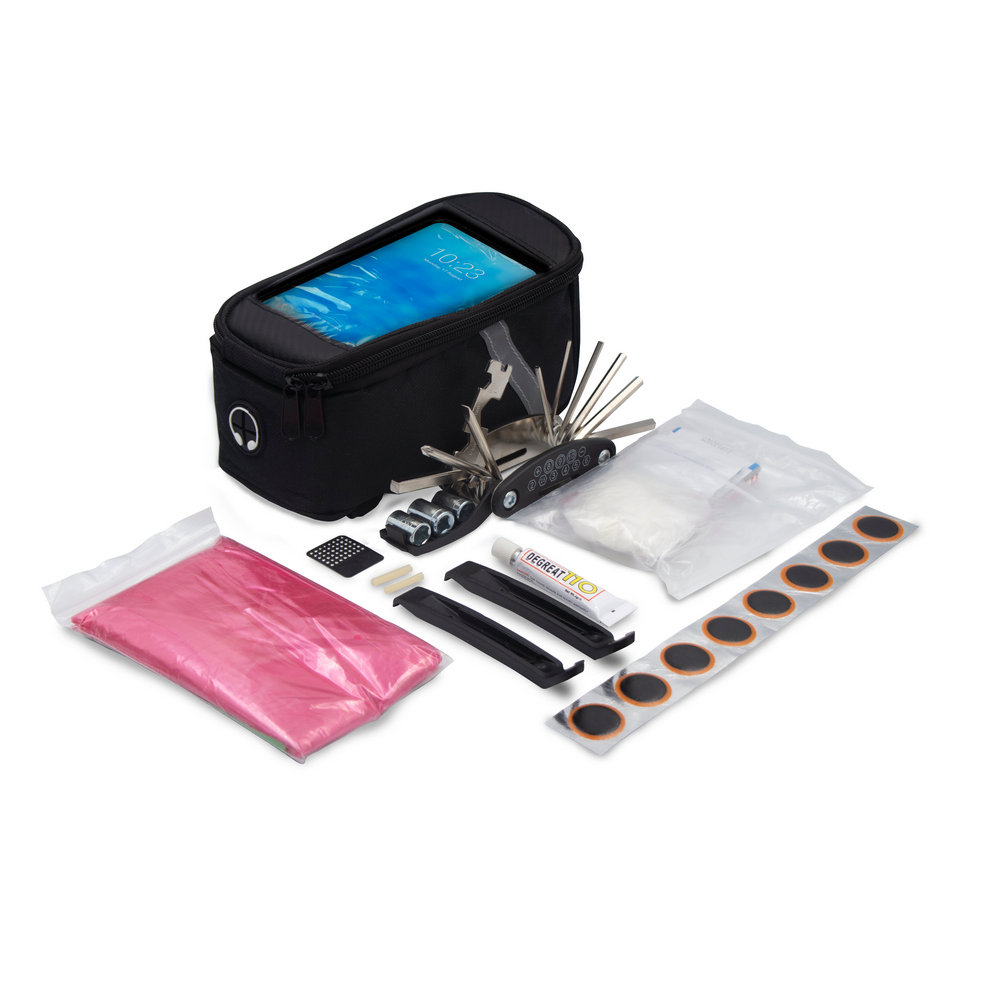 Torba rowerowa z wyposażeniem: okrągłe łatki rowerowe (8 szt.), klej, tarka, plastikowe łyżki do ściągania opony (2 szt.), jednorazowe ponczo, klucz wielofunkcyjny, zestaw pierwszej pomocy (8 plastrów 72 x 19 mm, 4 plastry 55 x 19 mm, 4 okrągłe plastry Ø20 mm, 6 chusteczek antyseptycznych, 1 chusteczka nasączona mydłem, 1 chusteczka do czyszczenia, rękawiczki winylowe)