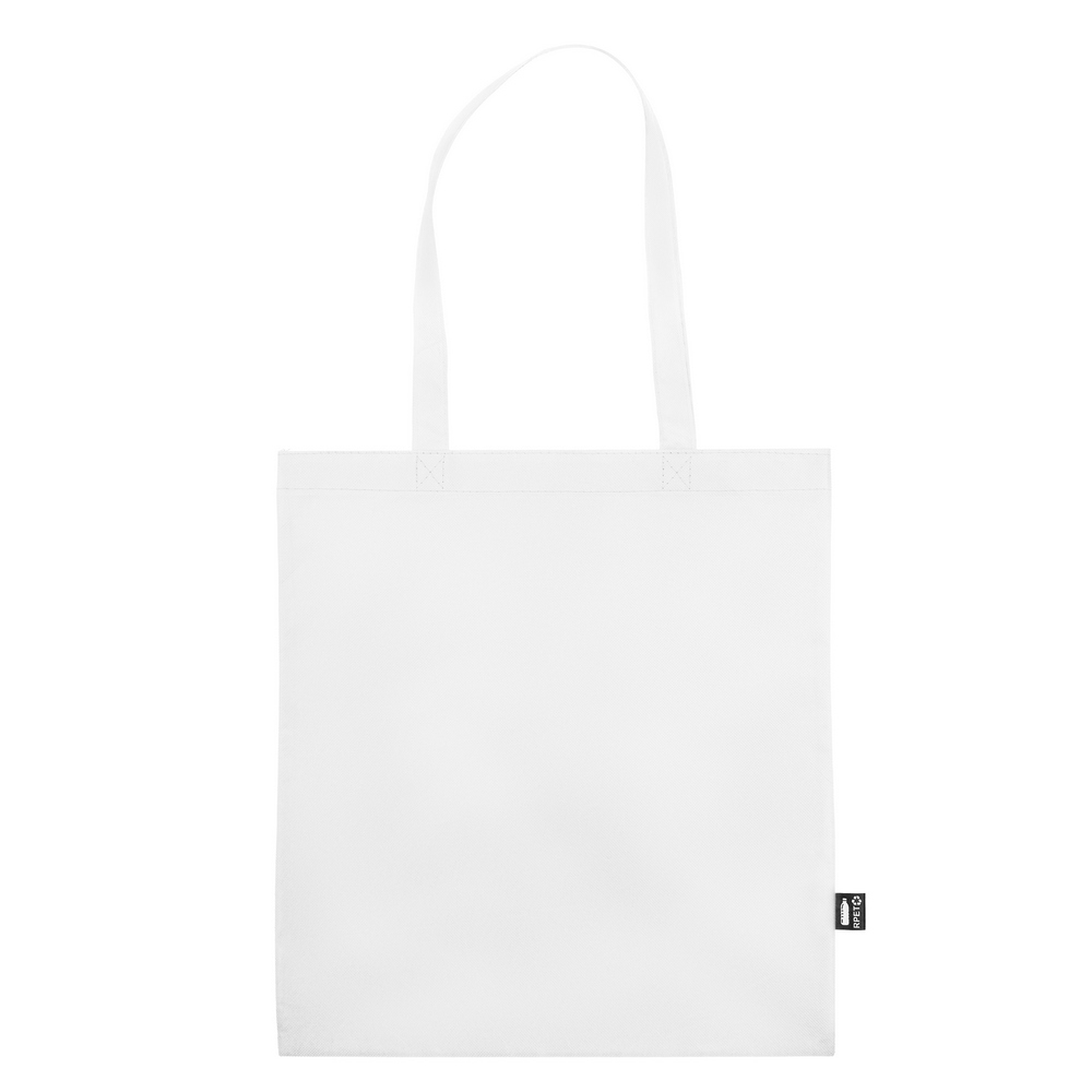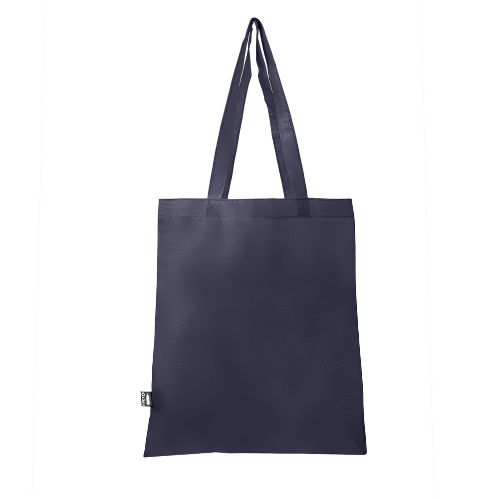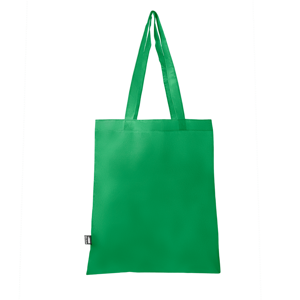Torba na zakupy wykonana z RPET, posiada długie uchwyty umożliwiające noszenie na ramieniu, ikona RPET na metce, produkt wykonany z non-woven RPET 75 g/m2