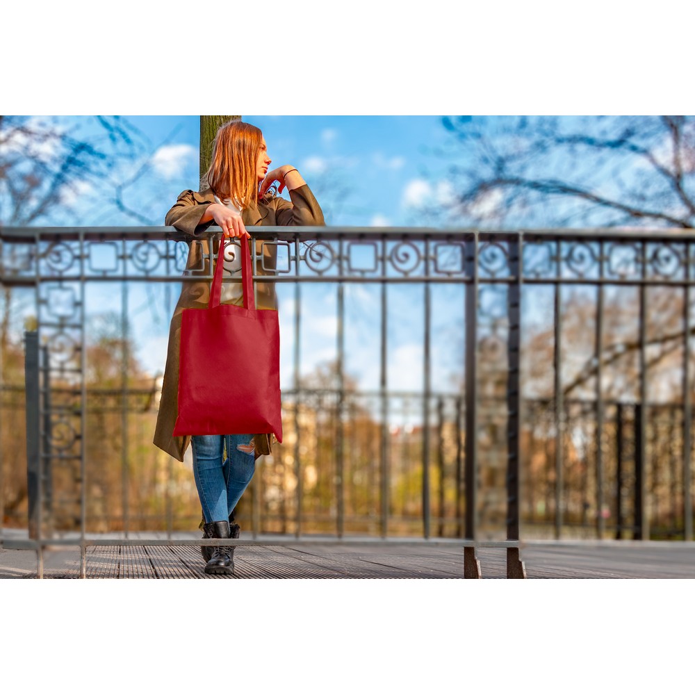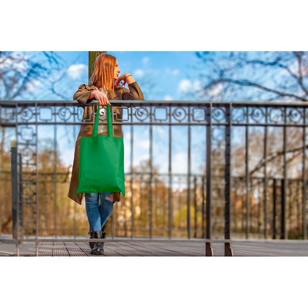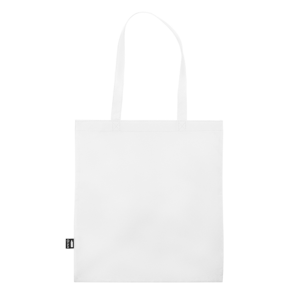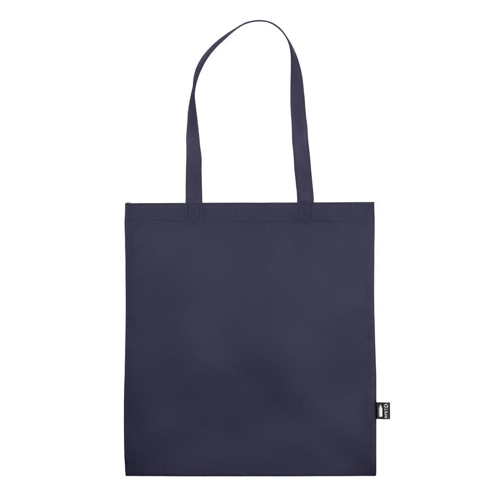 Torba na zakupy wykonana z RPET, posiada długie uchwyty umożliwiające noszenie na ramieniu, ikona RPET na metce, produkt wykonany z non-woven RPET 75 g/m2