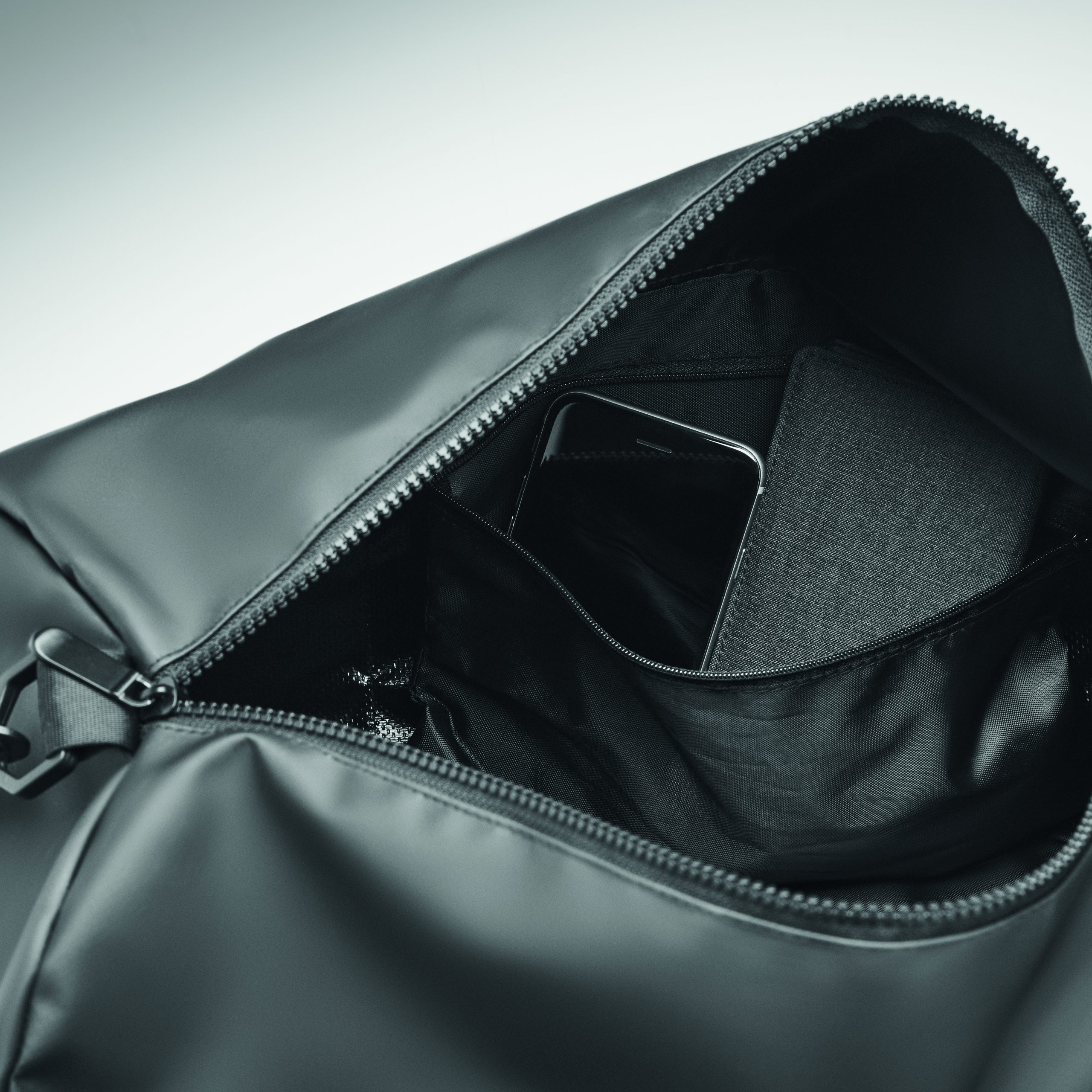 Torba sportowa lub podróżna z tkaniny tarpaulin 50C z boczną przegrodą zapinaną na zamek i wewnętrzną kieszenią zapinaną na zamek. Posiada wygodny uchwyt i wyściełaną spód.