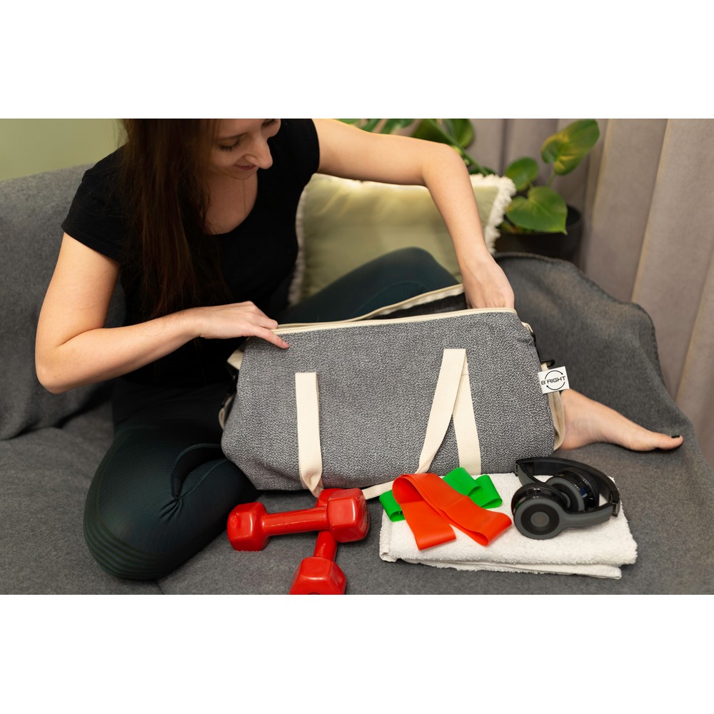 Torba sportowa, podróżna B’RIGHT, wykonana z bawełny z recyklingu i poliestru z recyklingu, zgodna z certyfikatem GRS (Global RecycIed Standard), duża przegroda główna na zamek błyskawiczny, uchwyty i regulowany pasek na ramię