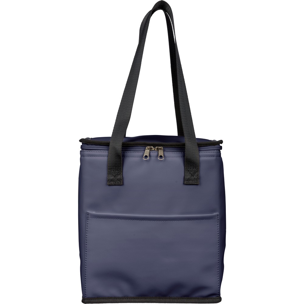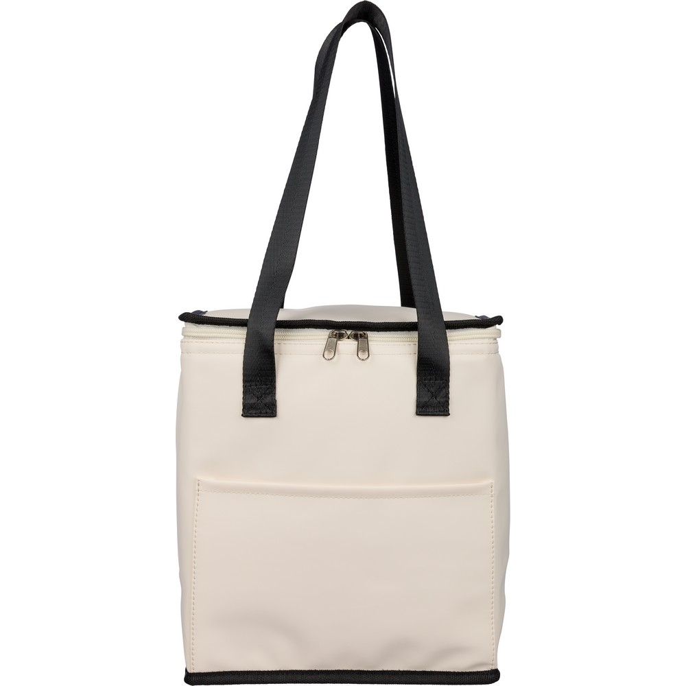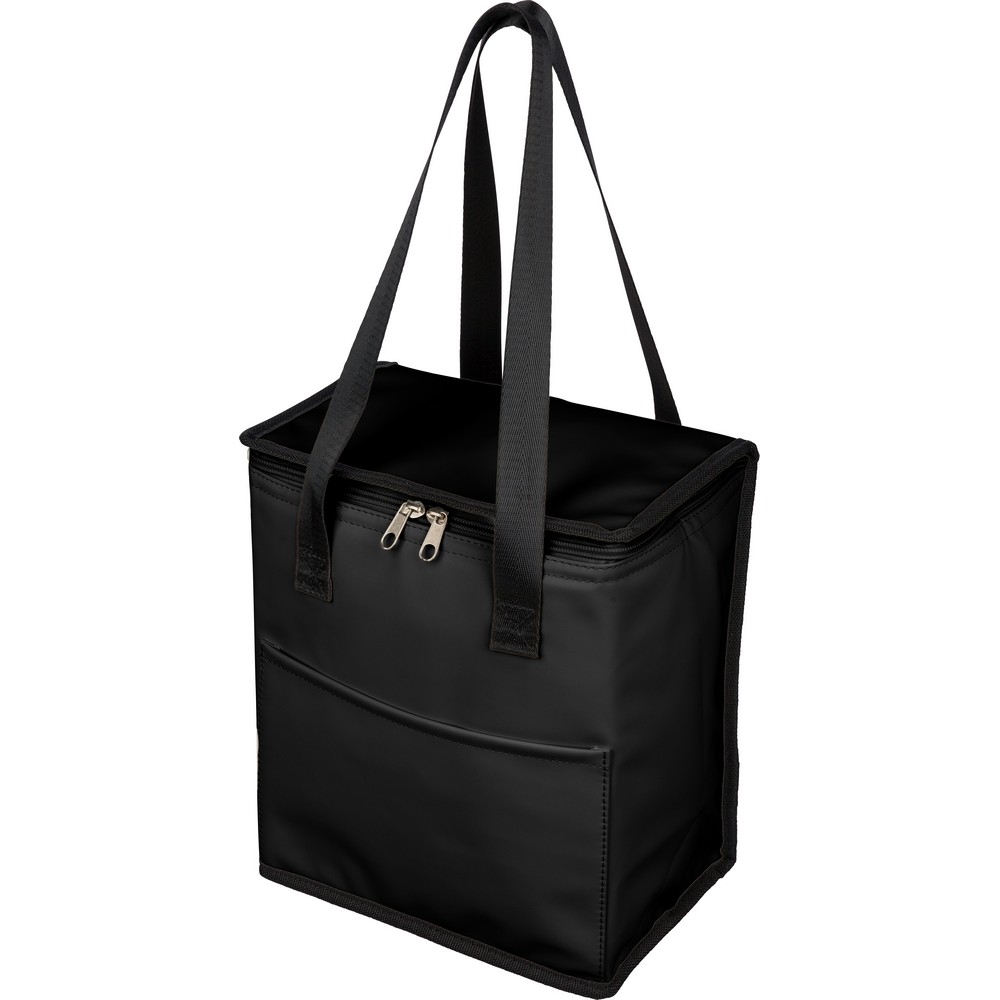 Torba termoizolacyjna o pojemności 9 litrów, posiada długie uchwyty do noszenia na ramieniu (2,5 × 66 cm), kieszeń przednia, ikona recyklingu na metce, produkt wykonany z PU z recyklingu z poliestrową podszewką