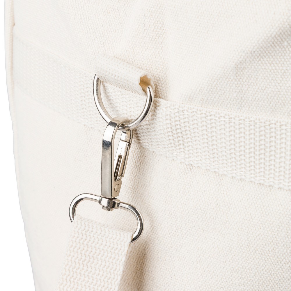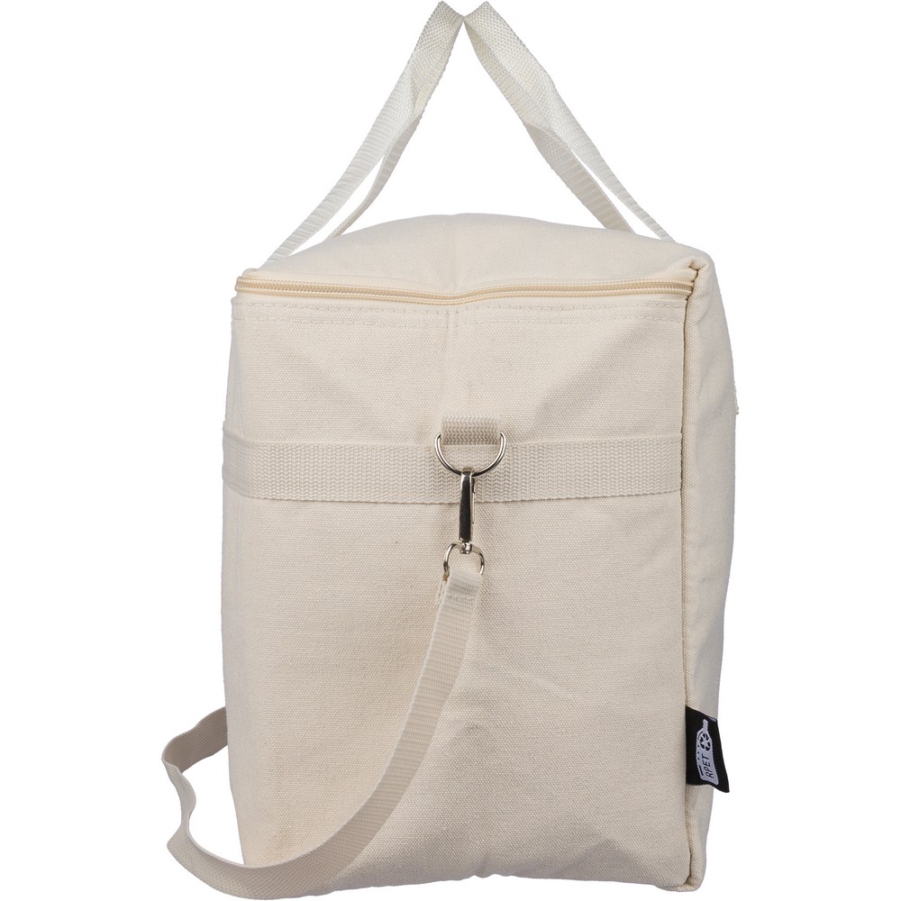 Torba termoizolacyjna 330 g/m² o pojemności 23 l, dwa uchwyty do noszenia (3,5 x 60 cm), posiada regulowany uchwyt umożliwiający noszenie na ramieniu (2,5 x 110 cm), metalowa klamra, wnętrze wyłożone folią aluminiową, ikona RPET na metce, produkt wykonany z polibawełny z recyklingu, folii aluminiowej i RPET