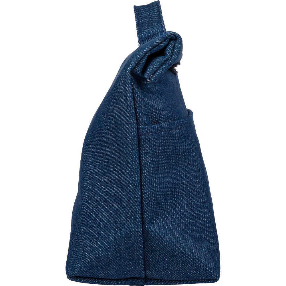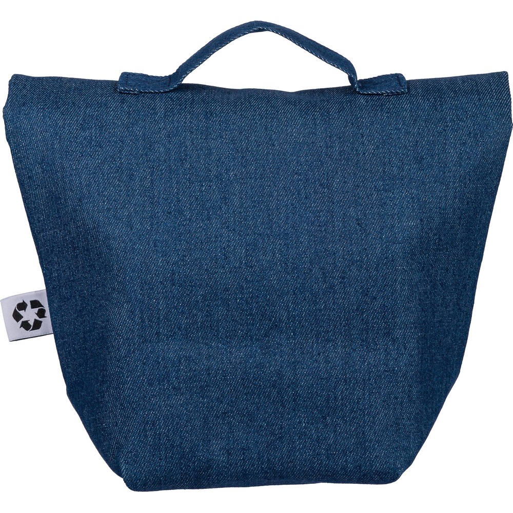 Torba termoizolacyjna o pojemności ok. 8 litrów, krótki uchwyt do noszenia, kieszeń z przodu, zapięcie na rzep, PEVA w środku, ikona recyklingu, produkt wykonany z denimu z recyklingu