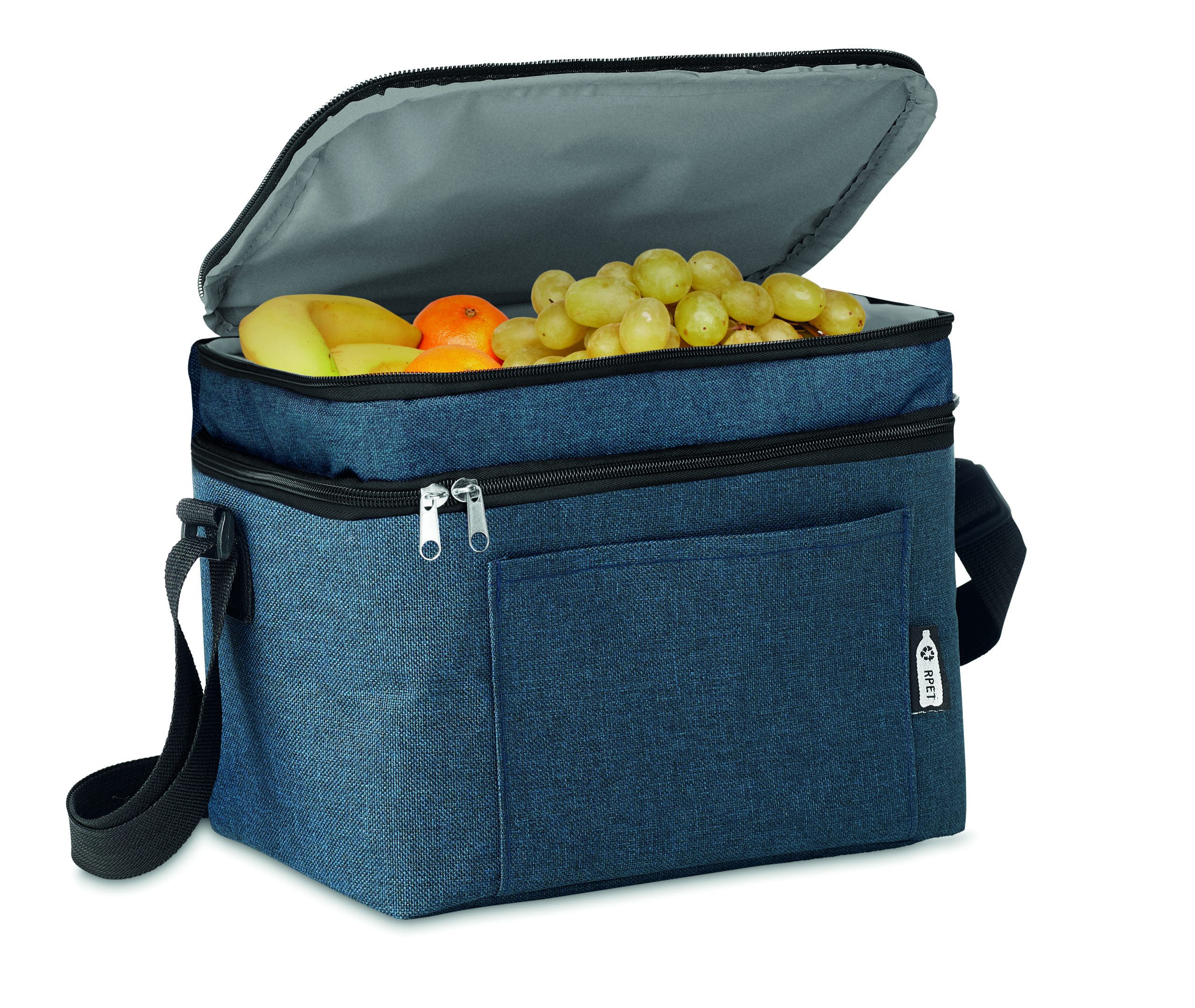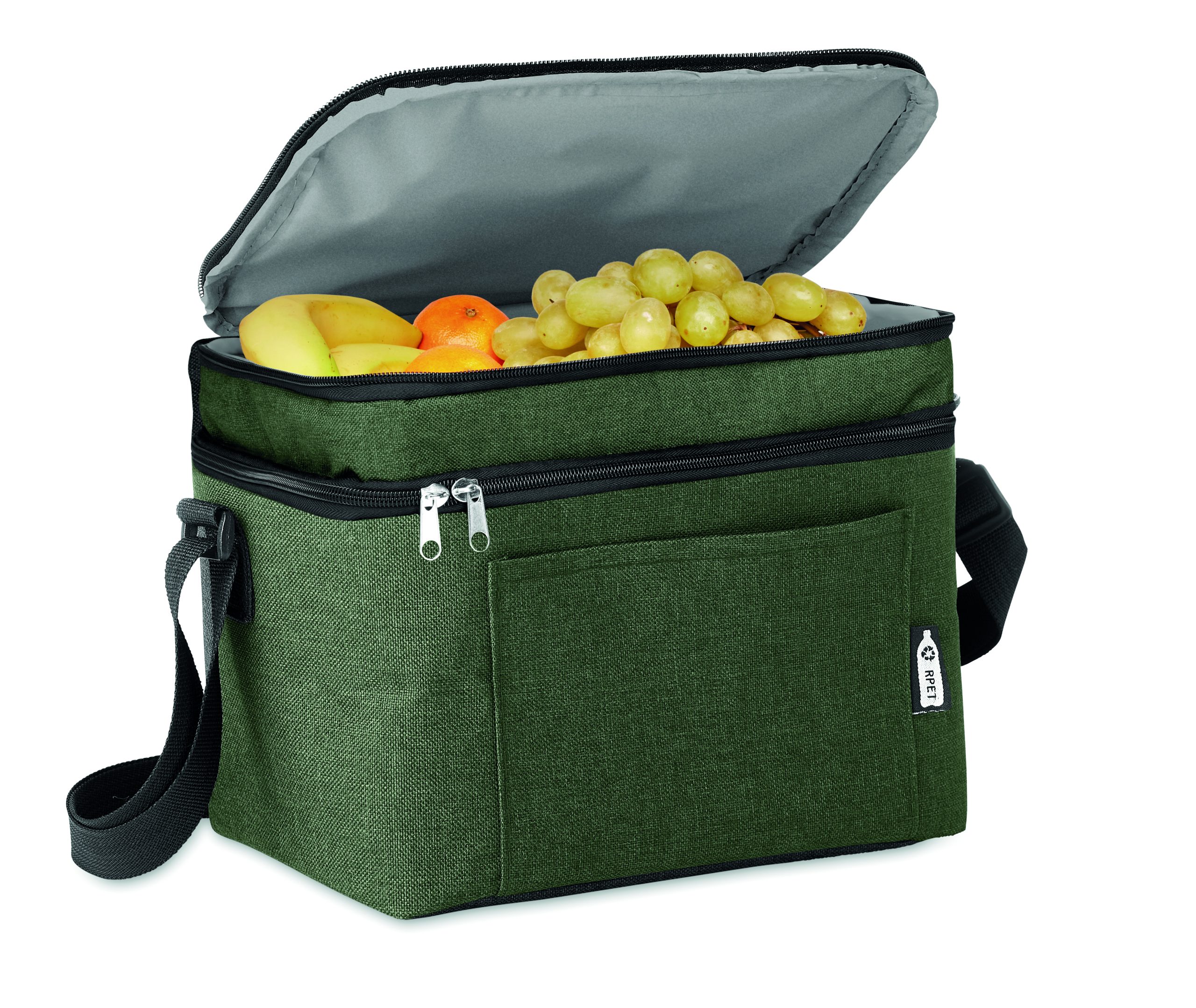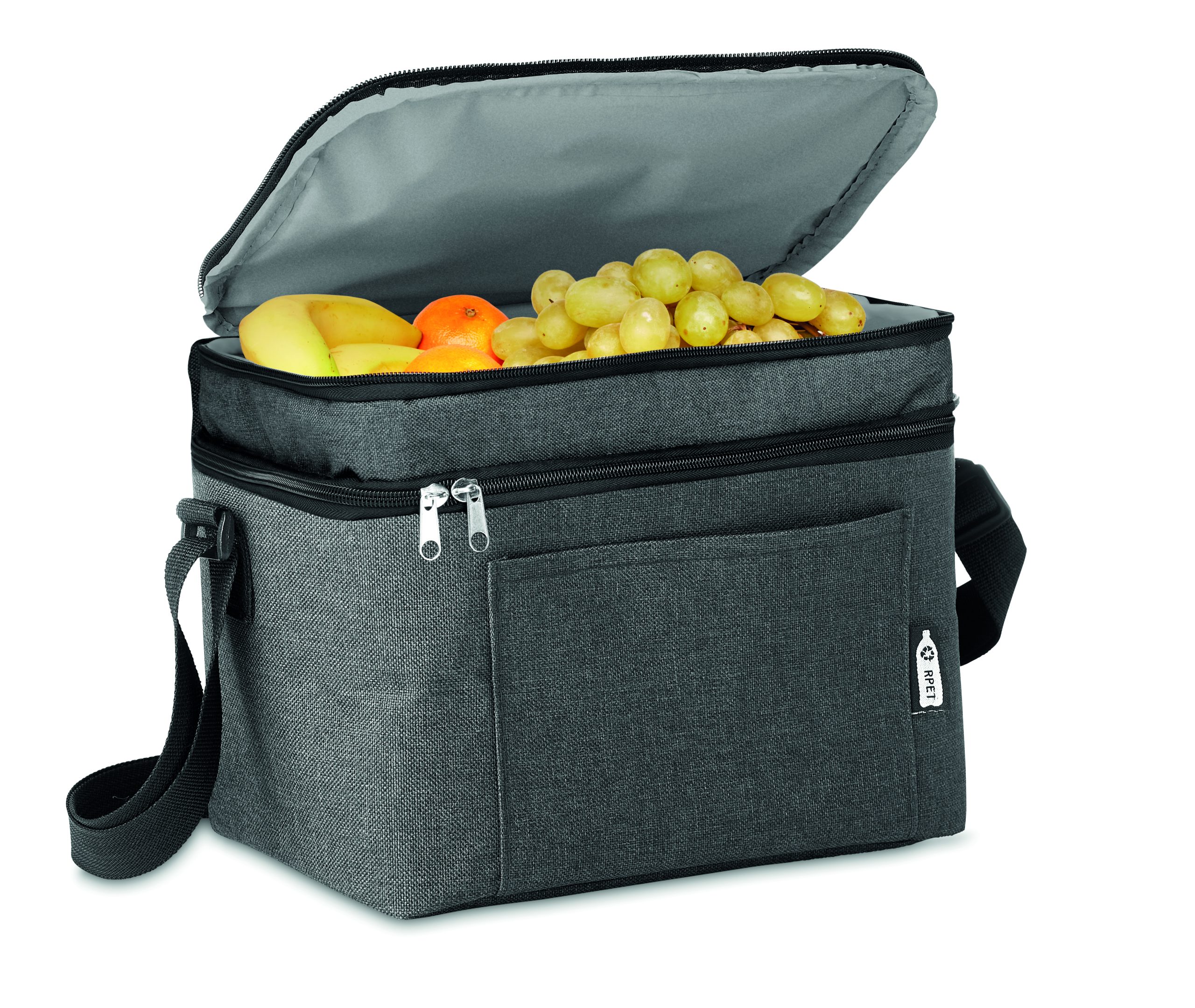Torba termoizolacyjna w 2 odcieniach 600D RPET z 2 przegrodami. Regulowany pasek na ramię, przednia kieszeń. Materiał izolacyjny: PEVA 0,15 mm + pianka 3 mm.