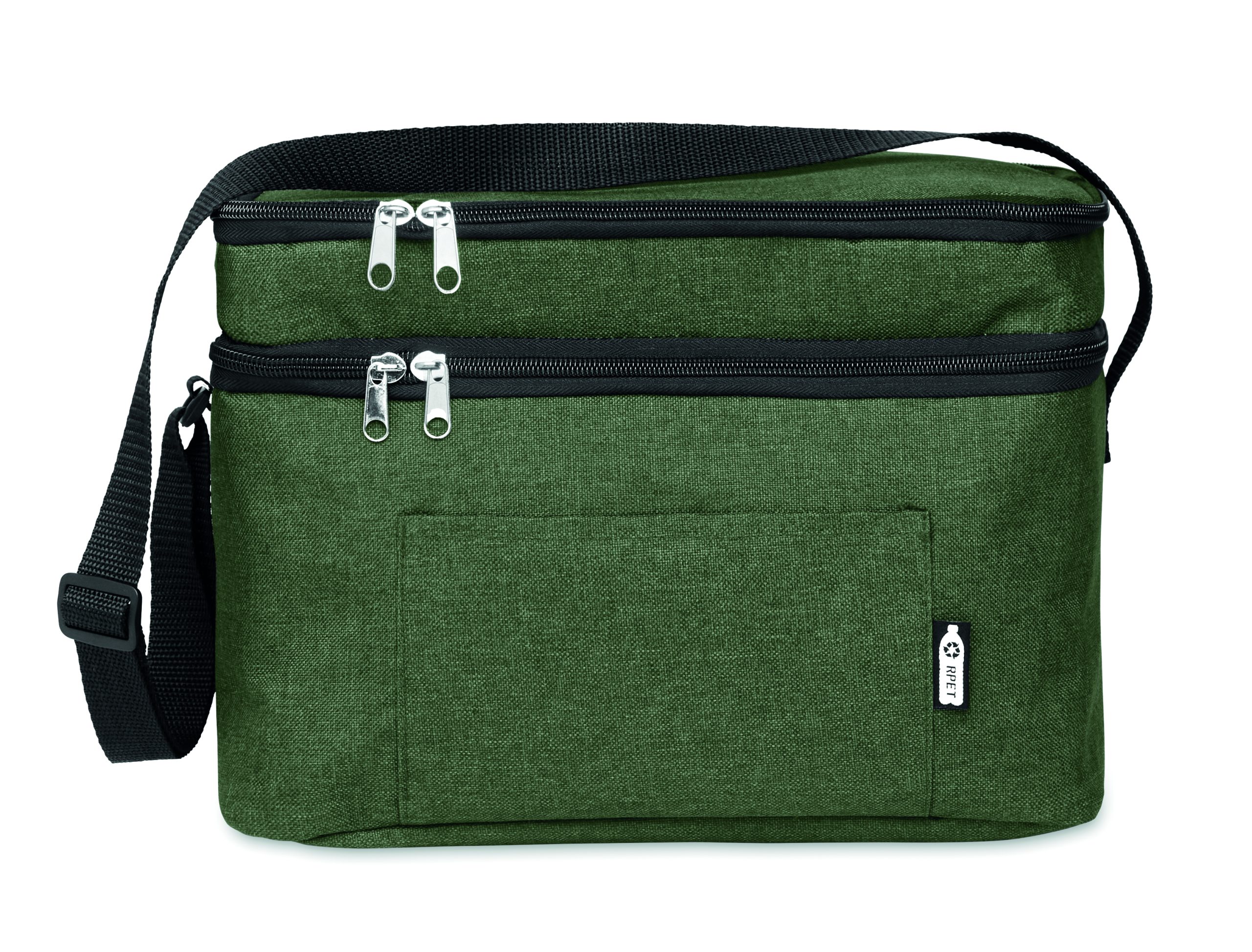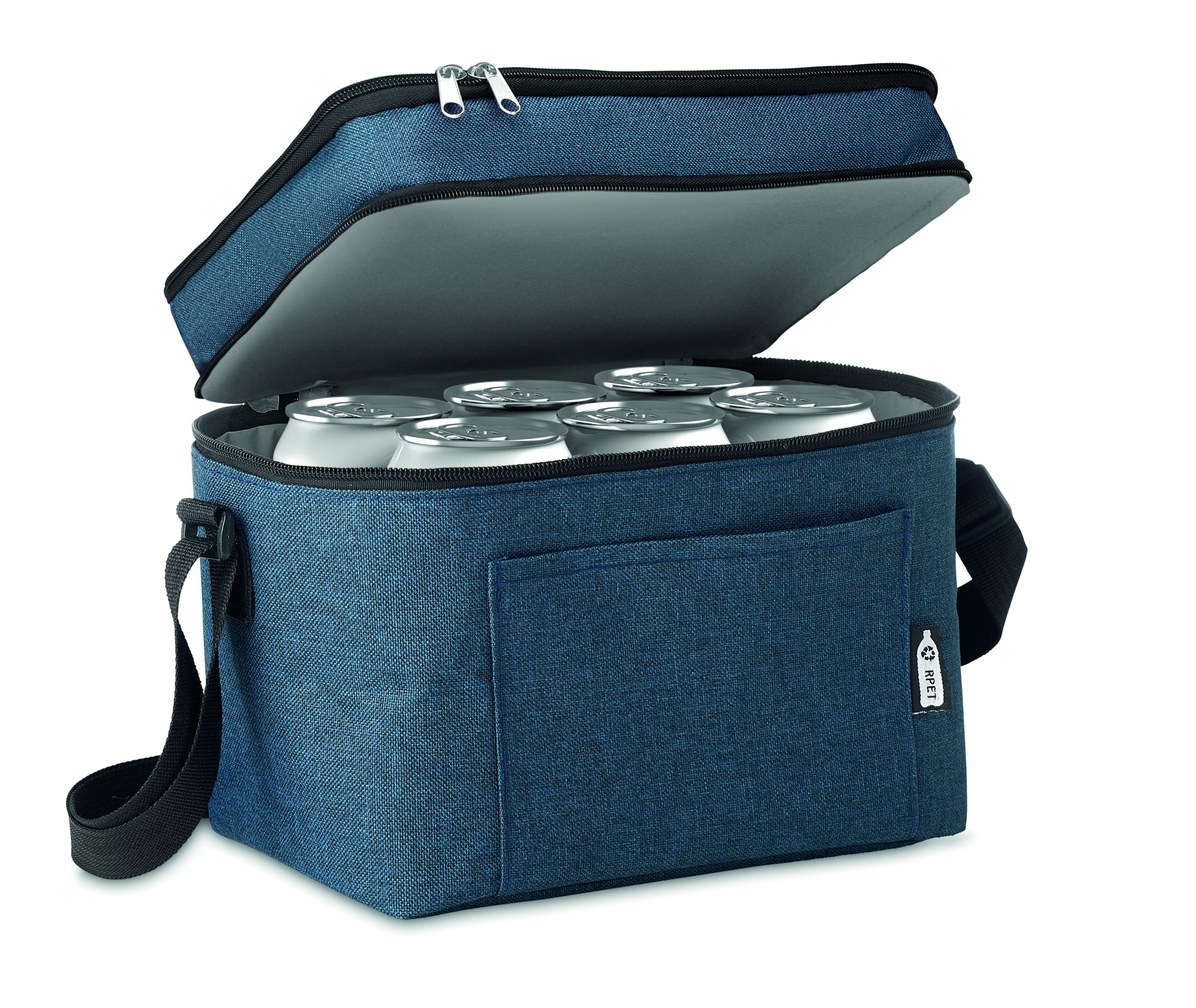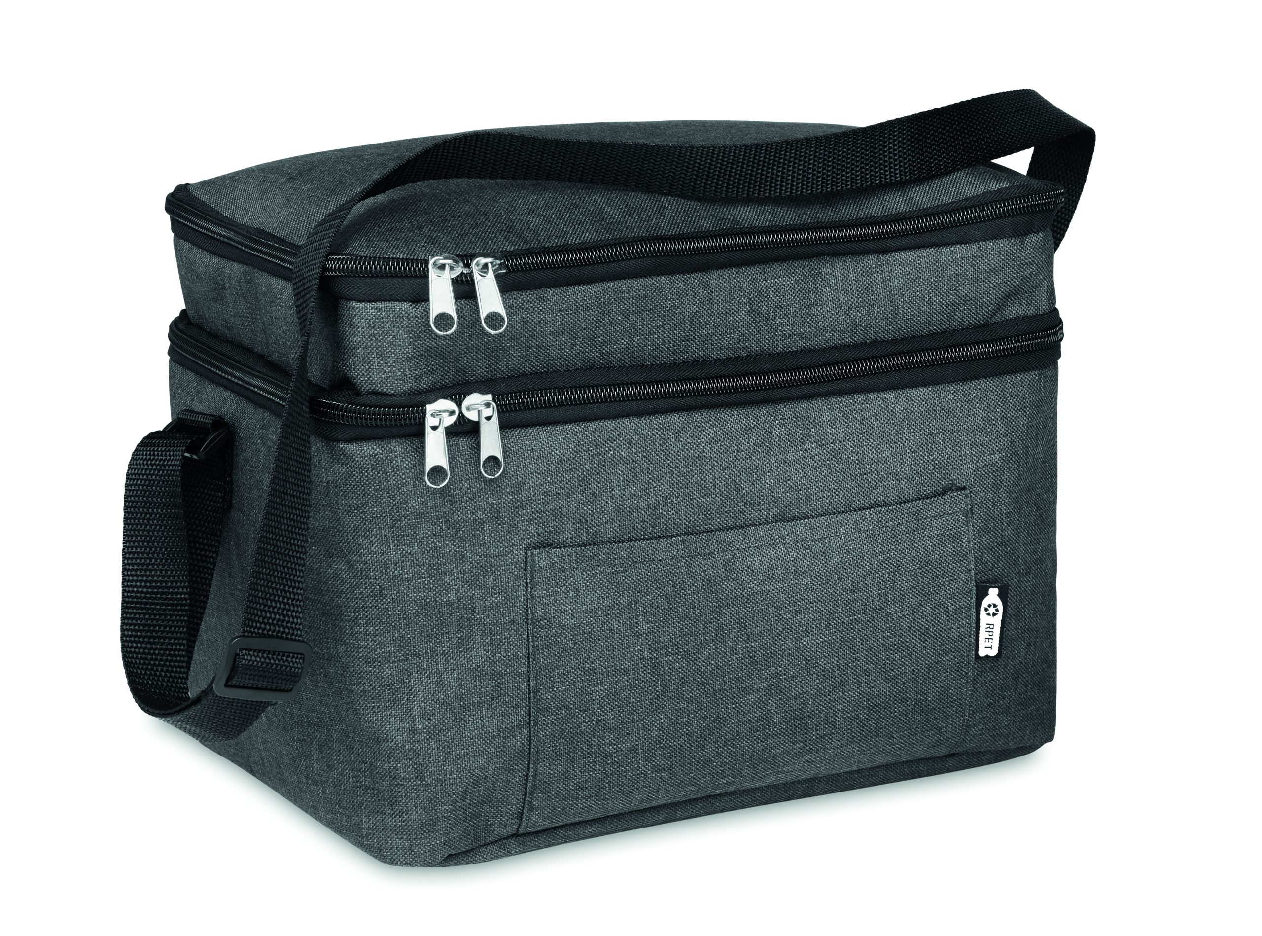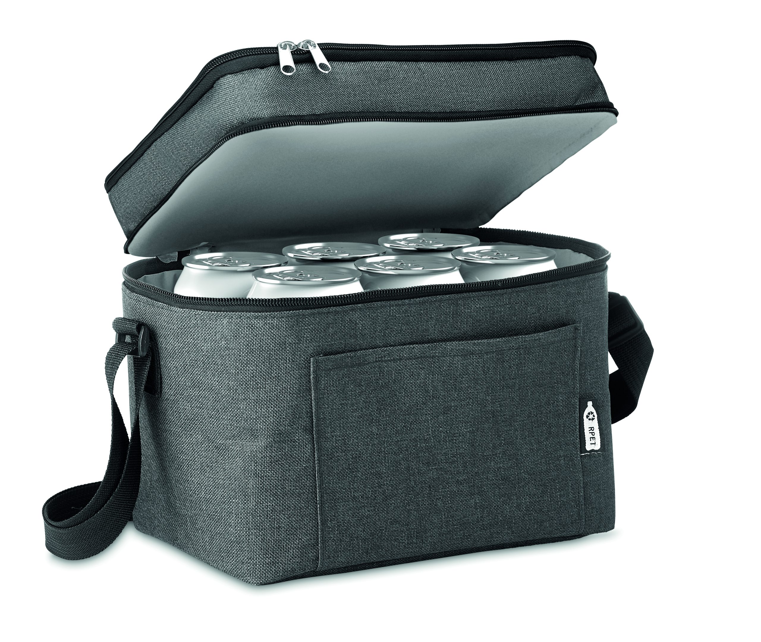 Torba termoizolacyjna w 2 odcieniach 600D RPET z 2 przegrodami. Regulowany pasek na ramię, przednia kieszeń. Materiał izolacyjny: PEVA 0,15 mm + pianka 3 mm.