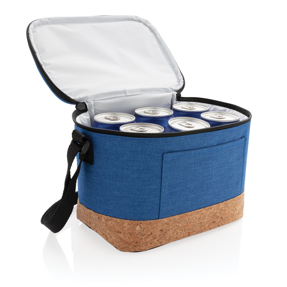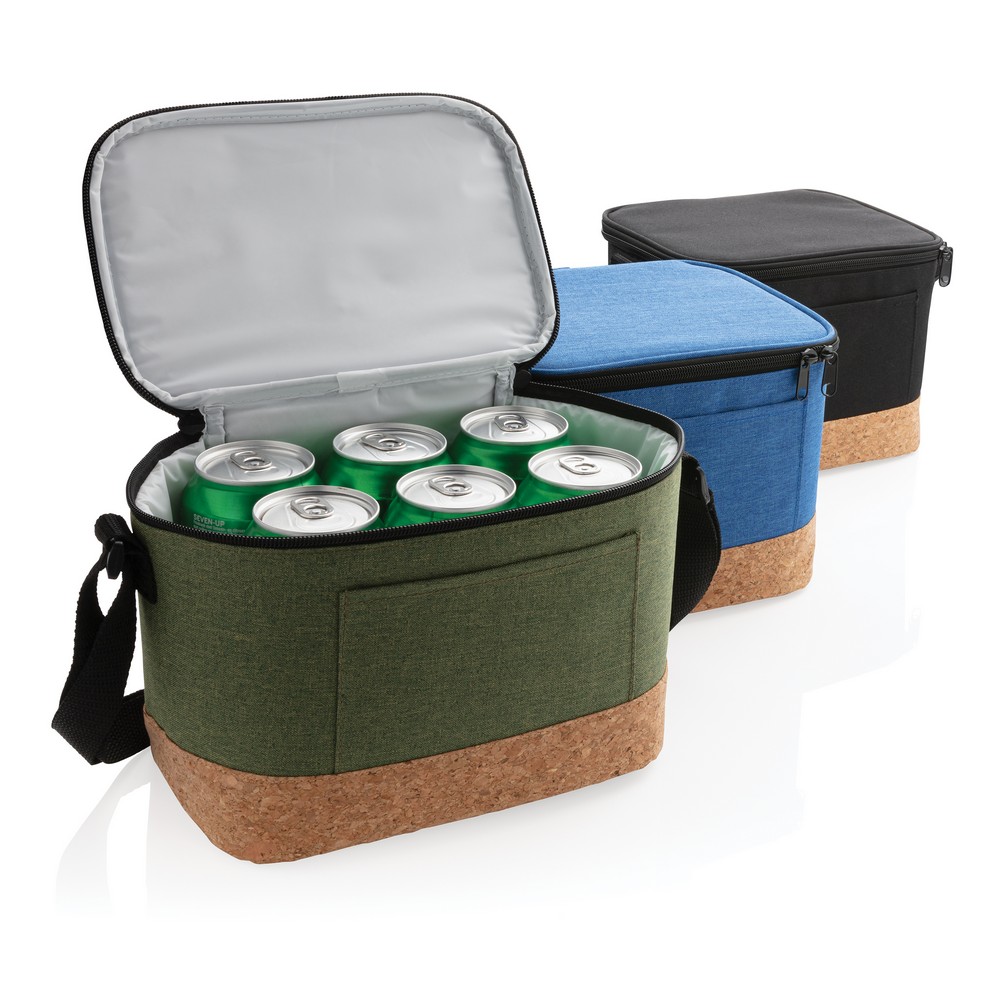 Torba termoizolacyjna, korkowe wykończenie, przegroda główna zamykana na zamek błyskawiczny, kieszeń z przodu, pojemność torby do 6 puszek 0,33 l, pasek na ramię w komplecie, ślad węglowy produktu: 1,67 kg CO2