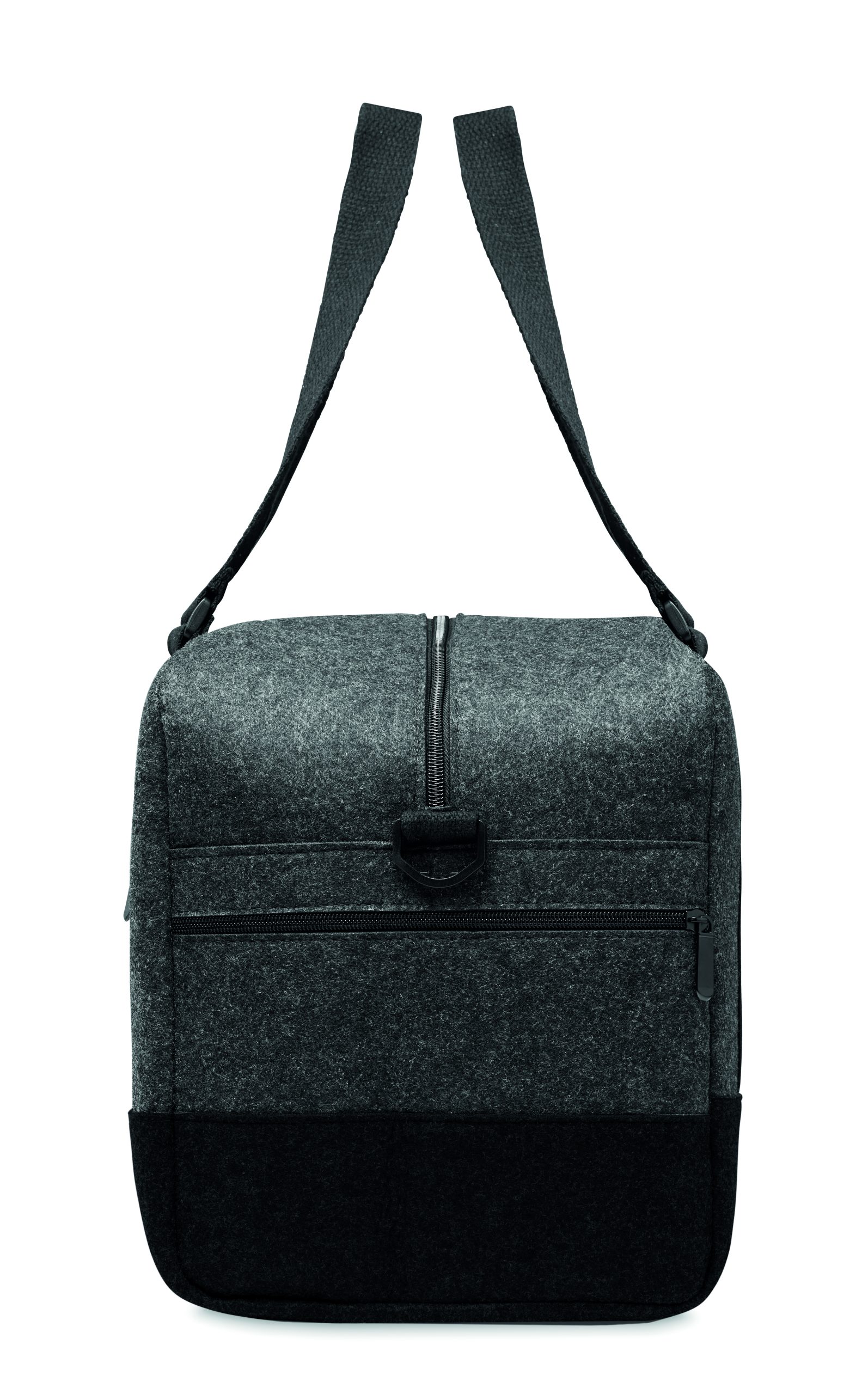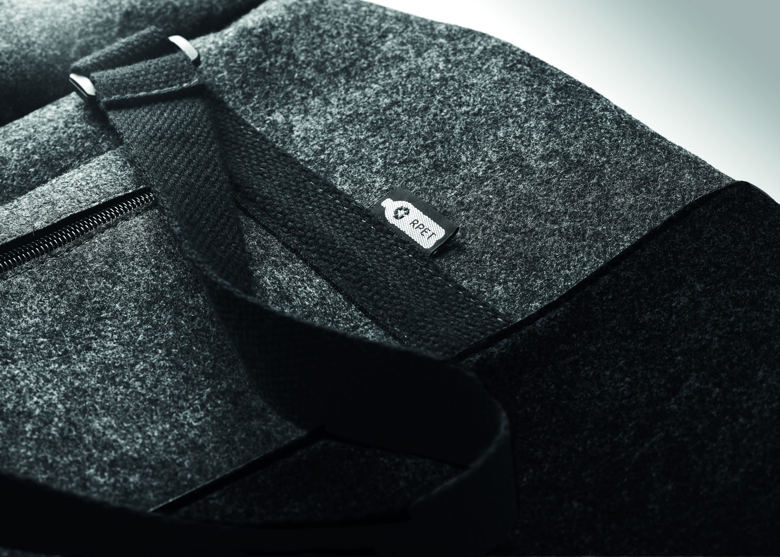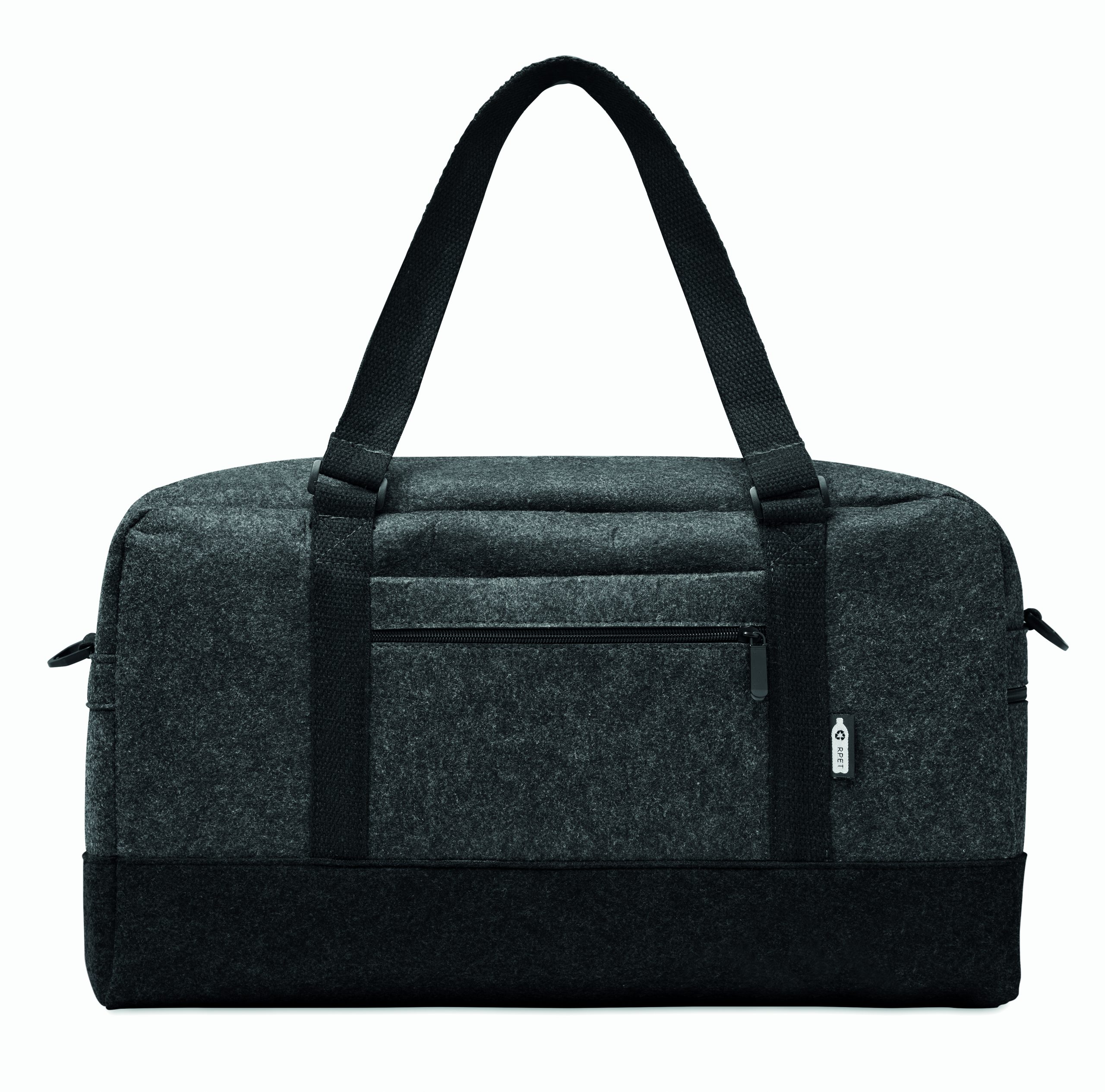 Torba sportowa/fitness lub weekendowa z filcu RPET z przednią kieszenią zapinaną na zamek błyskawiczny, płóciennymi uchwytami i odpinanym, regulowanym paskiem na ramię.