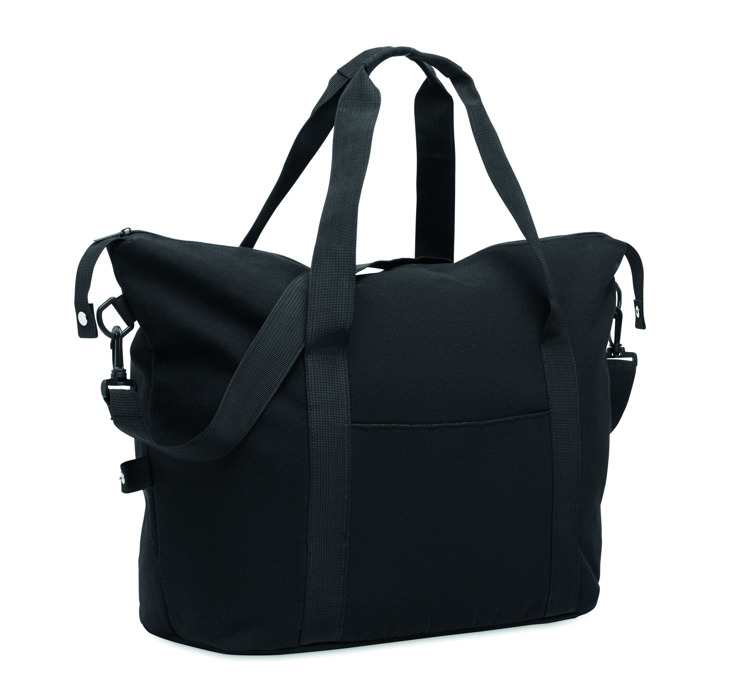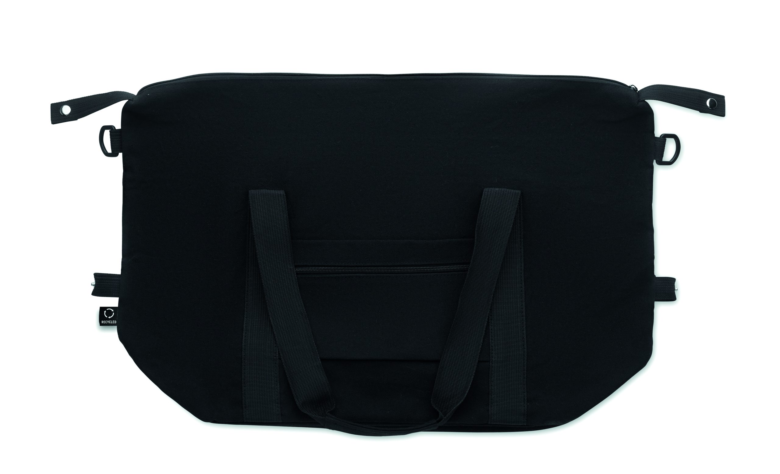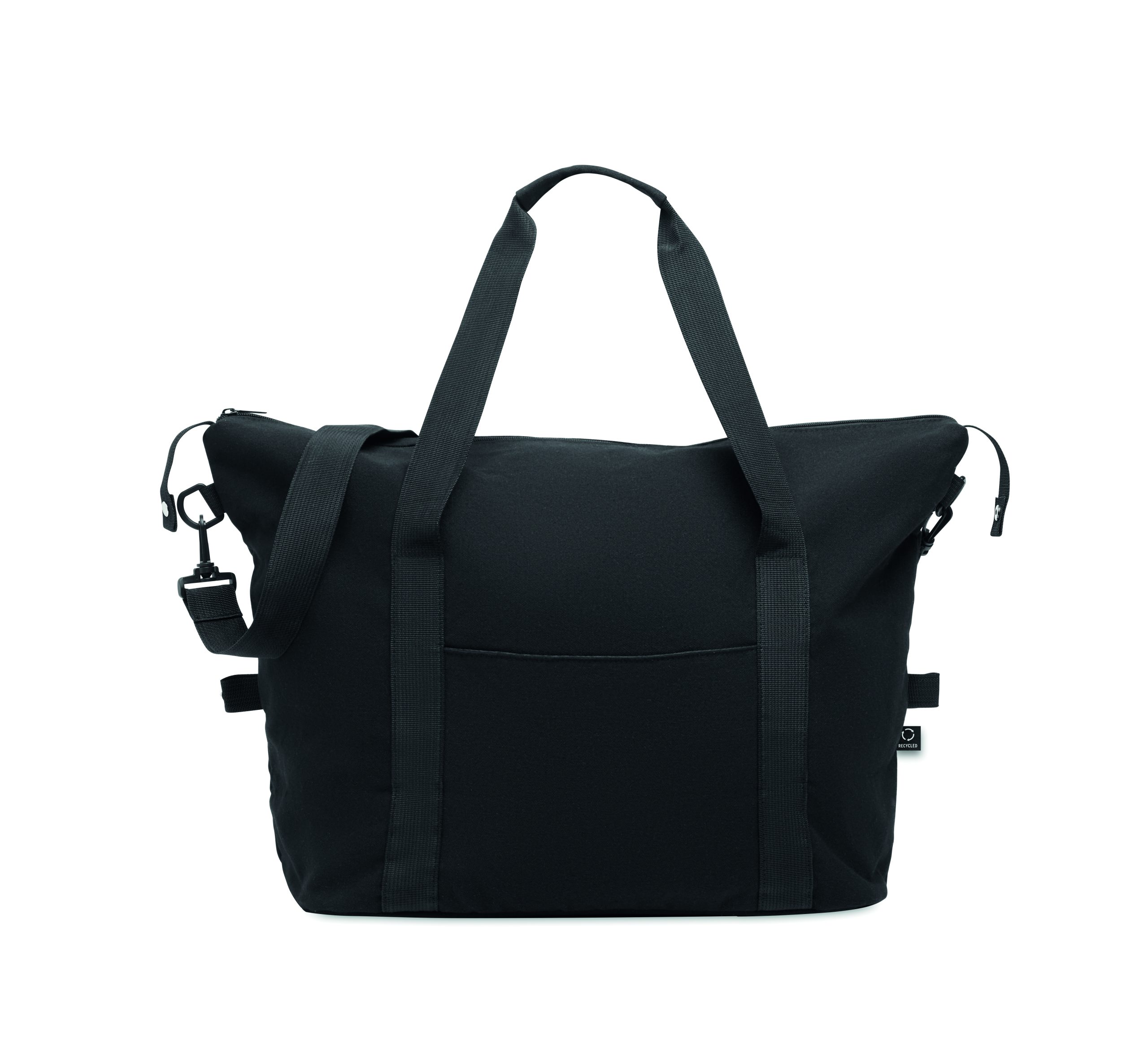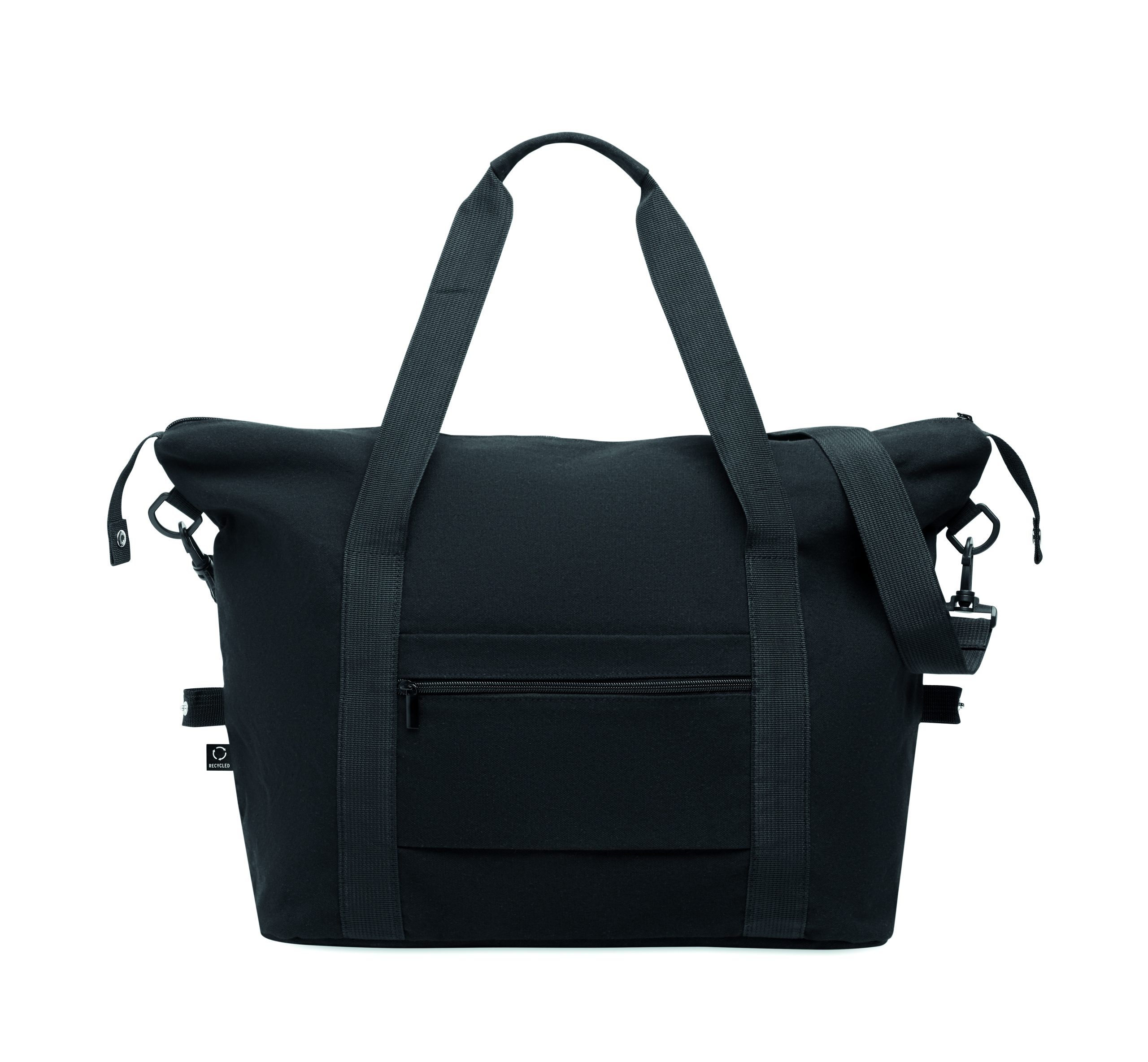 Torba weekendowa z bawełny z recyklingu i poliestru z recyklingu (70%/30%) z podszewką z poliestru 210D RPET. Posiada przednią kieszeń wsuwaną, tylną kieszeń zapinaną na zamek, odpinany i regulowany pasek na ramię oraz wyściełane dno, pasek na walizkę.