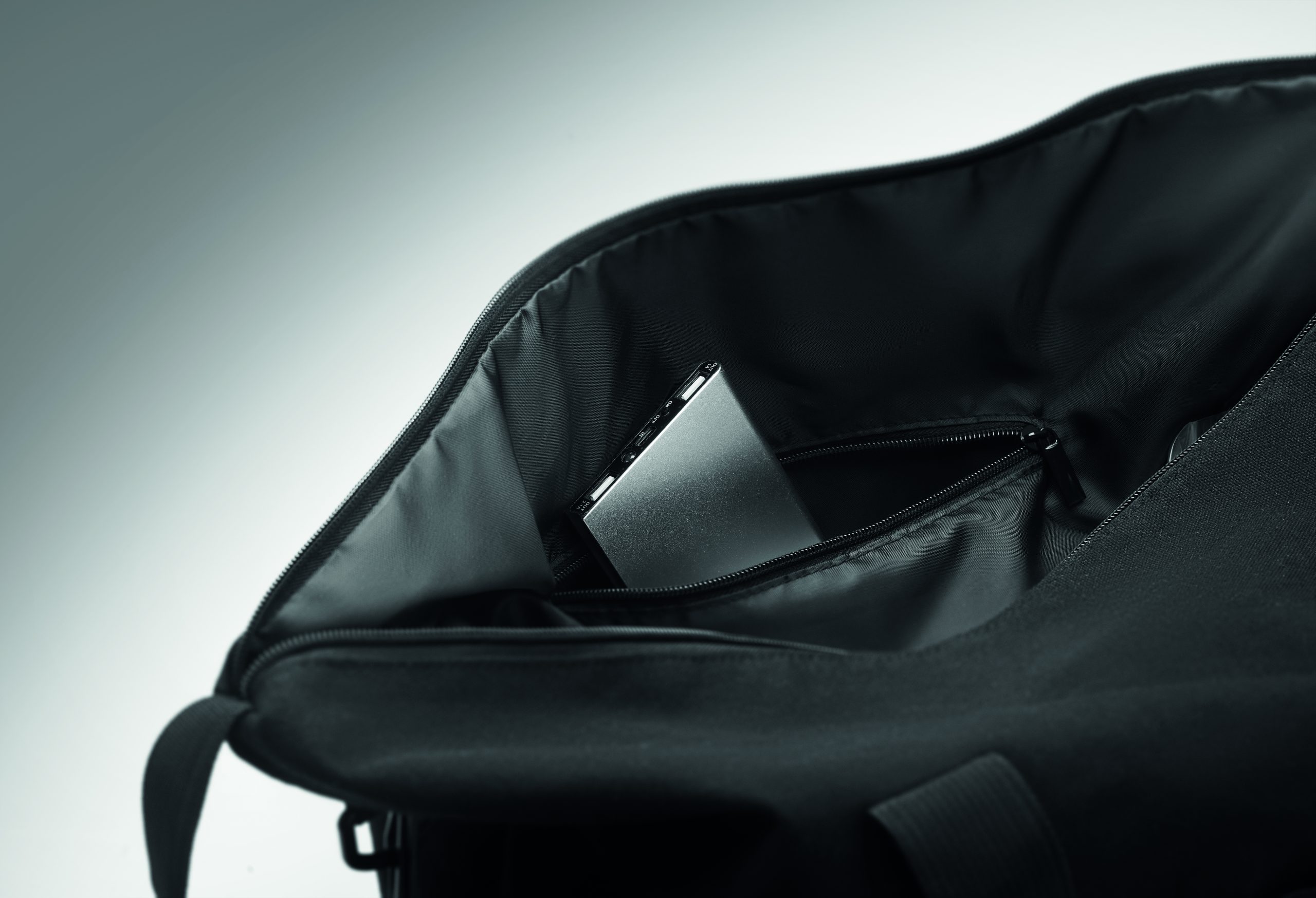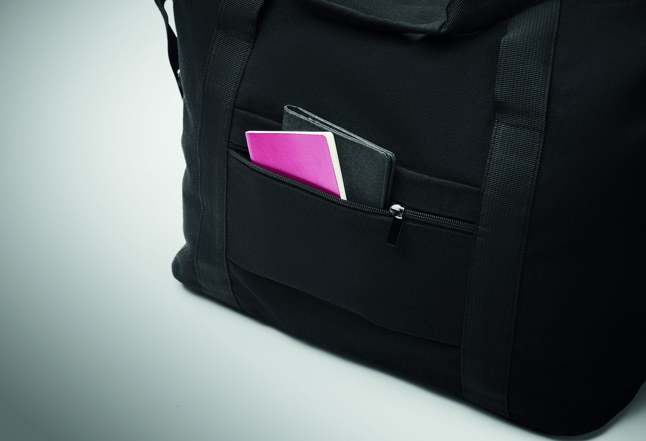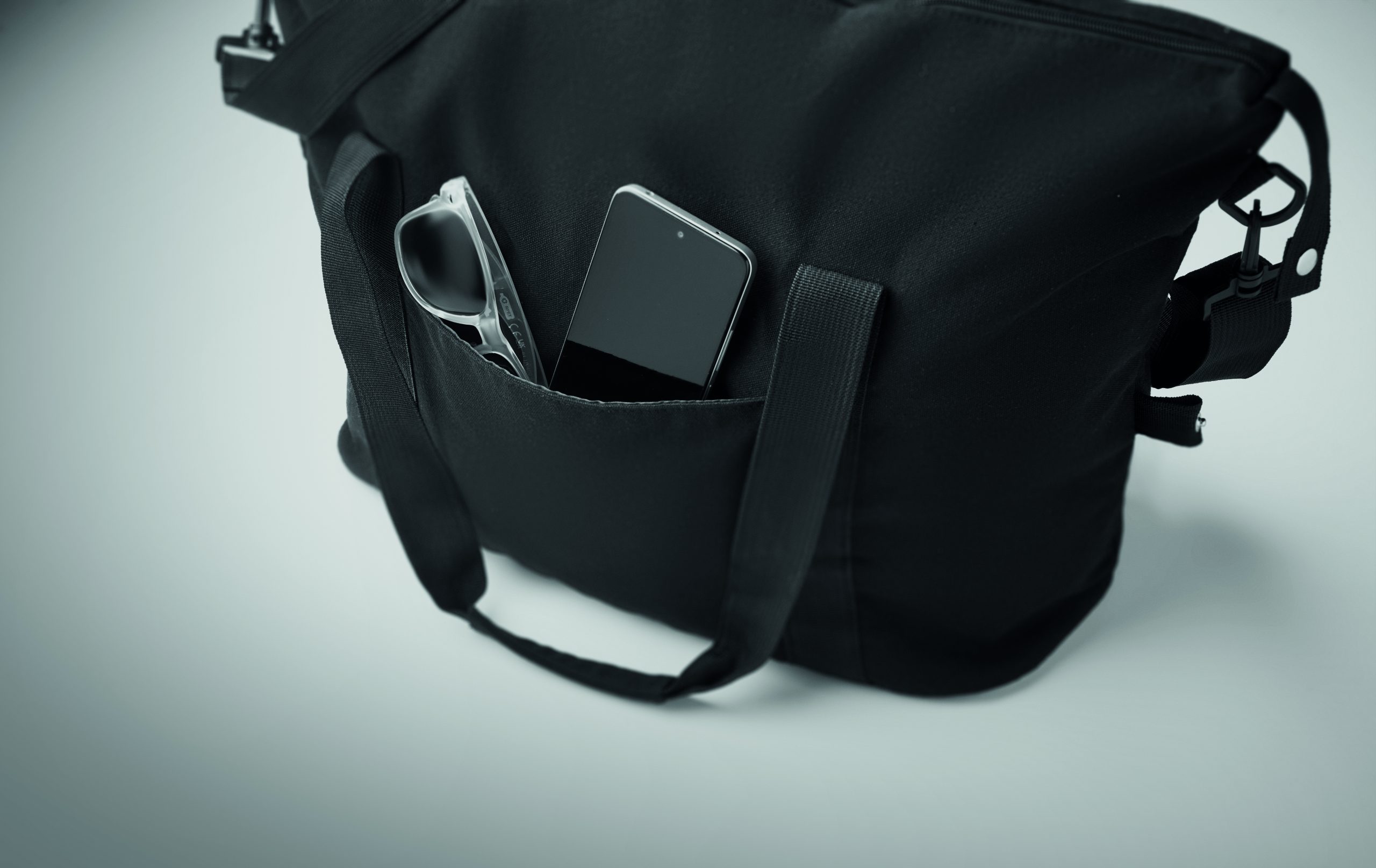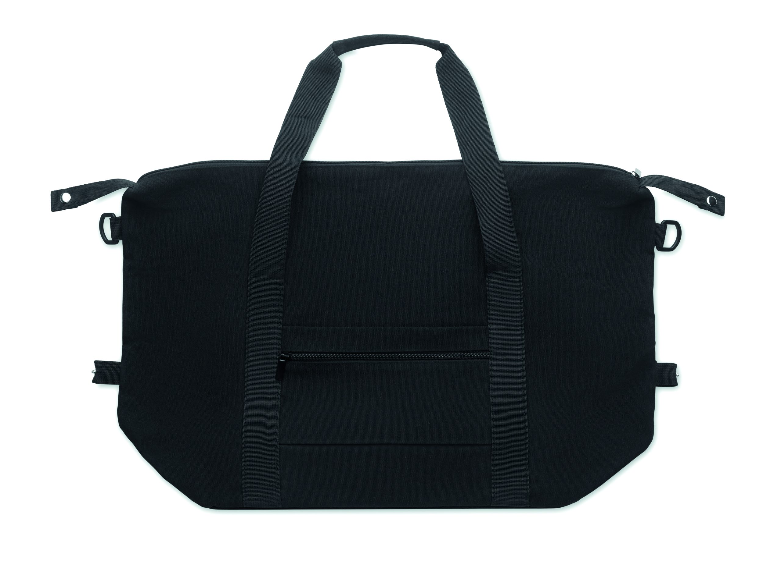 Torba weekendowa z bawełny z recyklingu i poliestru z recyklingu (70%/30%) z podszewką z poliestru 210D RPET. Posiada przednią kieszeń wsuwaną, tylną kieszeń zapinaną na zamek, odpinany i regulowany pasek na ramię oraz wyściełane dno, pasek na walizkę.