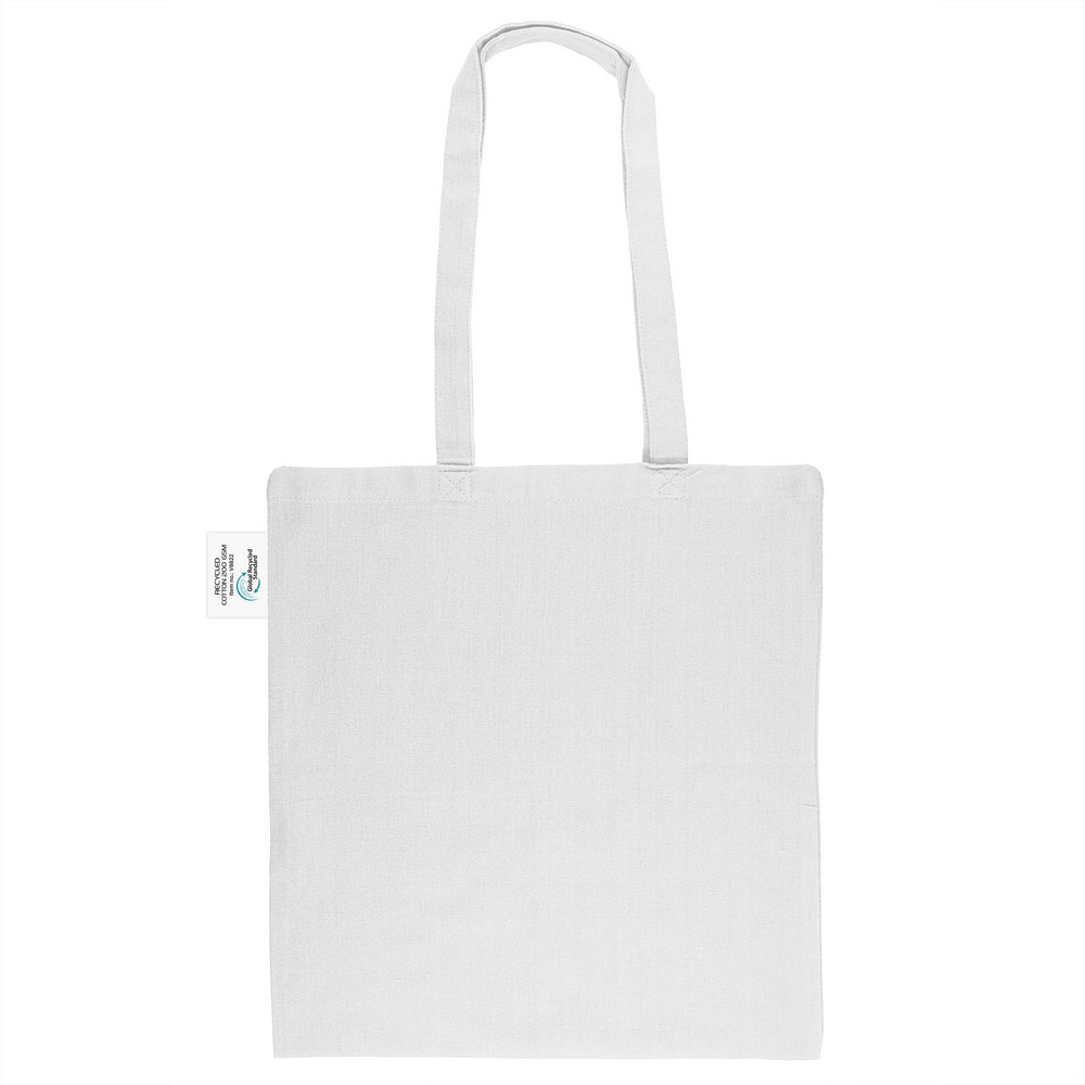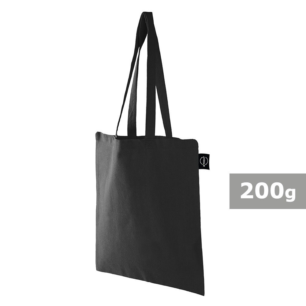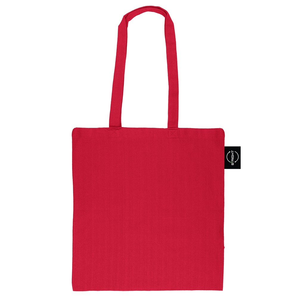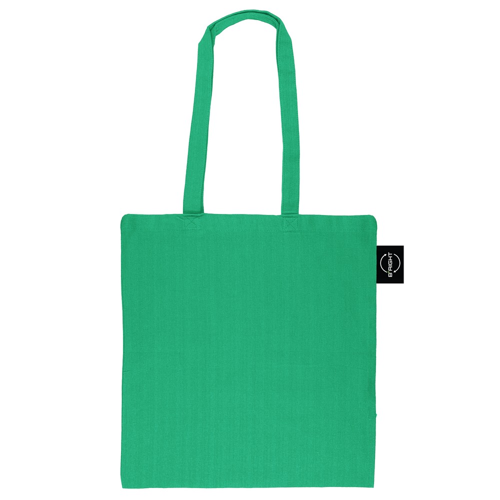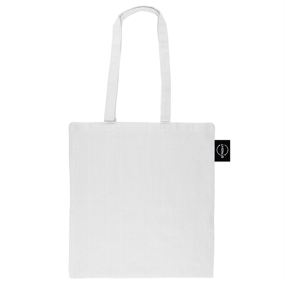 Torba na zakupy B’RIGHT, posiada długie uchwyty umożliwiające noszenie na ramieniu, produkt wykonany z bawełny z recyklingu o gramaturze 200 g/m² i poliestru z recyklingu, zgodna z certyfikatem GRS (Global RecycIed Standard)