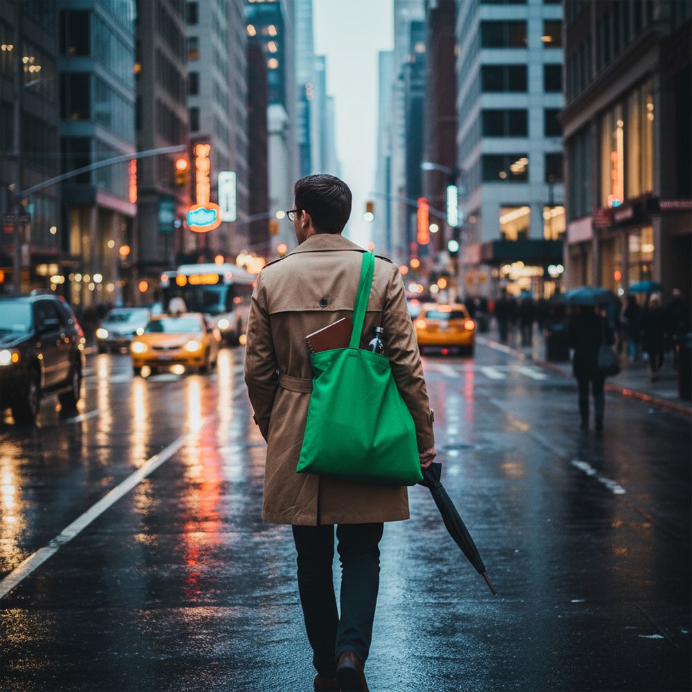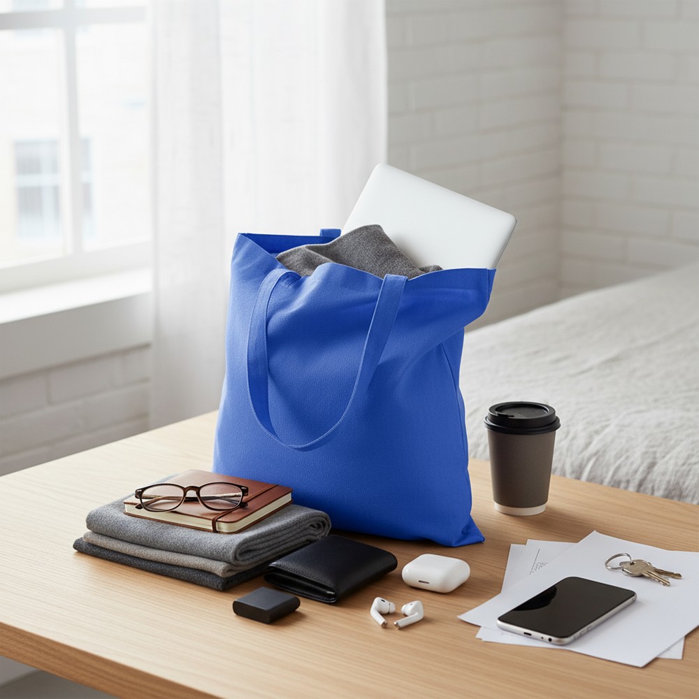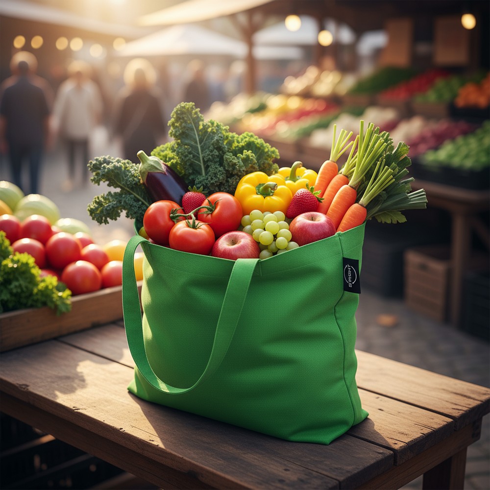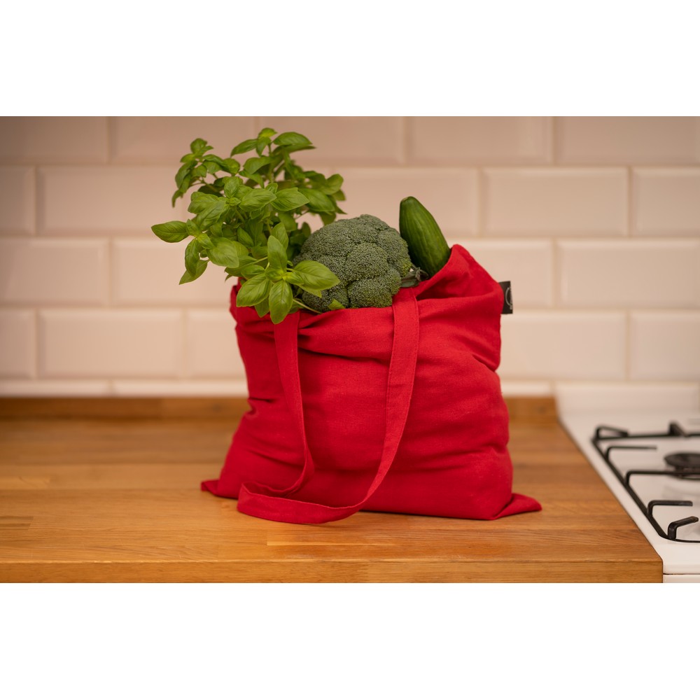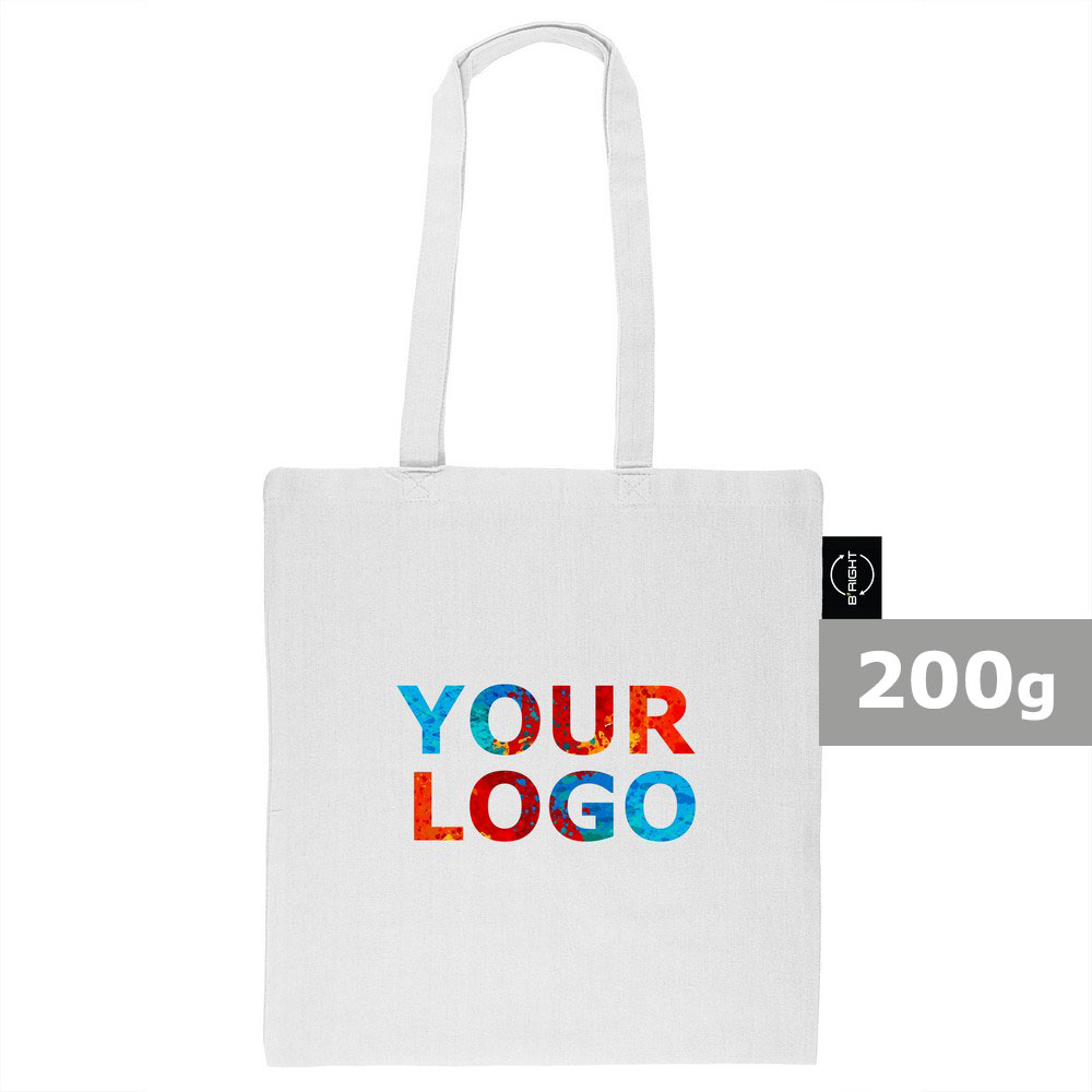 Torba na zakupy B’RIGHT, posiada długie uchwyty umożliwiające noszenie na ramieniu, produkt wykonany z bawełny z recyklingu o gramaturze 200 g/m² i poliestru z recyklingu, zgodna z certyfikatem GRS (Global RecycIed Standard)